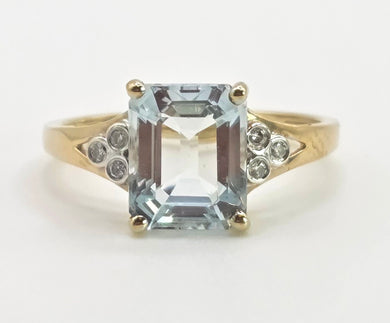 2609: Vintage 9ct Gold Emerald cut Blue Aquamarine Diamonds Ring