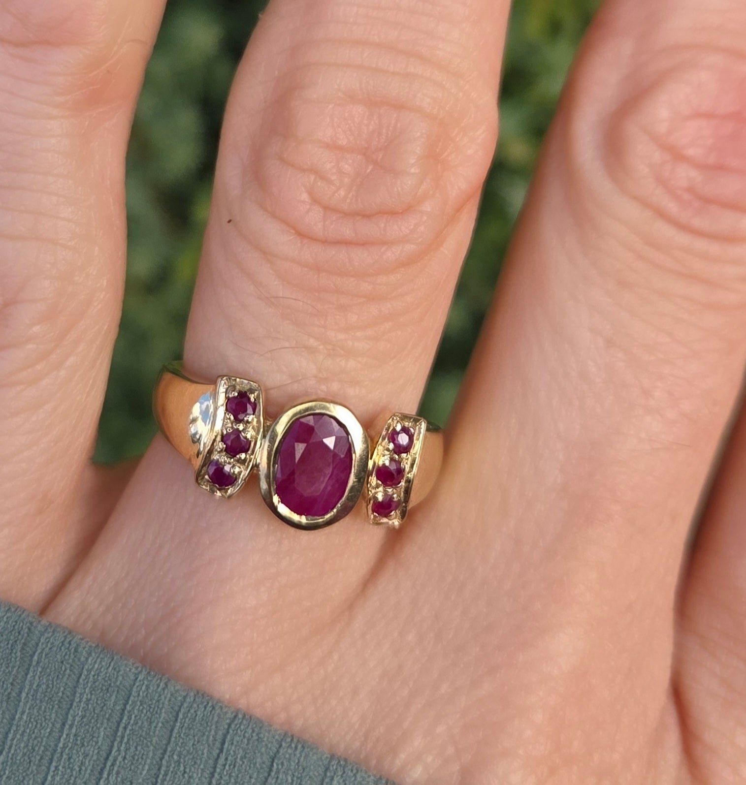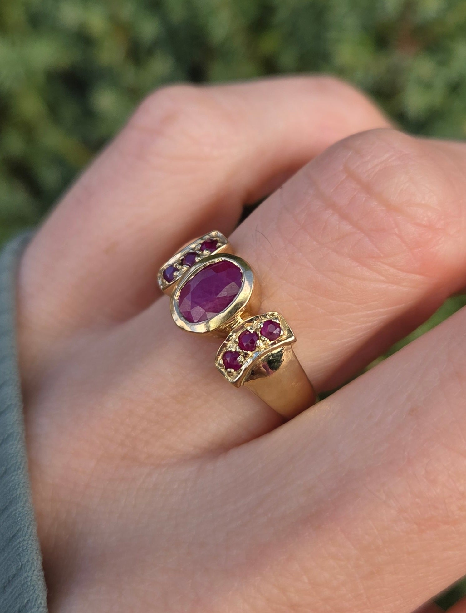 6249 Vintage: 9ct Gold 7 Rubies Geometric Set Ring