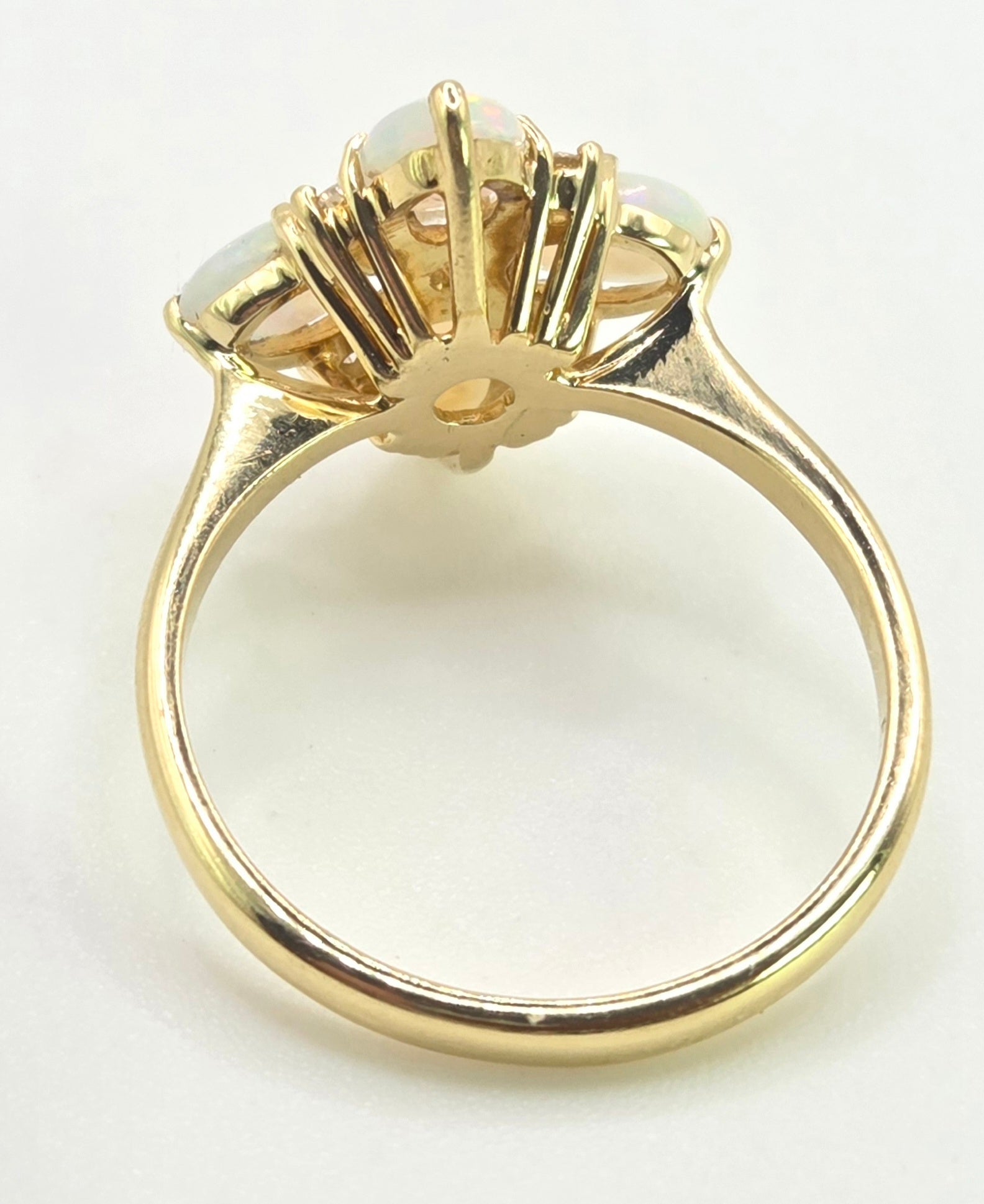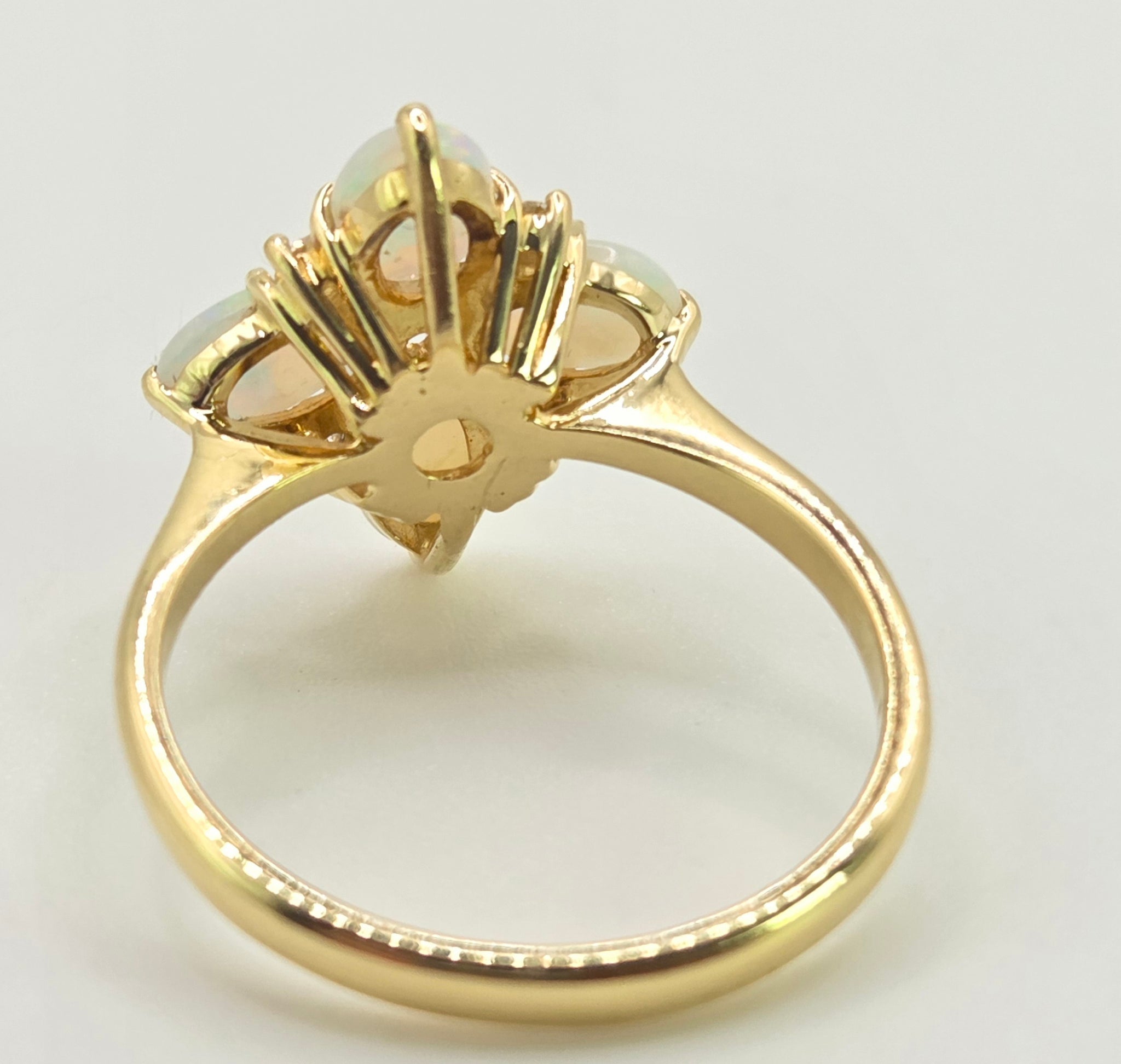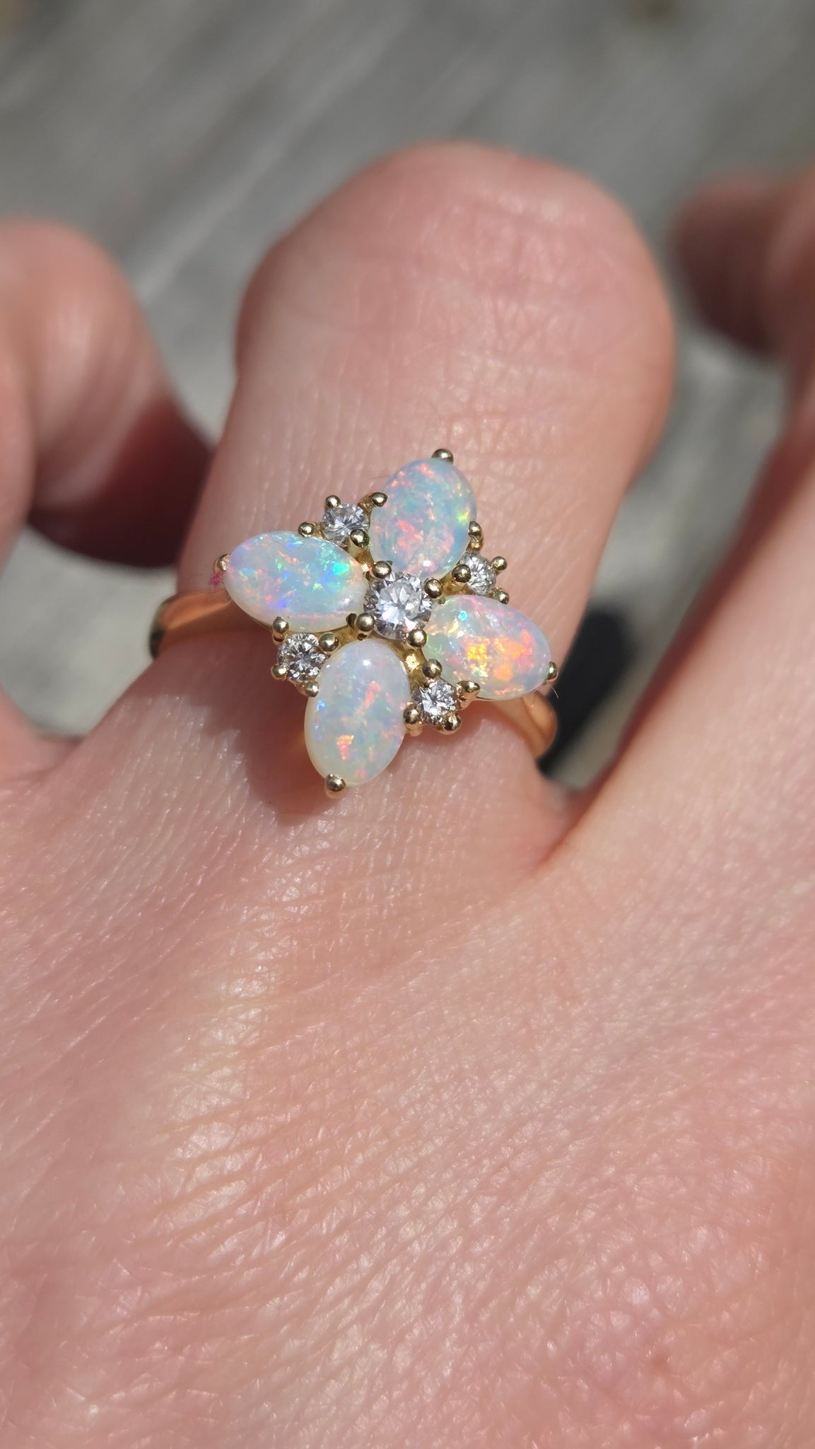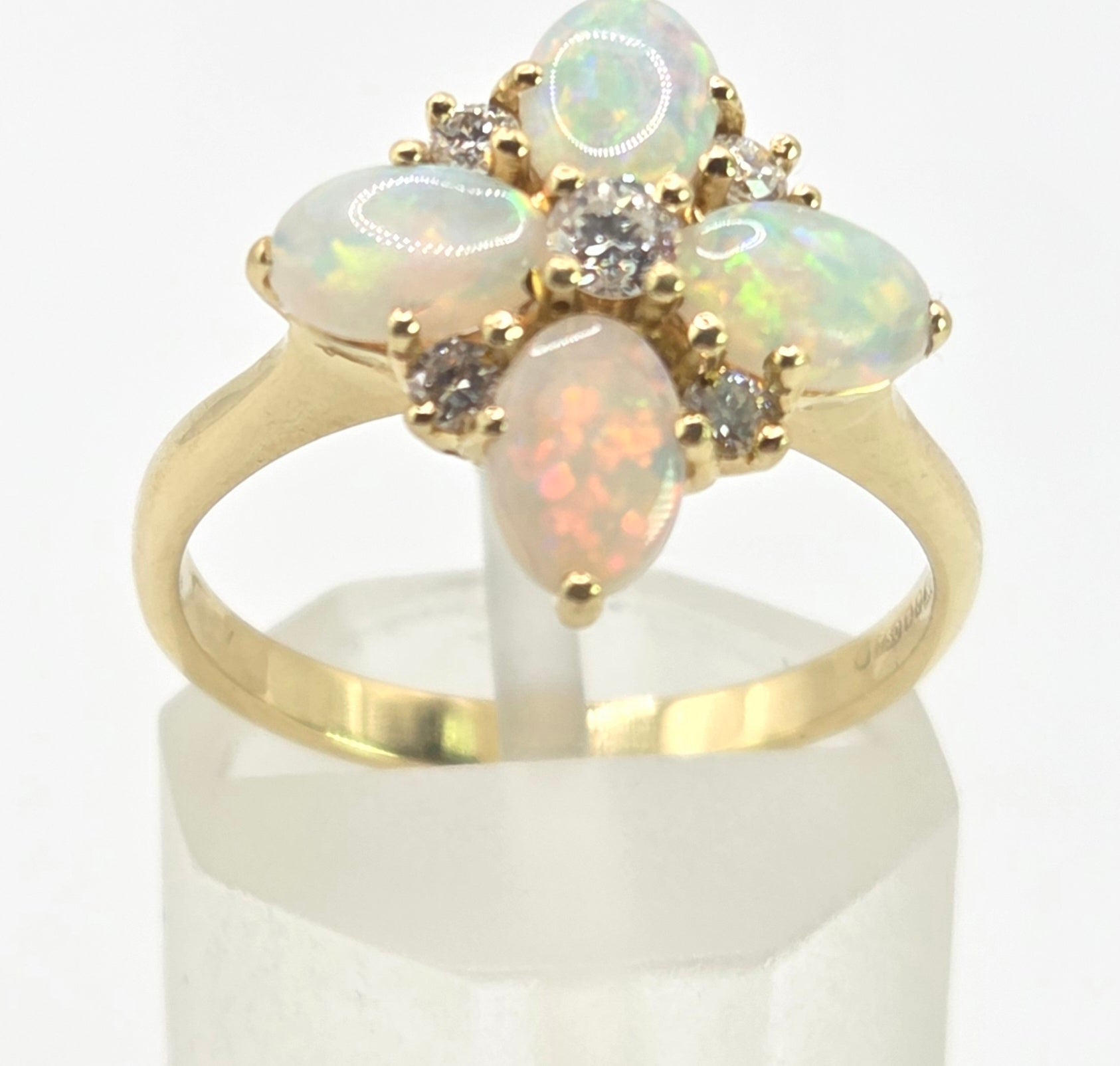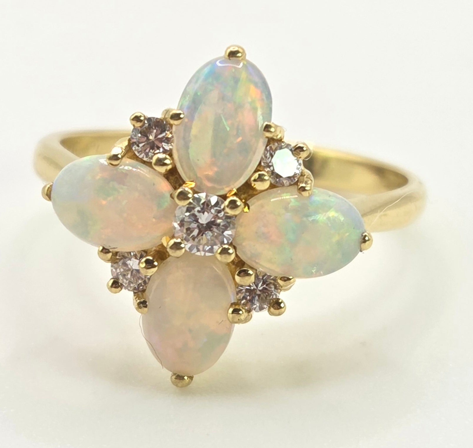 2778: Vintage 18ct Gold White Opals Diamonds Flower Head Ring-From 1988