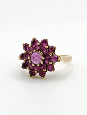 1836: Vintage; 9ct Gold 21 Rubies Flower Head Cocktail Ring- From 1979