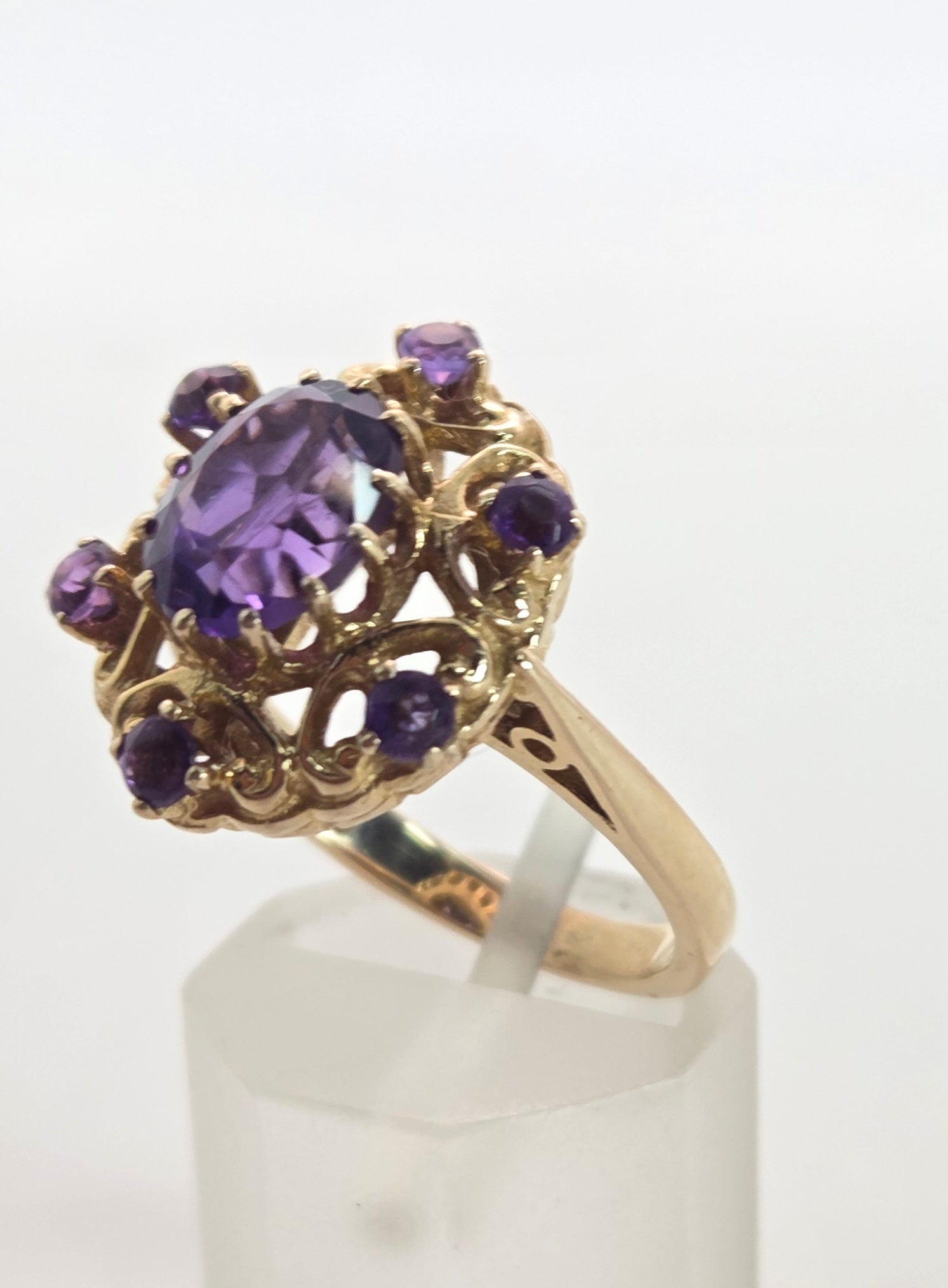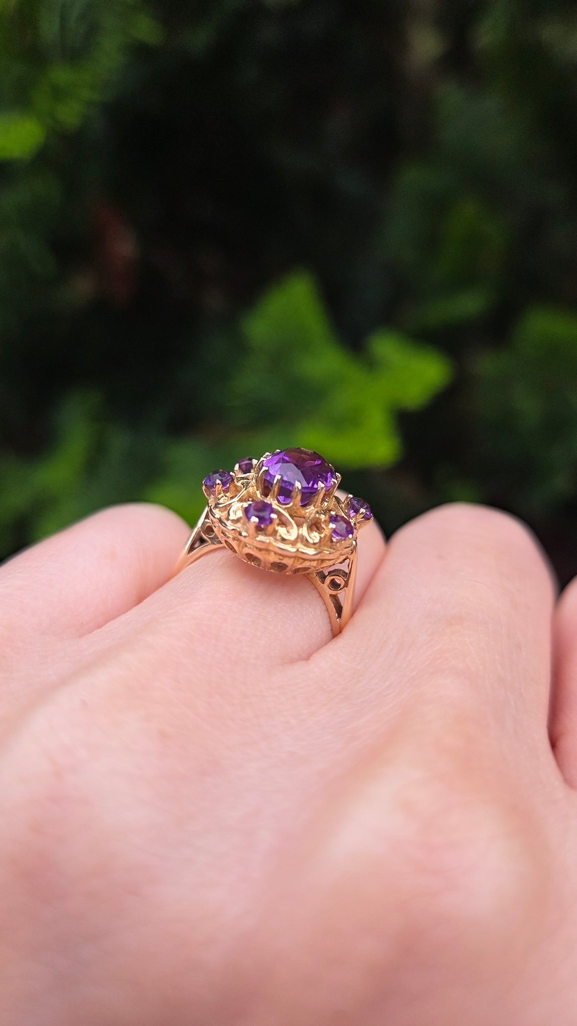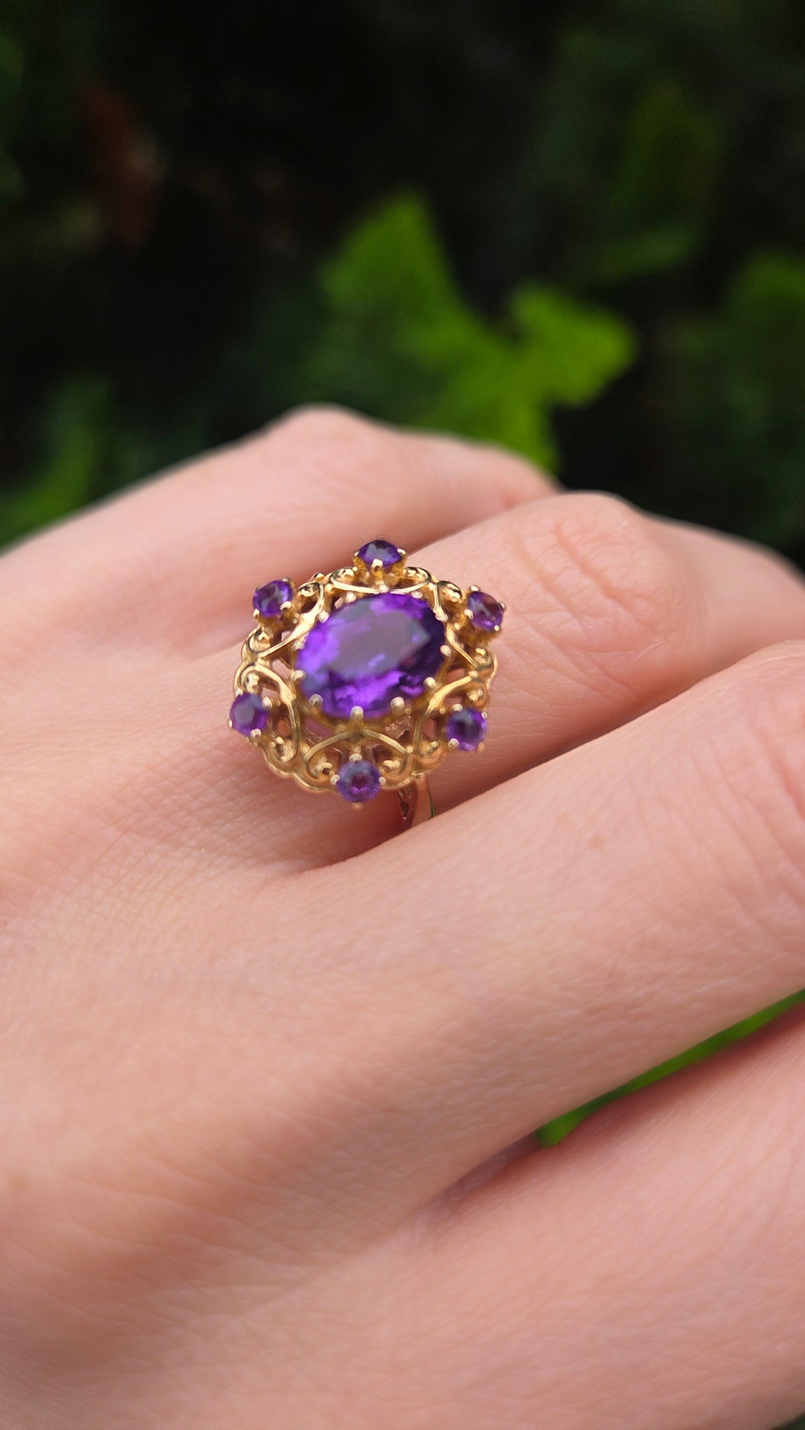 2437: Vintage: Statement 9ct Gold Openwork Amethysts Openwork Ring- From 1975