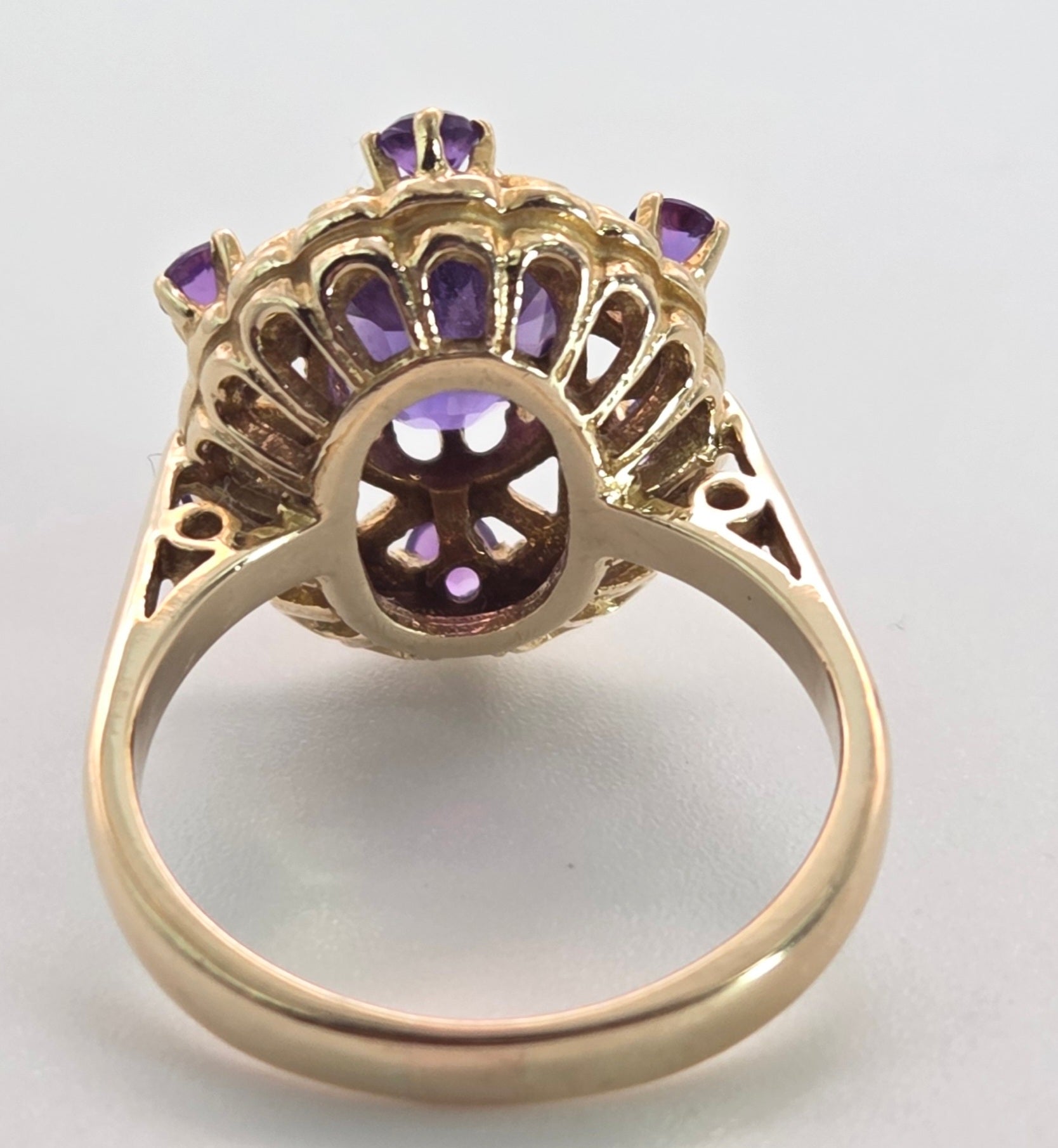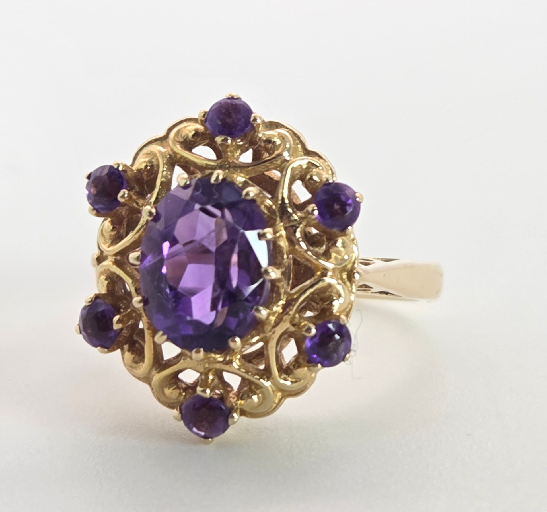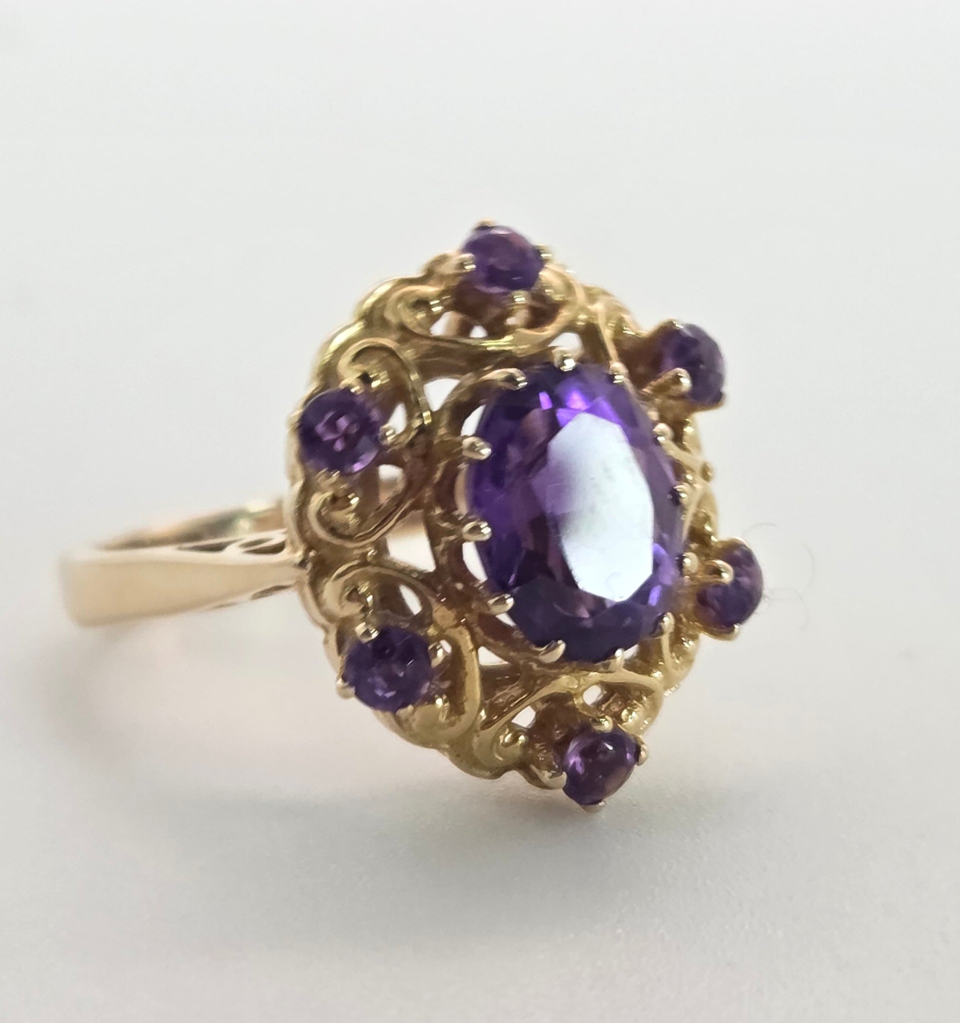 2437: Vintage: Statement 9ct Gold Openwork Amethysts Openwork Ring- From 1975