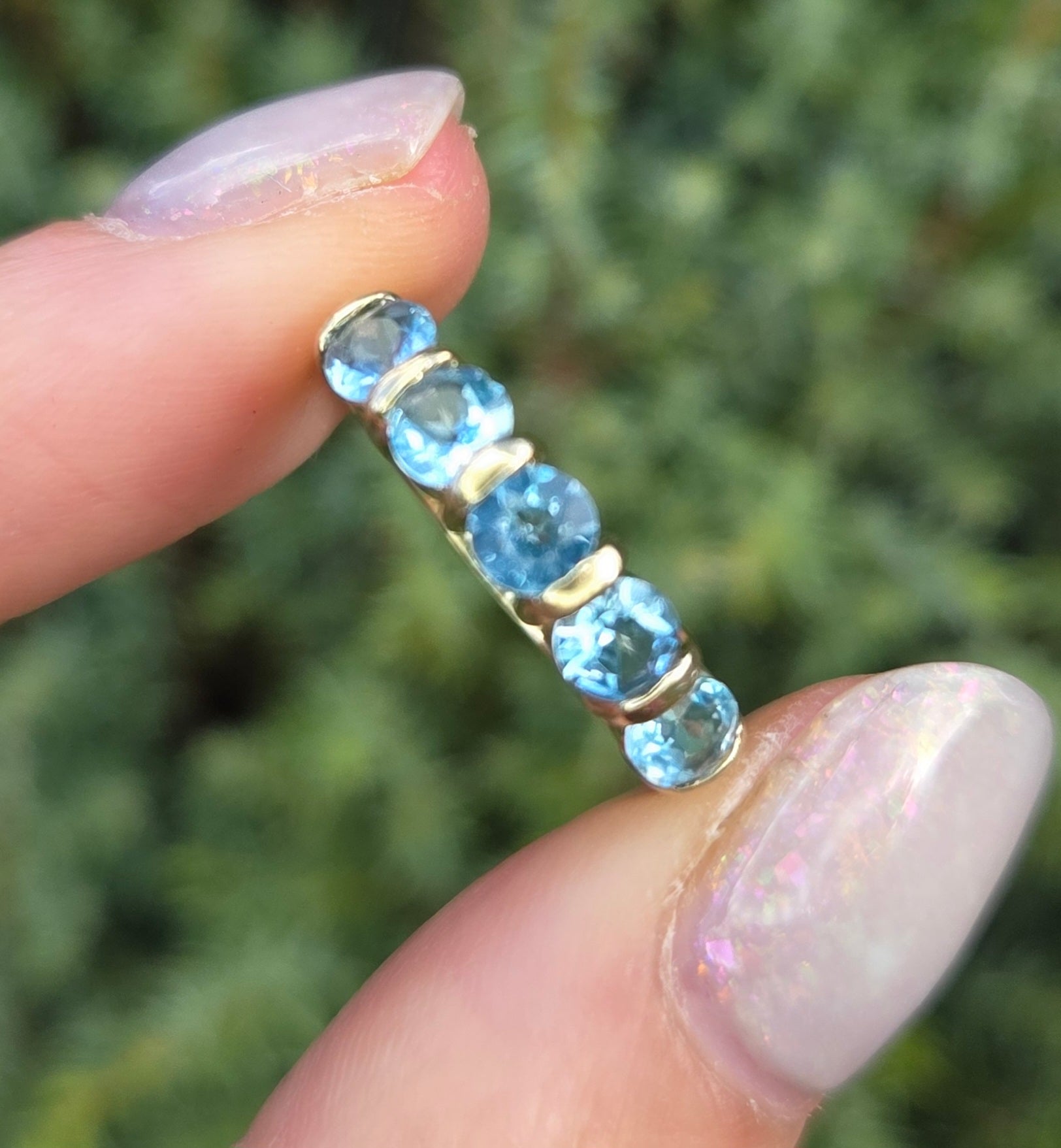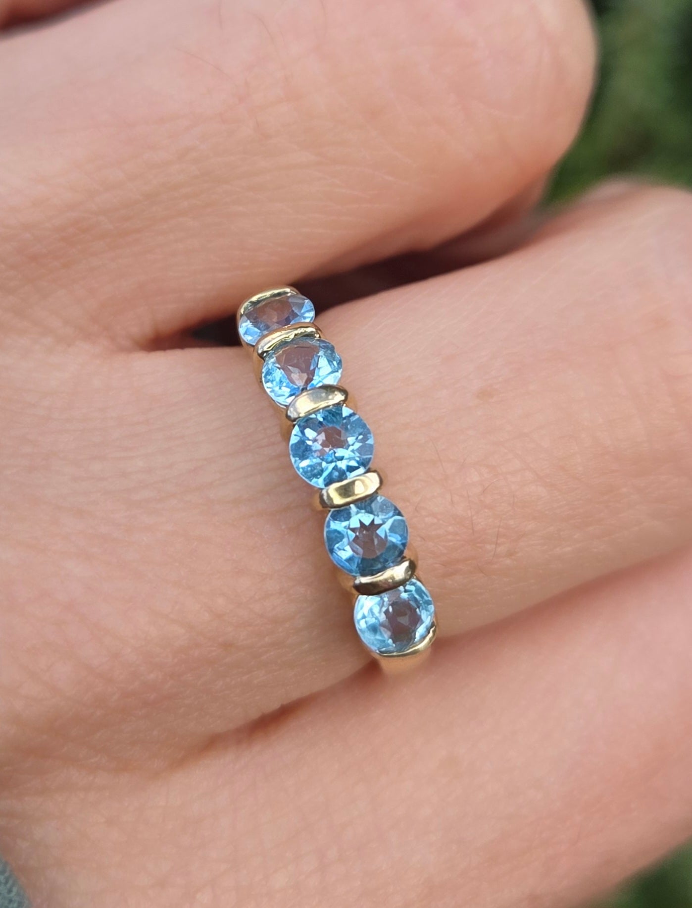 2230 Vintage: 9ct Gold 5 Swiss Blue Topaz Stacker/Half-Hoop Ring