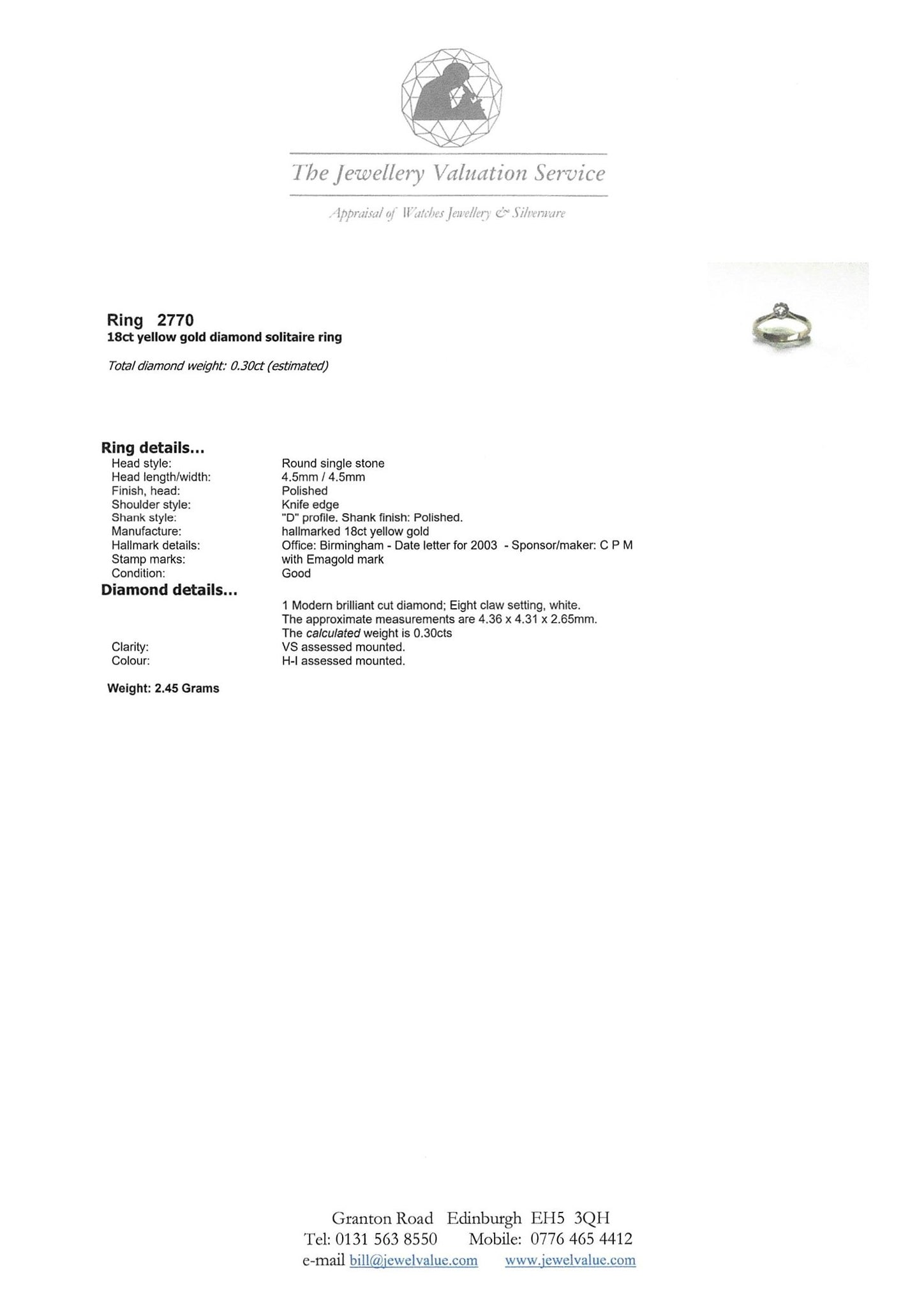 STOCK CODE: 2770- eternal design and high-calibre diamond. Supplied with an independent gemmologist content appraisal.