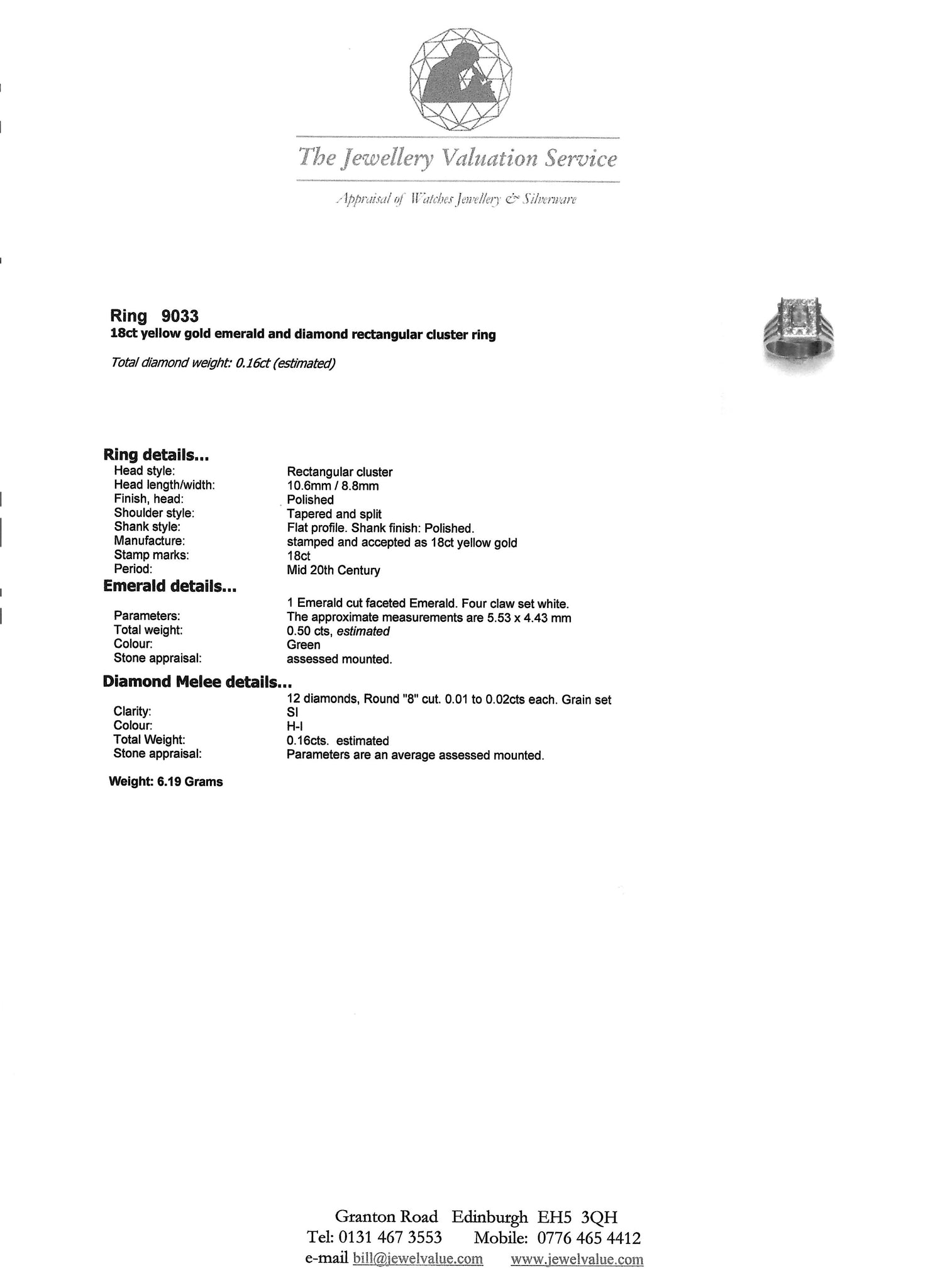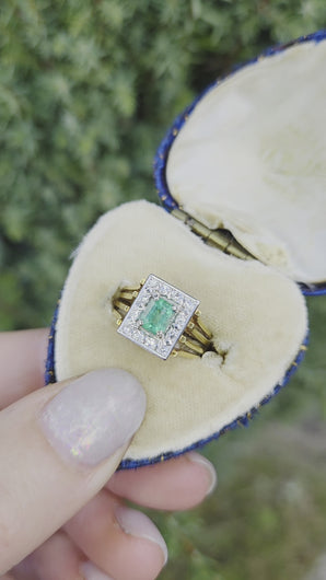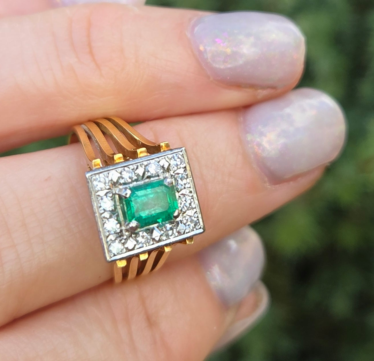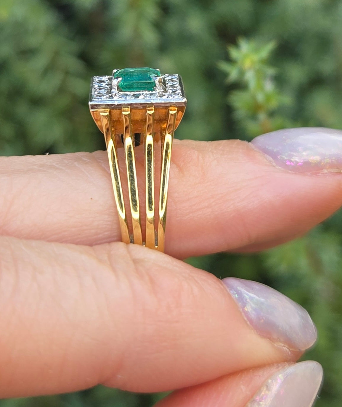 6273 Vintage 18ct Gold Emerald Cut Emerald 12 Diamonds Square Set Cocktail Ring