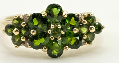 2534: Vintage; 9ct Gold 15 Green Diopsides Diamonds Cluster Ring