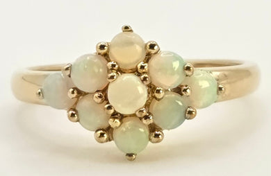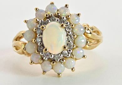 2564: Vintage 9ct Gold 15 White Opals 12 Diamonds Cluster Ring
