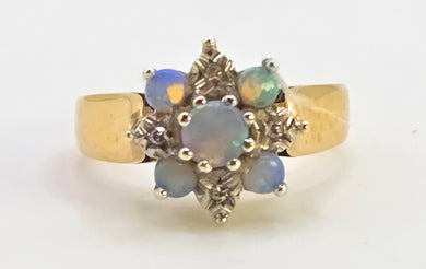 2158: Vintage: 9ct Gold 7 White Opals Diamonds Flower Head Ring- From 1981