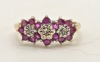 2591: Vintage 9ct Gold 17 Rubies Natural Diamonds Flower Head Ring