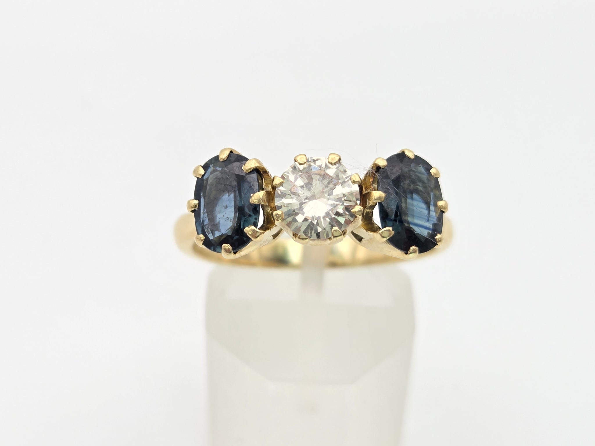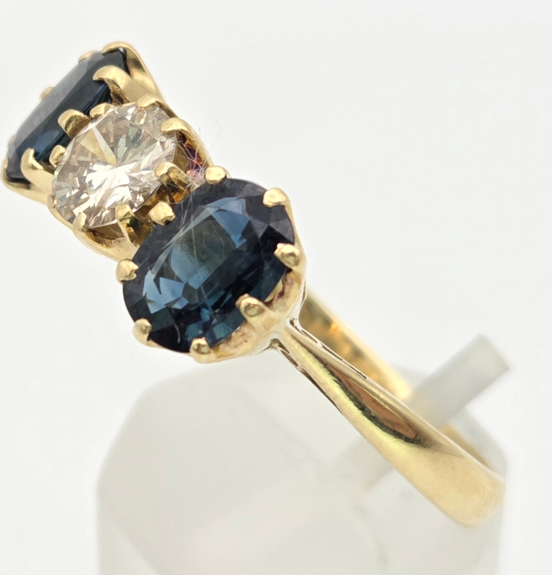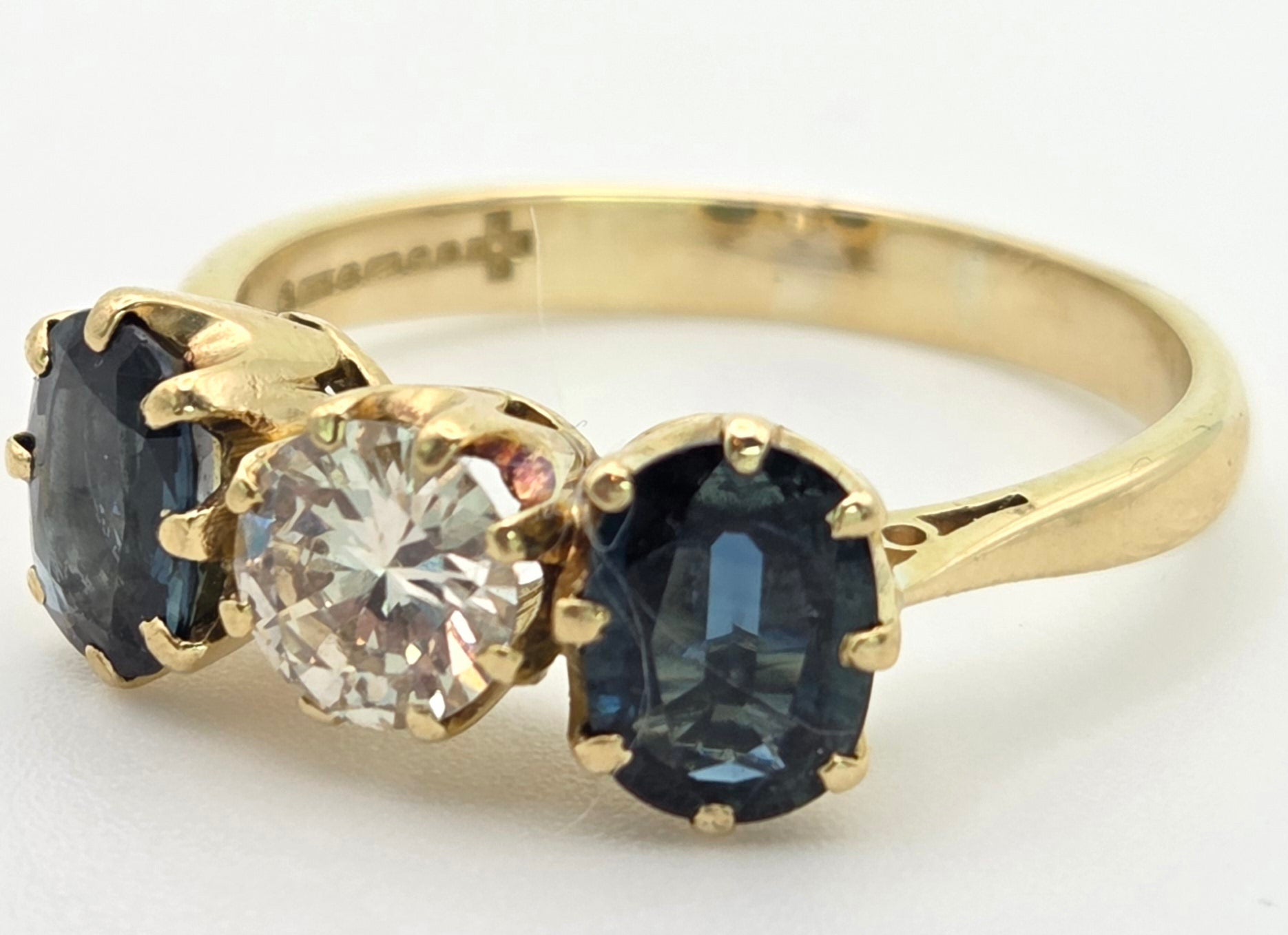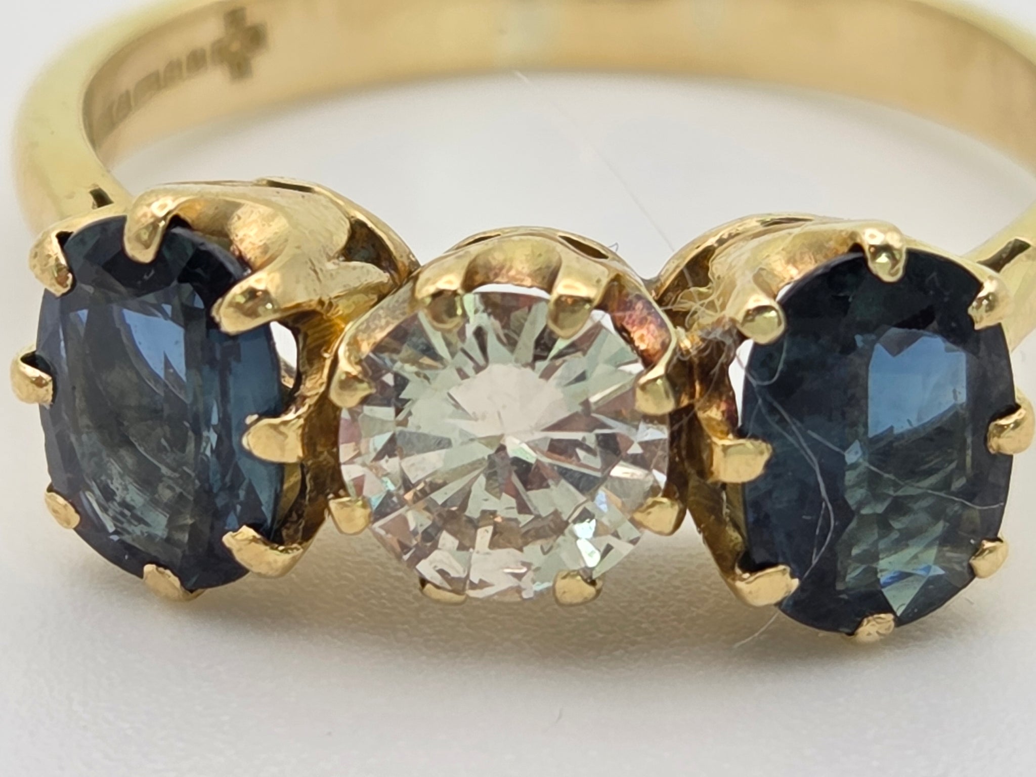 Rare to source such a substantial and potent 3-Stone ring. The diamond is 0.75ct and brilliant cut. Flanked by 2 x blue sapphires. All set in a robust and fine 18ct gold shank. Full UK hallmarks. A special ring. supplied with an independent gemmologist appraisal.