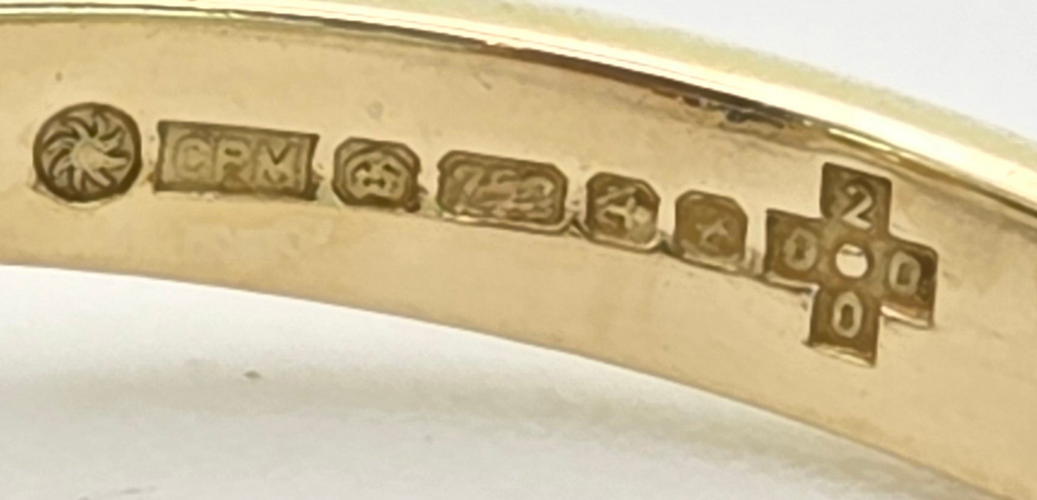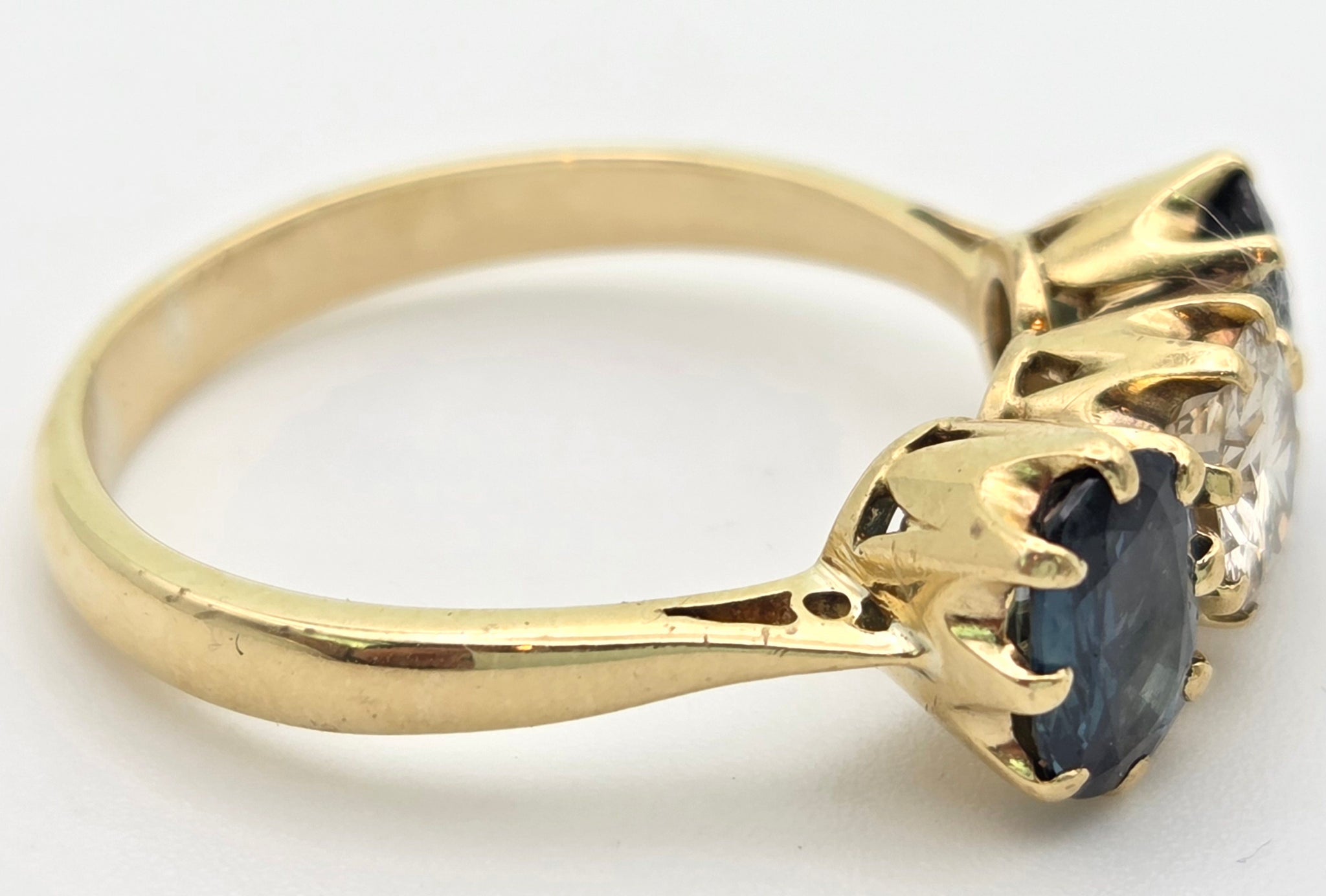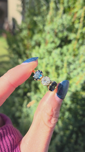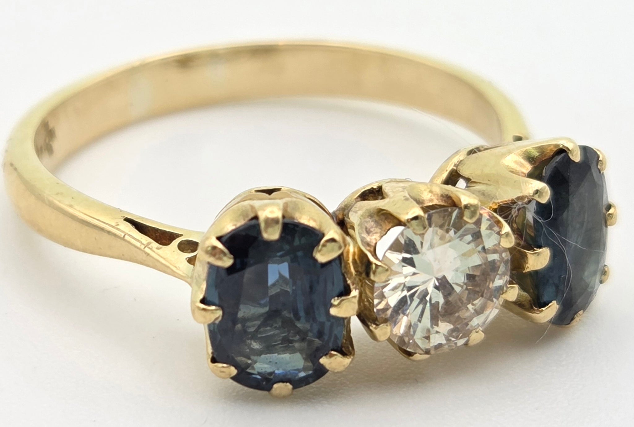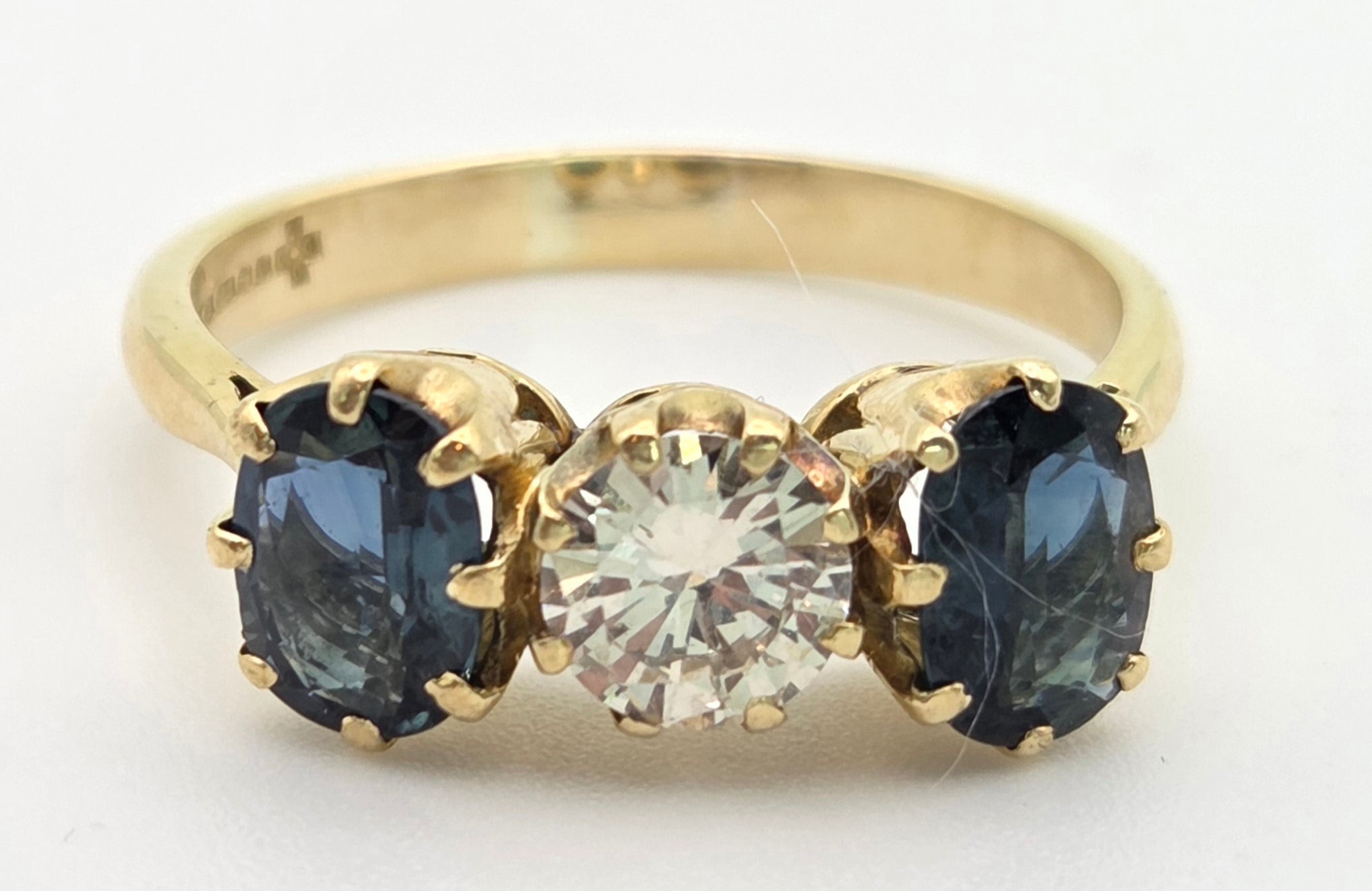 Rare to source such a substantial and potent 3-Stone ring. The diamond is 0.75ct and brilliant cut. Flanked by 2 x blue sapphires. All set in a robust and fine 18ct gold shank. Full UK hallmarks. A special ring. supplied with an independent gemmologist appraisal.