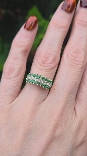 6331 Vintage: 14ct Gold 18 Emeralds Diamonds Tiered Dress/Stacker Ring
