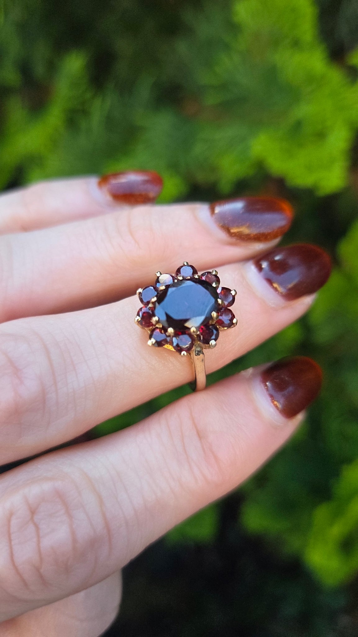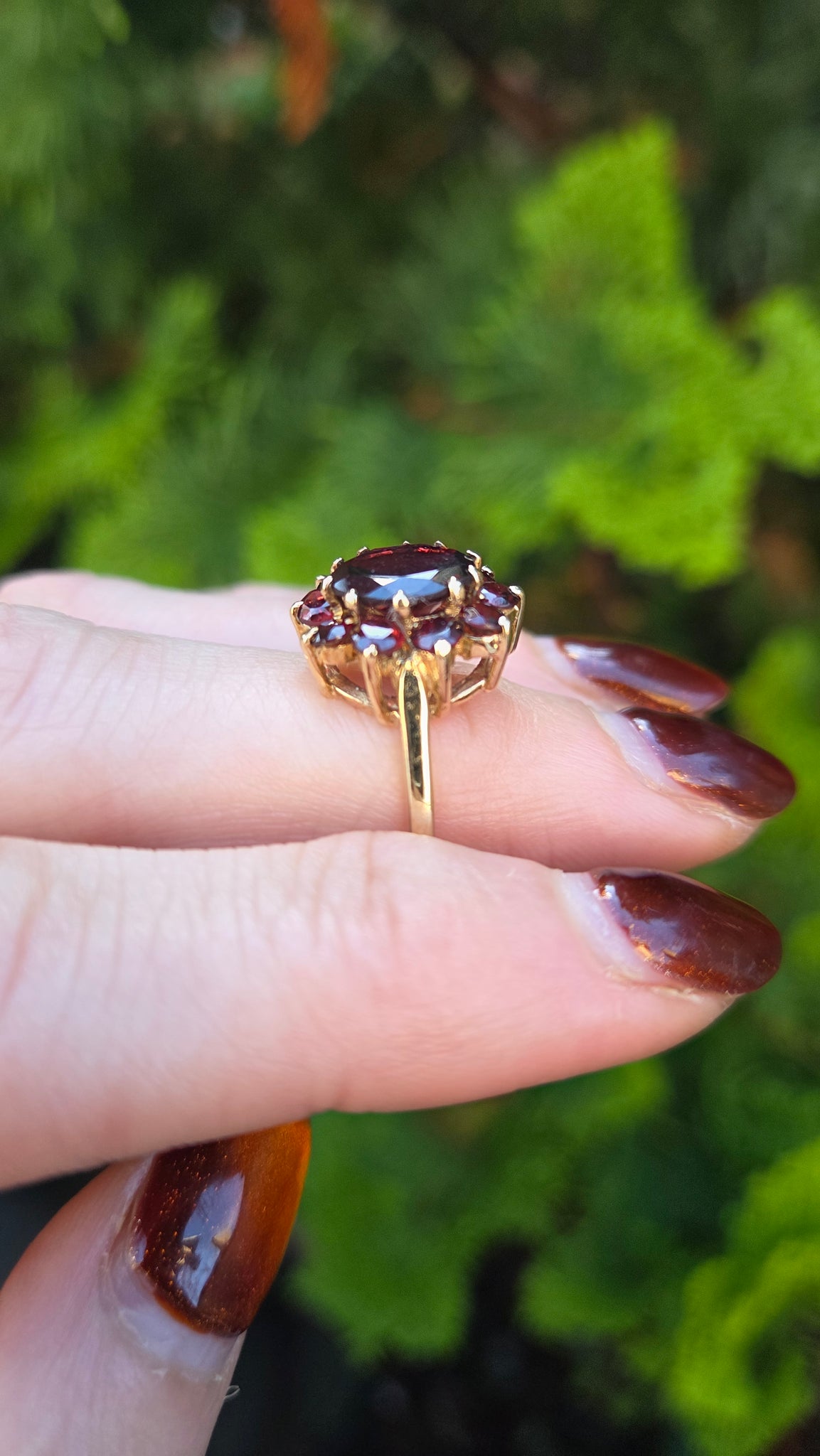 6298 Vintage: 9ct Gold 11 Rich Red Garnets Cluster Ring- From 1968