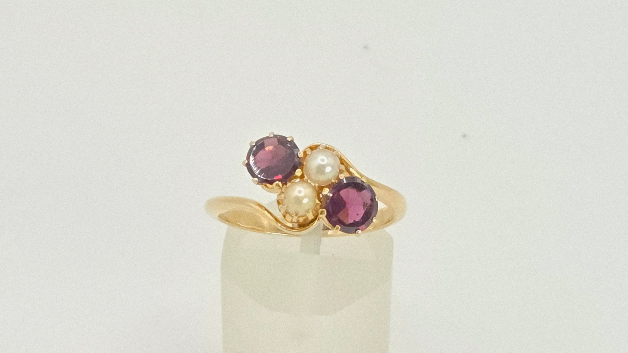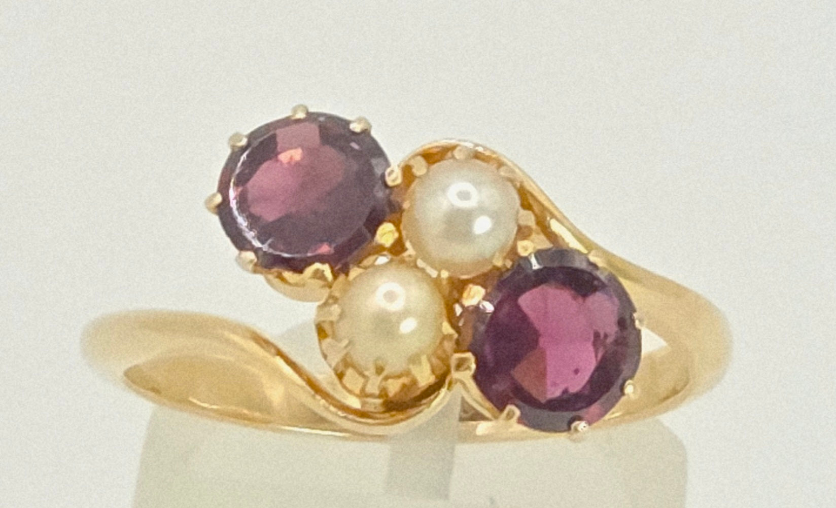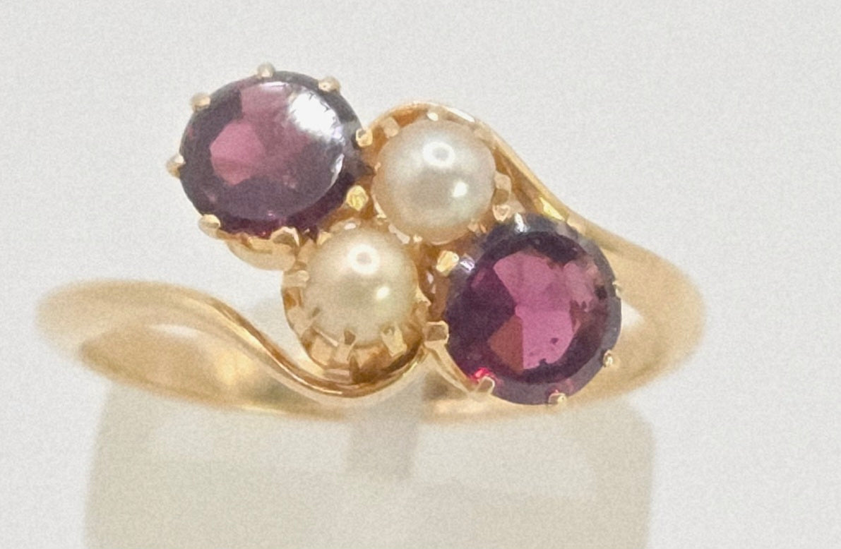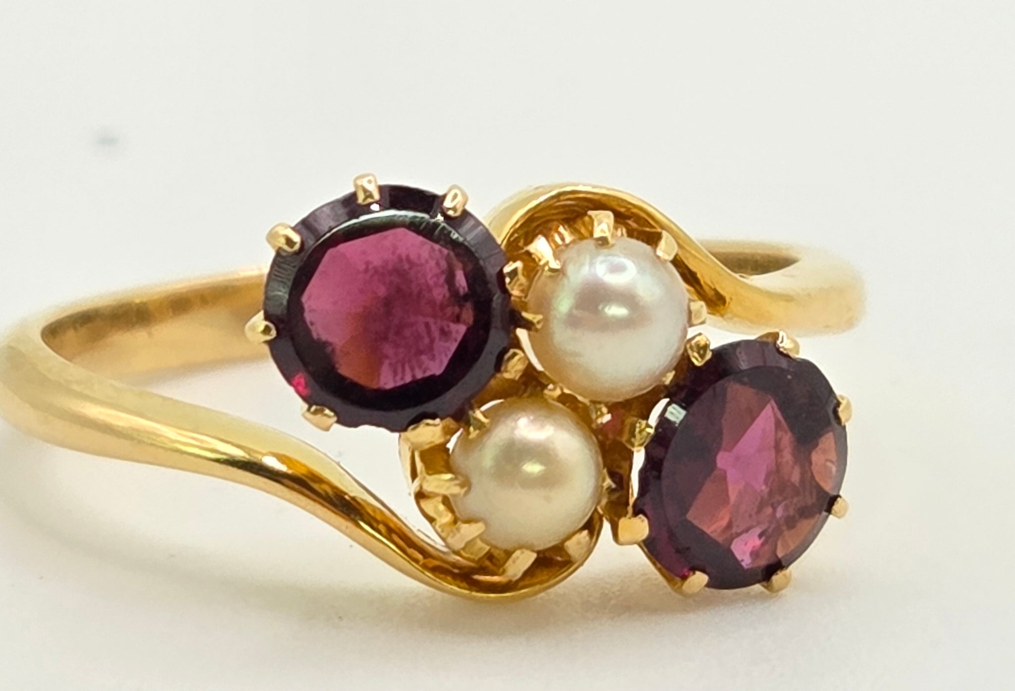 2697: Vintage 18ct Gold Almandine Garnets Cultured Pearls Bypass Ring