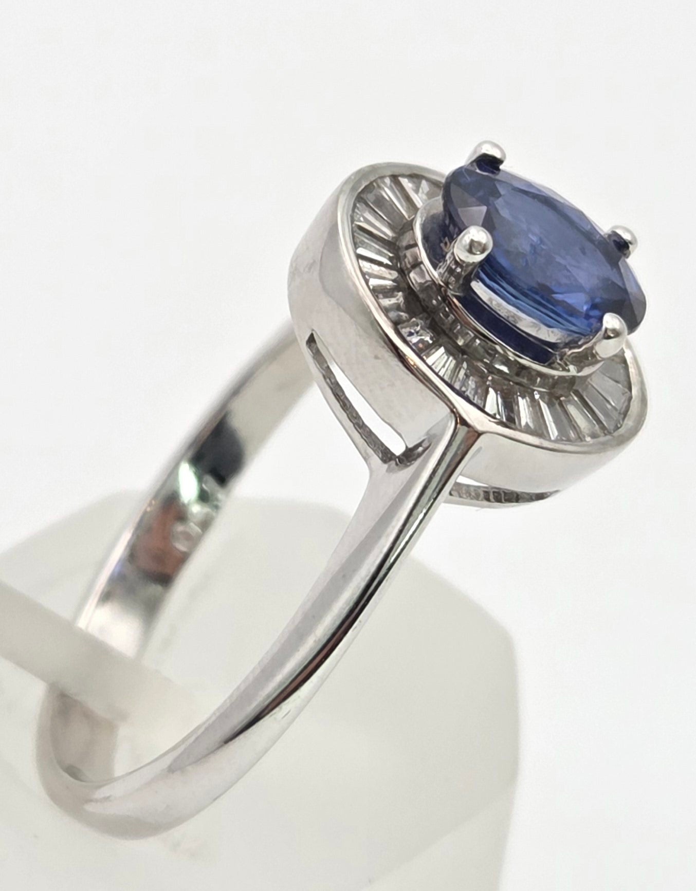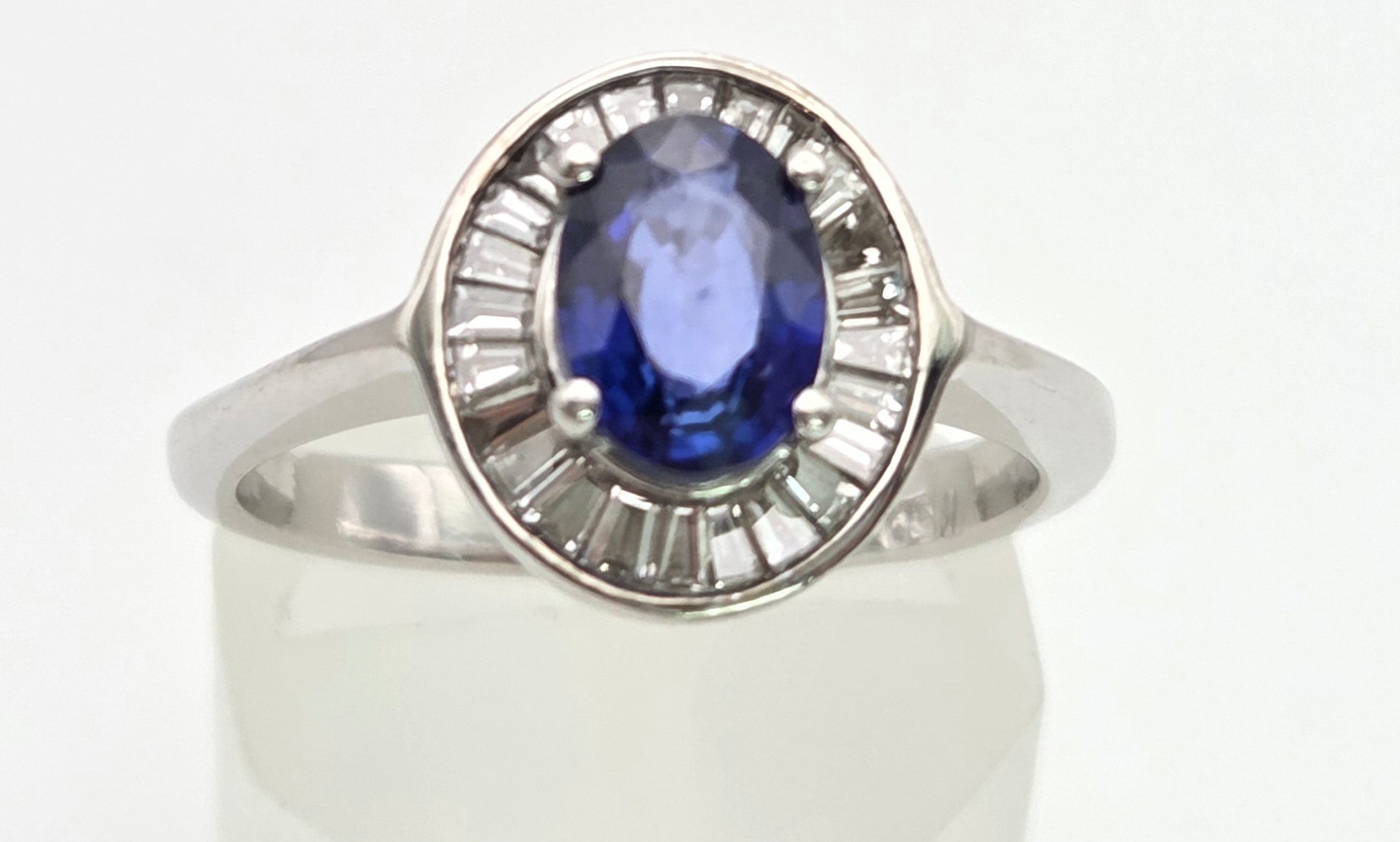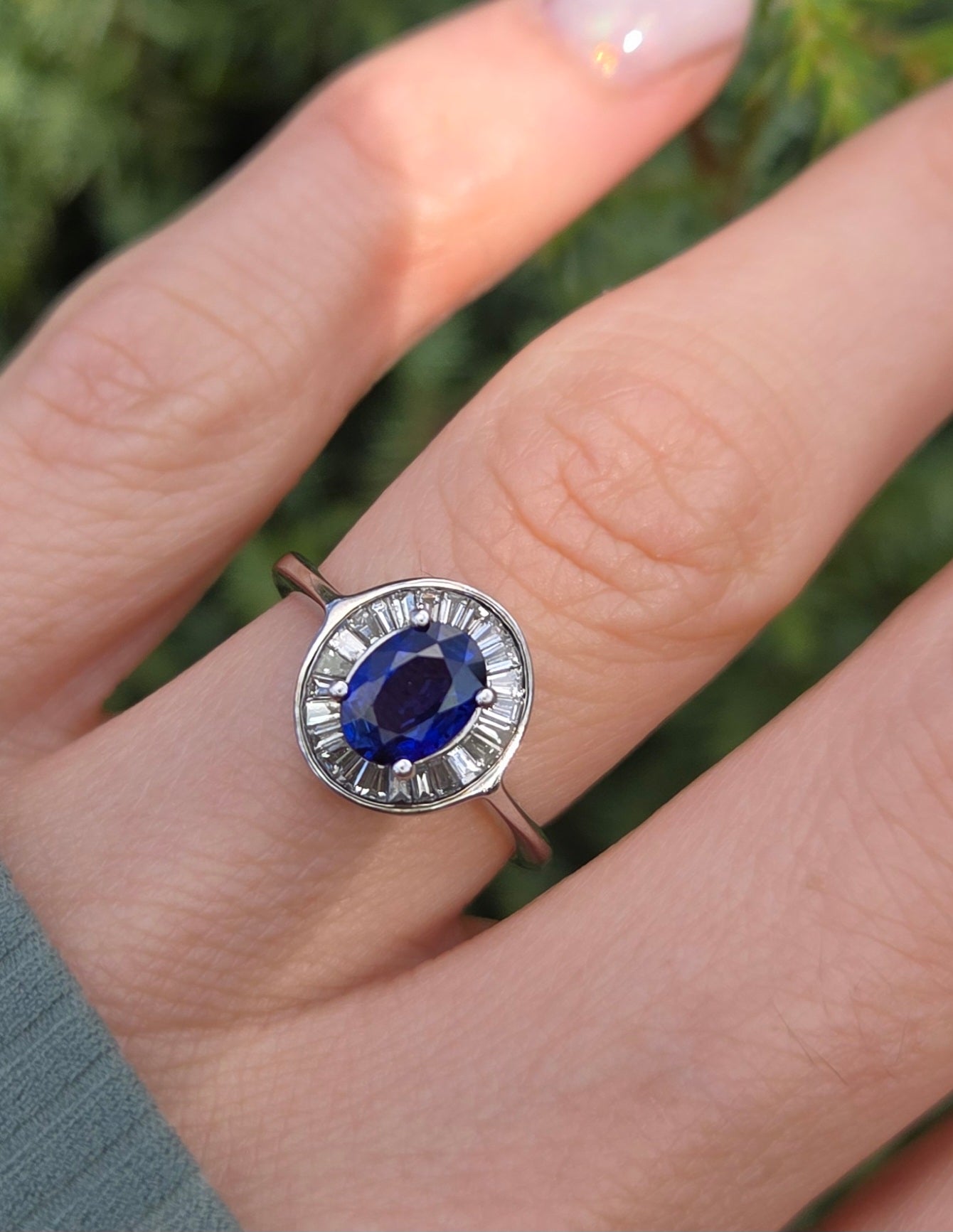 2356 18ct White Gold French Blue Sapphire 24 Natural Baguette Cut Diamonds Cluster