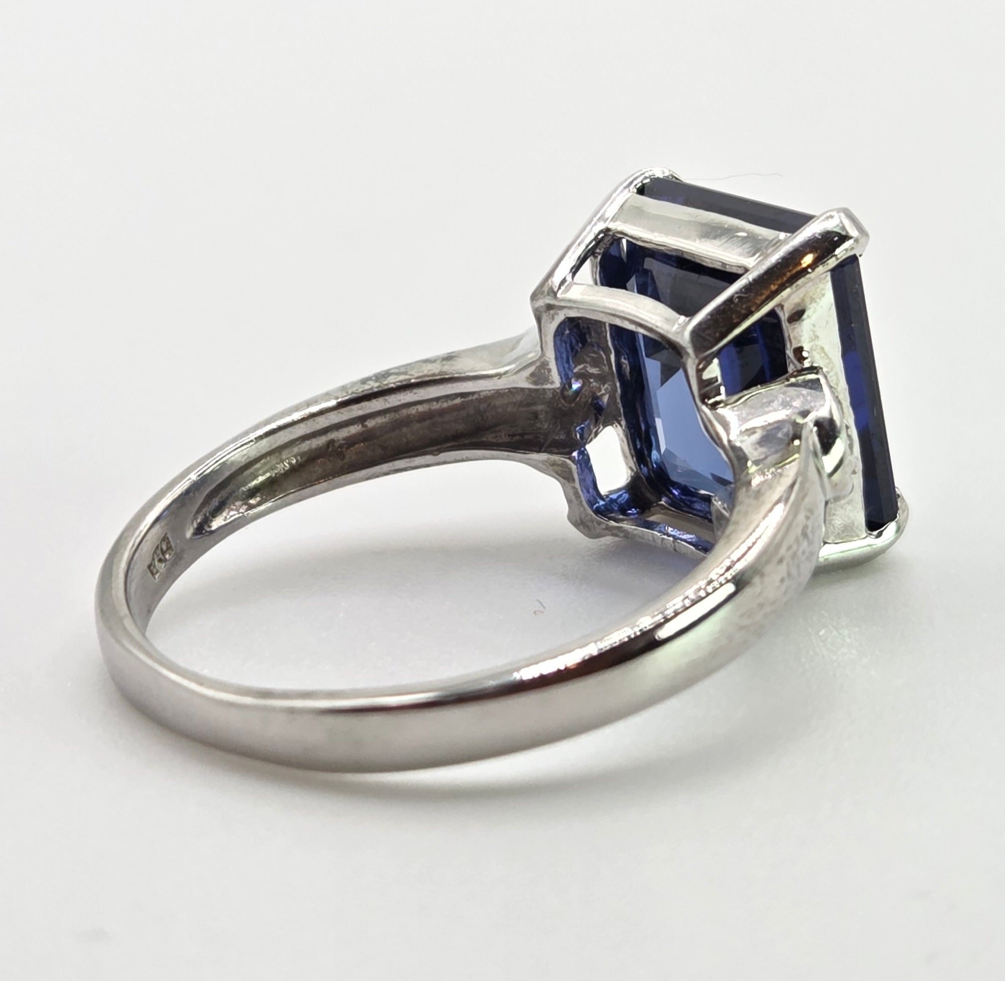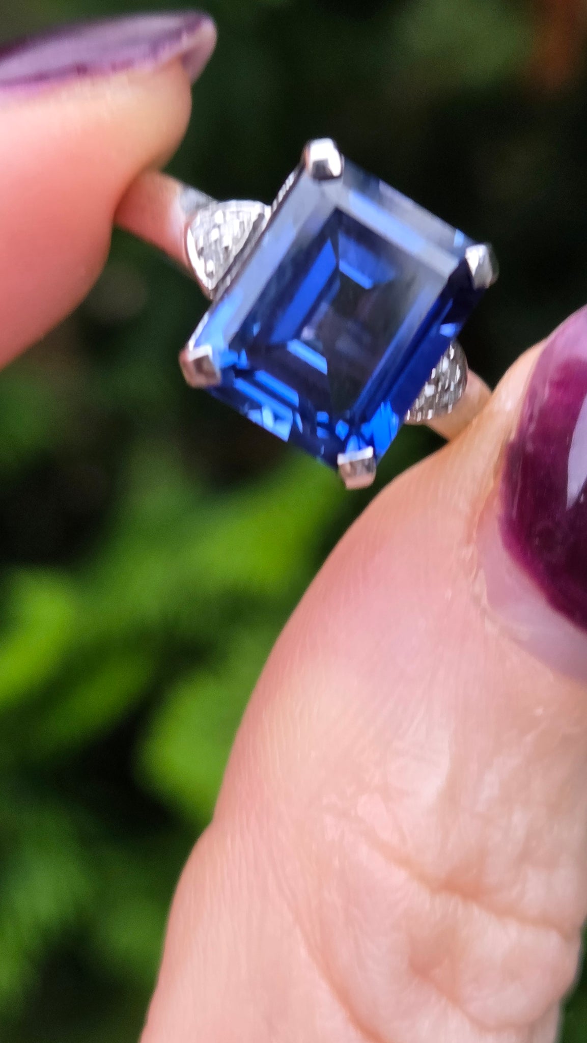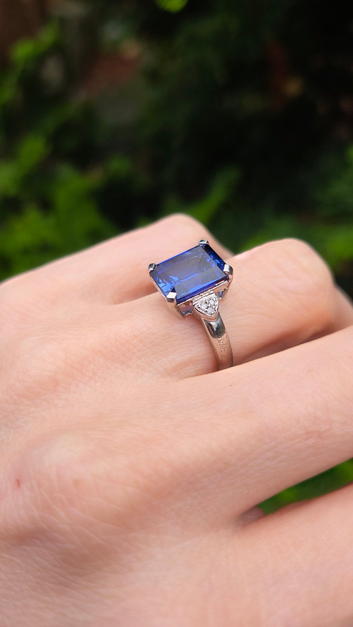 2607 Vintage: 9ct White Gold Emerald Cut French Blue Sapphire Diamonds Ring