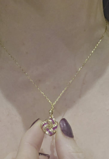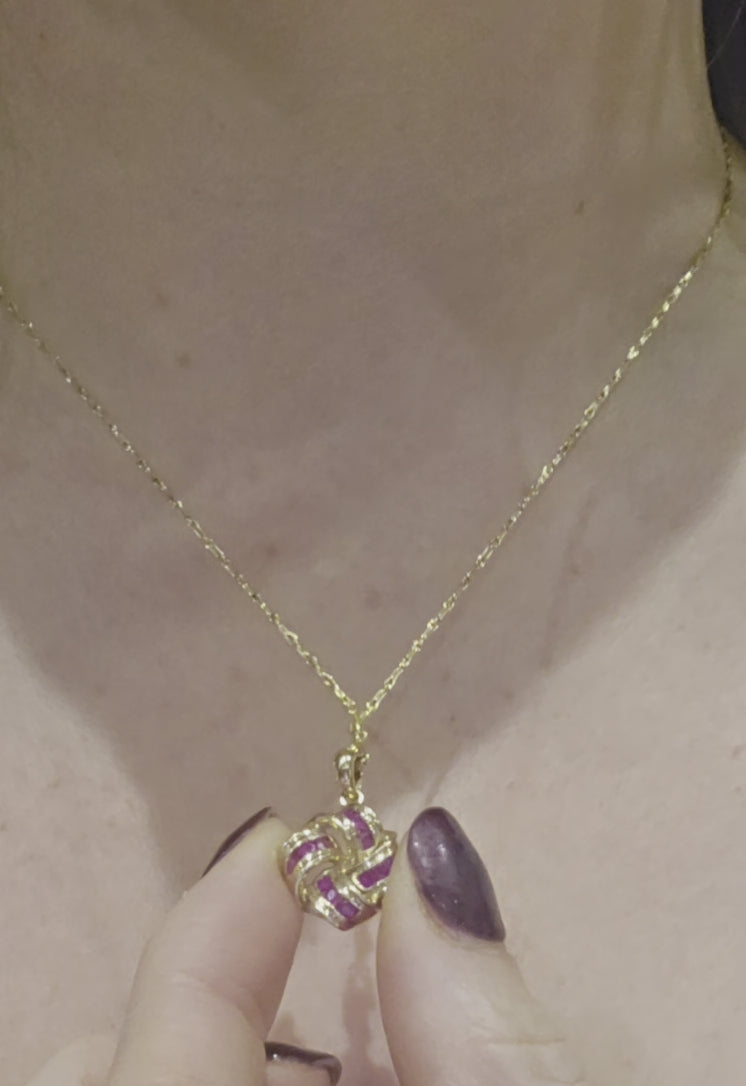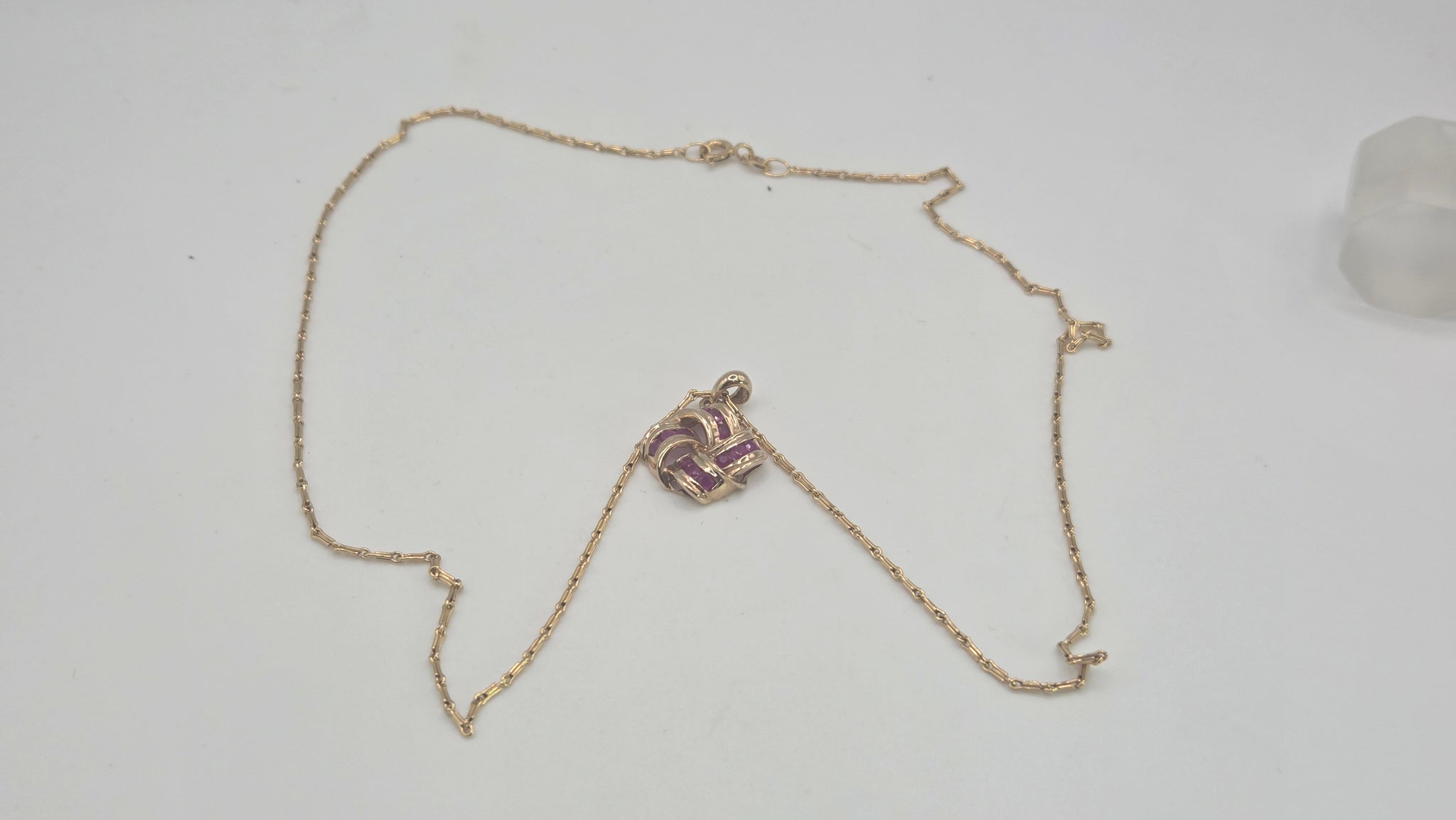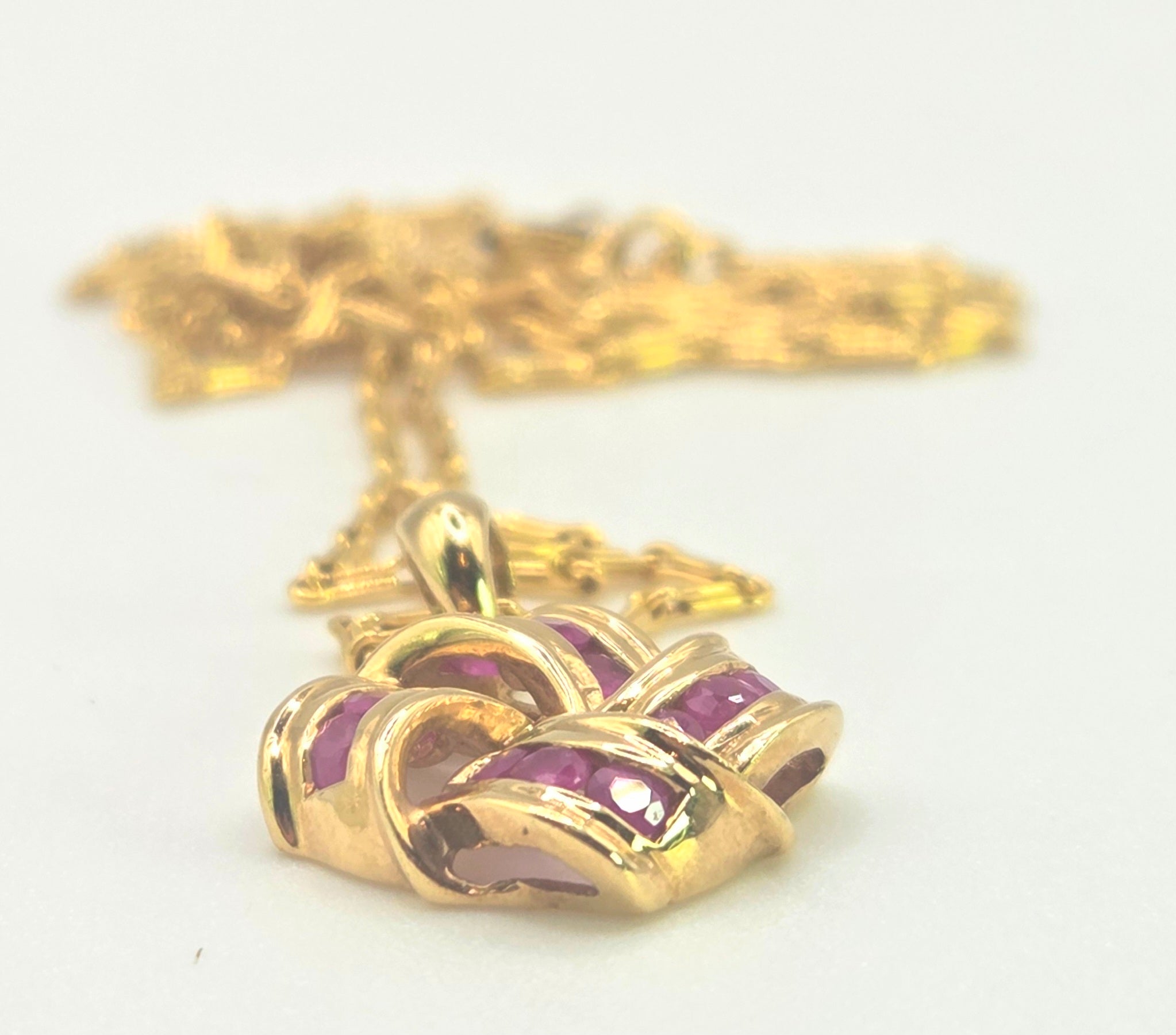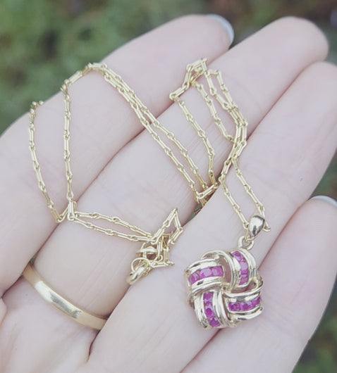 2685- Vintage:9ct Gold Rubies Lovers Knot Pendant & Necklace (44cm)-Lovely