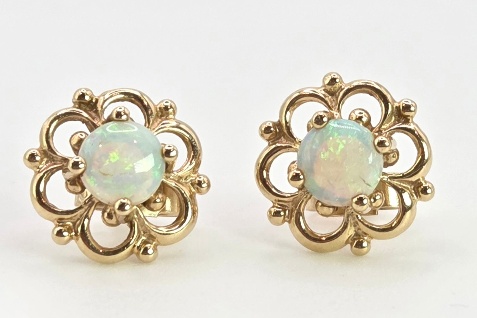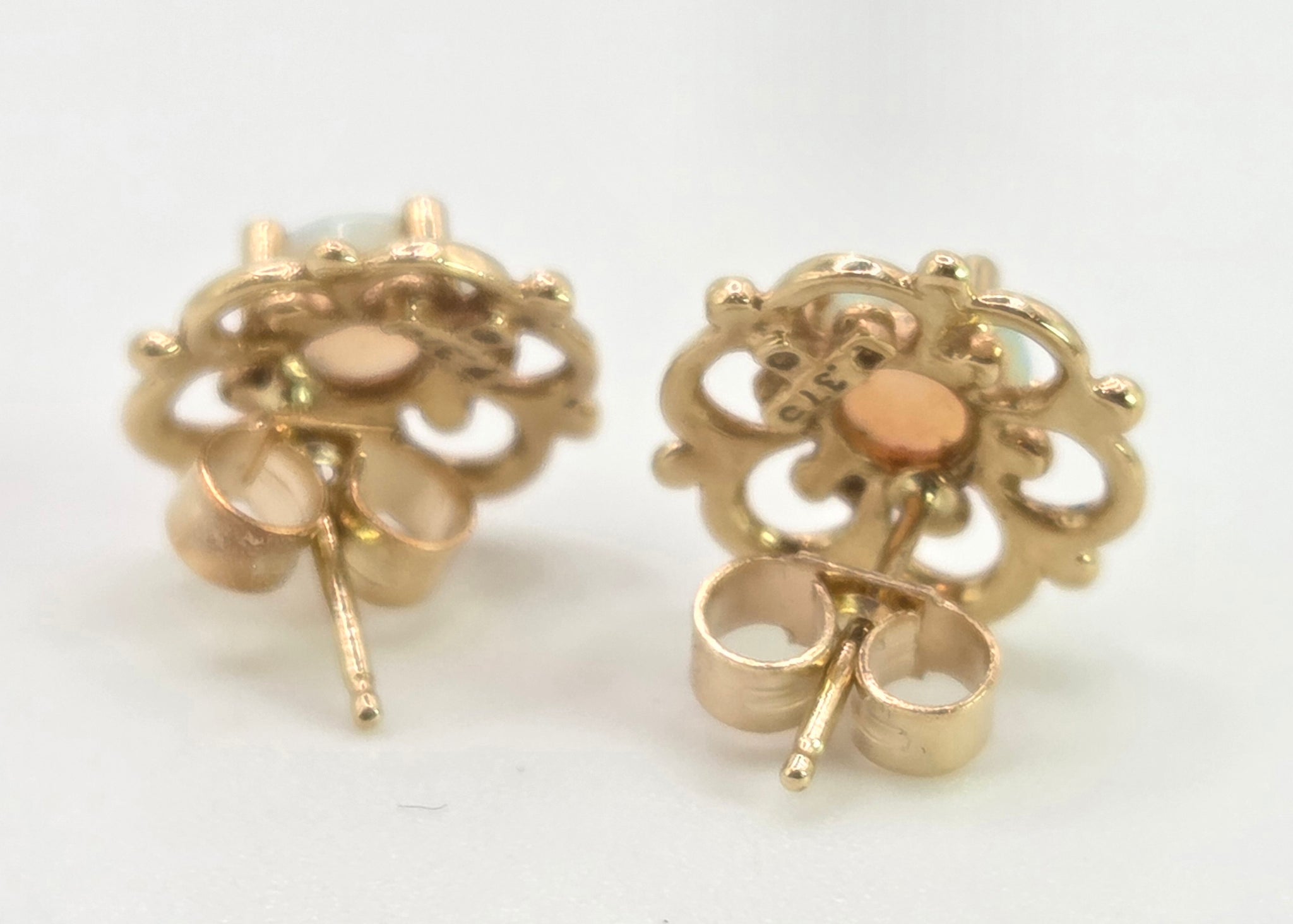 2518- Vintage: 9ct Gold White Opal Openwork Stud Earrings- L:ovely colours