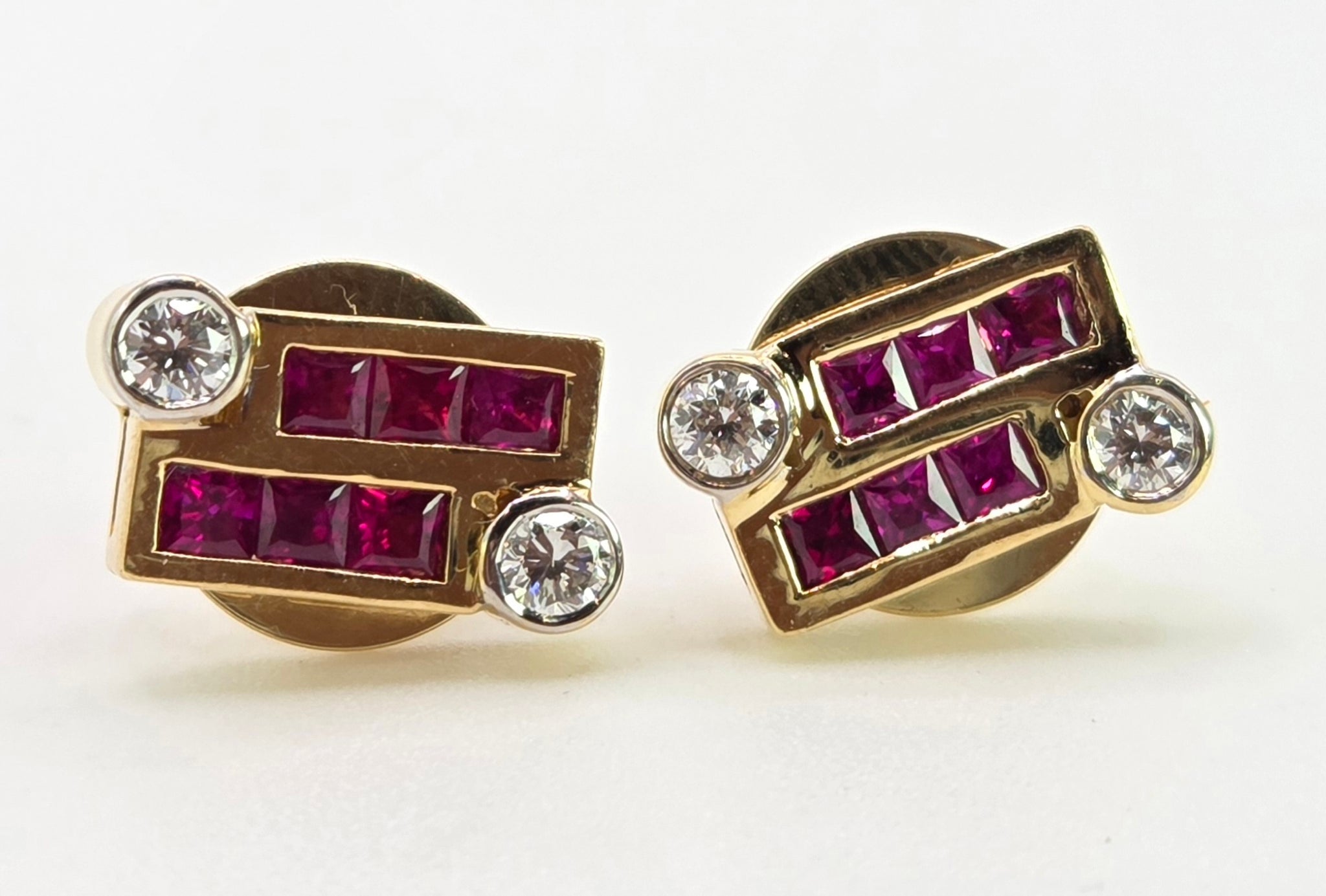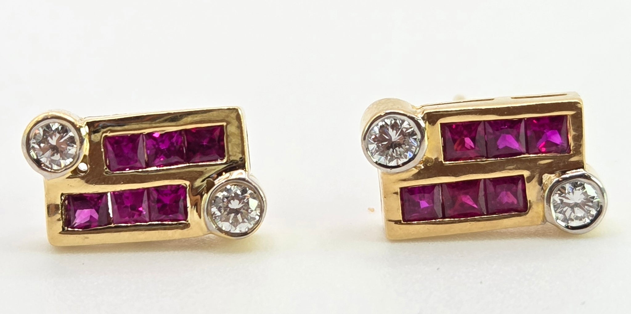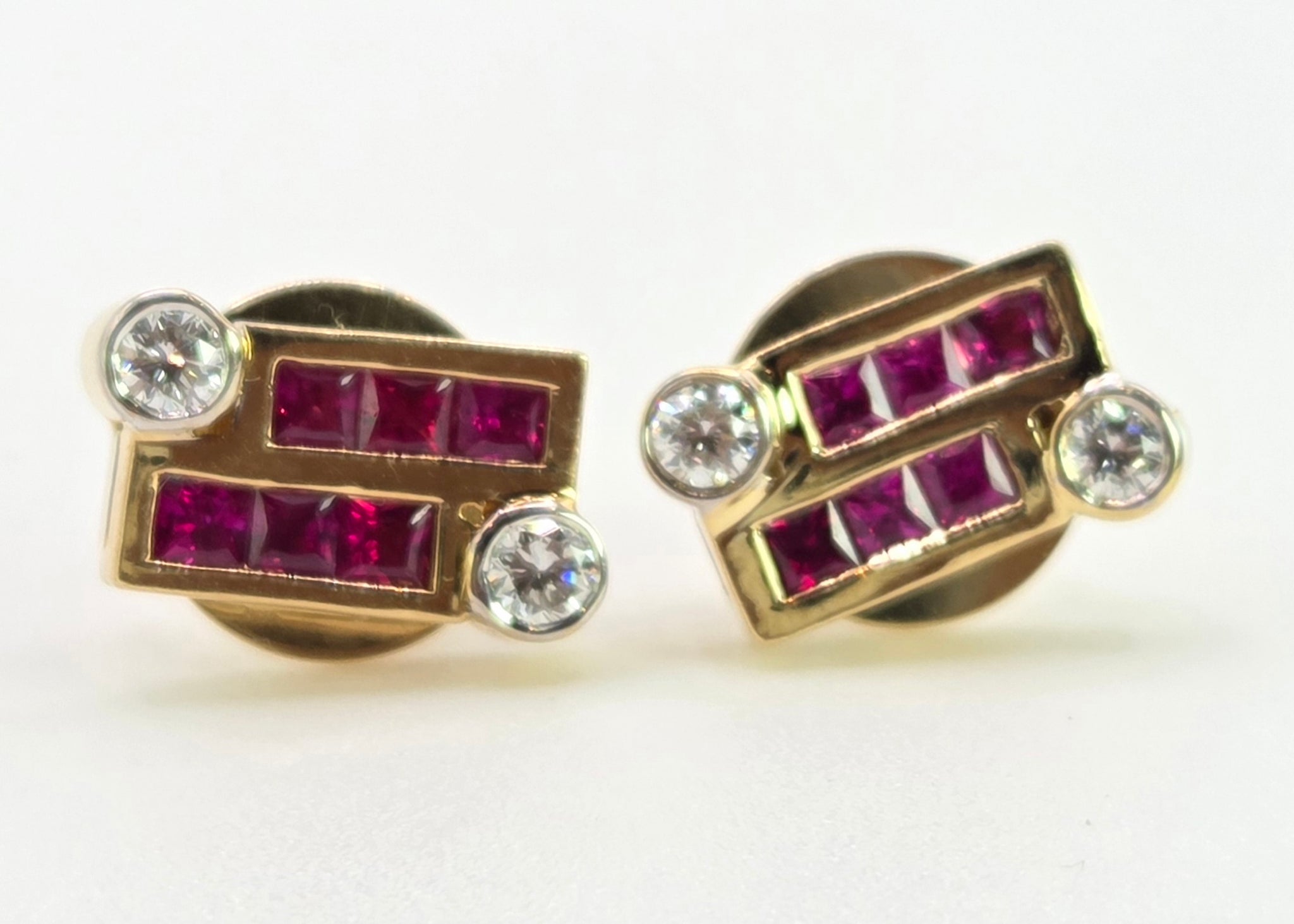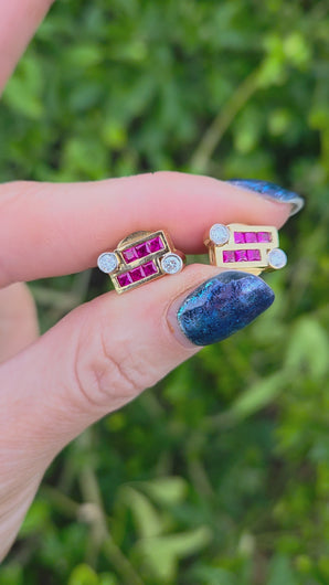 2727: Vintage 18ct Gold Rubies & Diamonds Geometric Set Stud Earrings