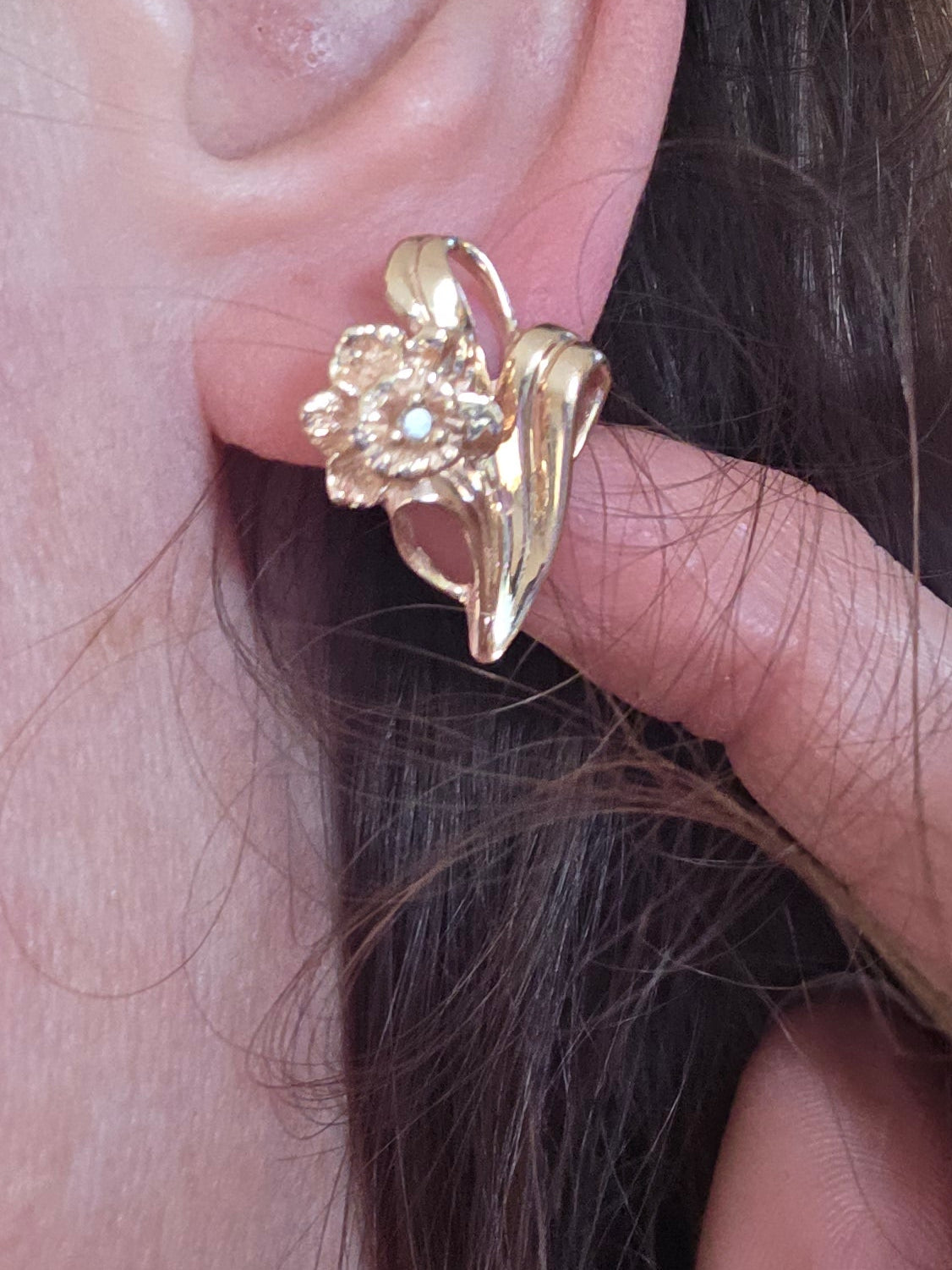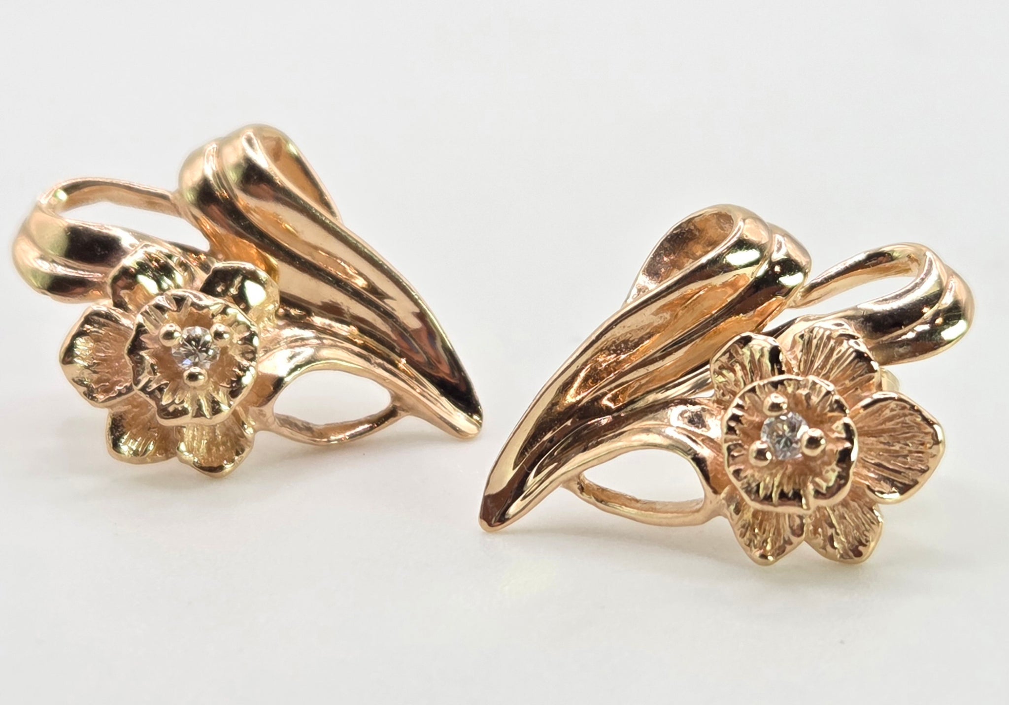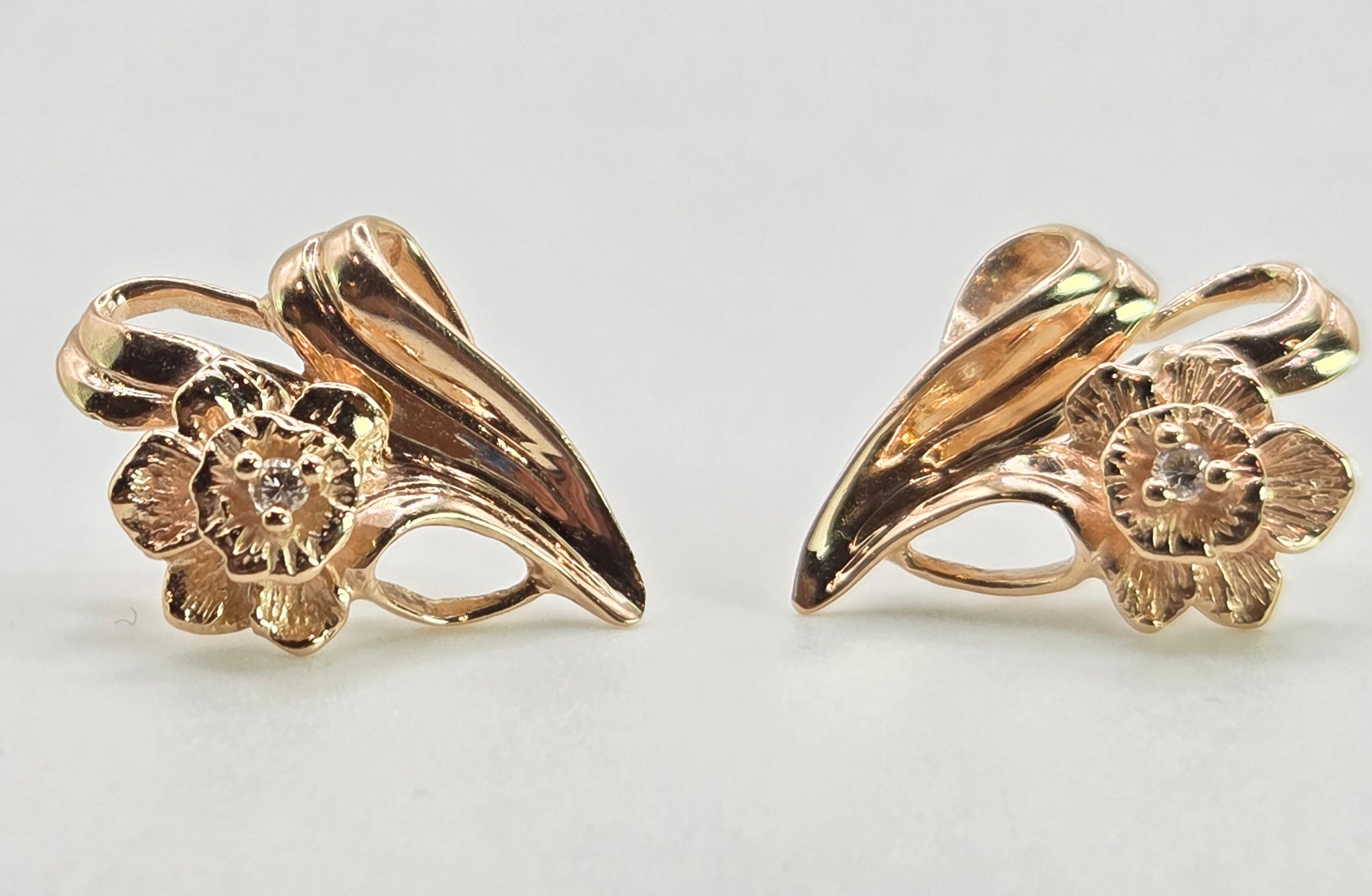 2758:  Vintage 14ct Gold Round Full Cut Diamonds Floral Stud Earrings