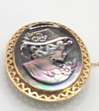 2590- Vintage: Large & Ornate 9ct Gold Mother of Pearl Cameo Pendant/Brooch