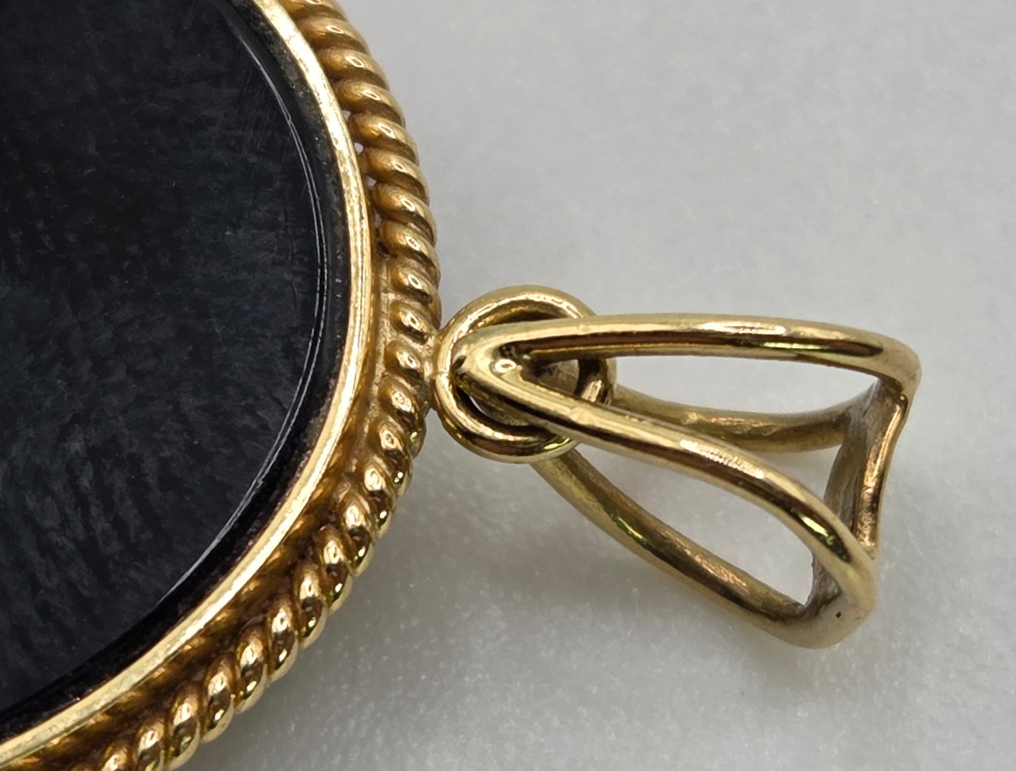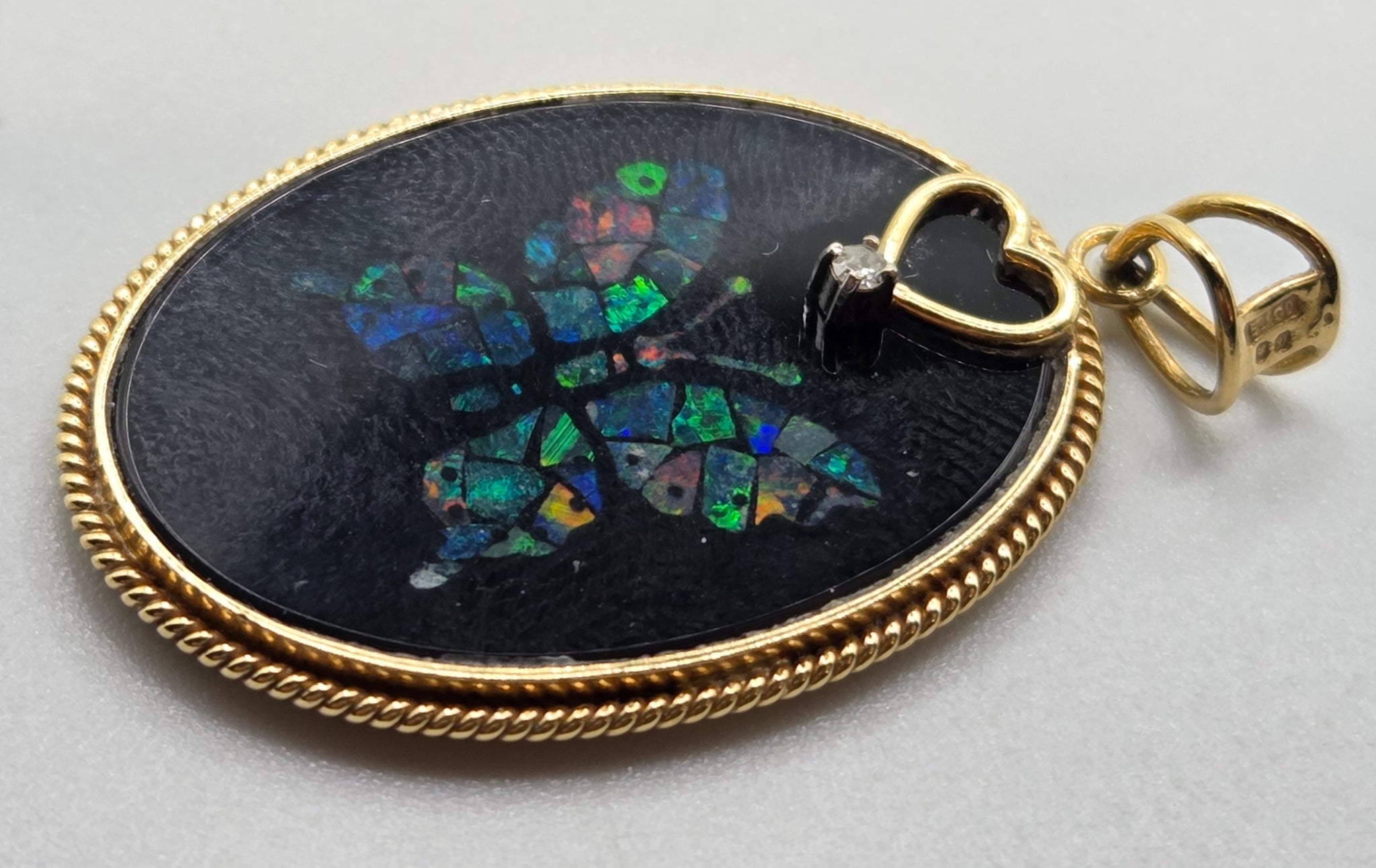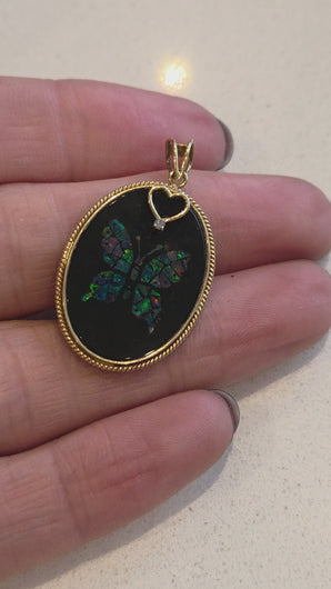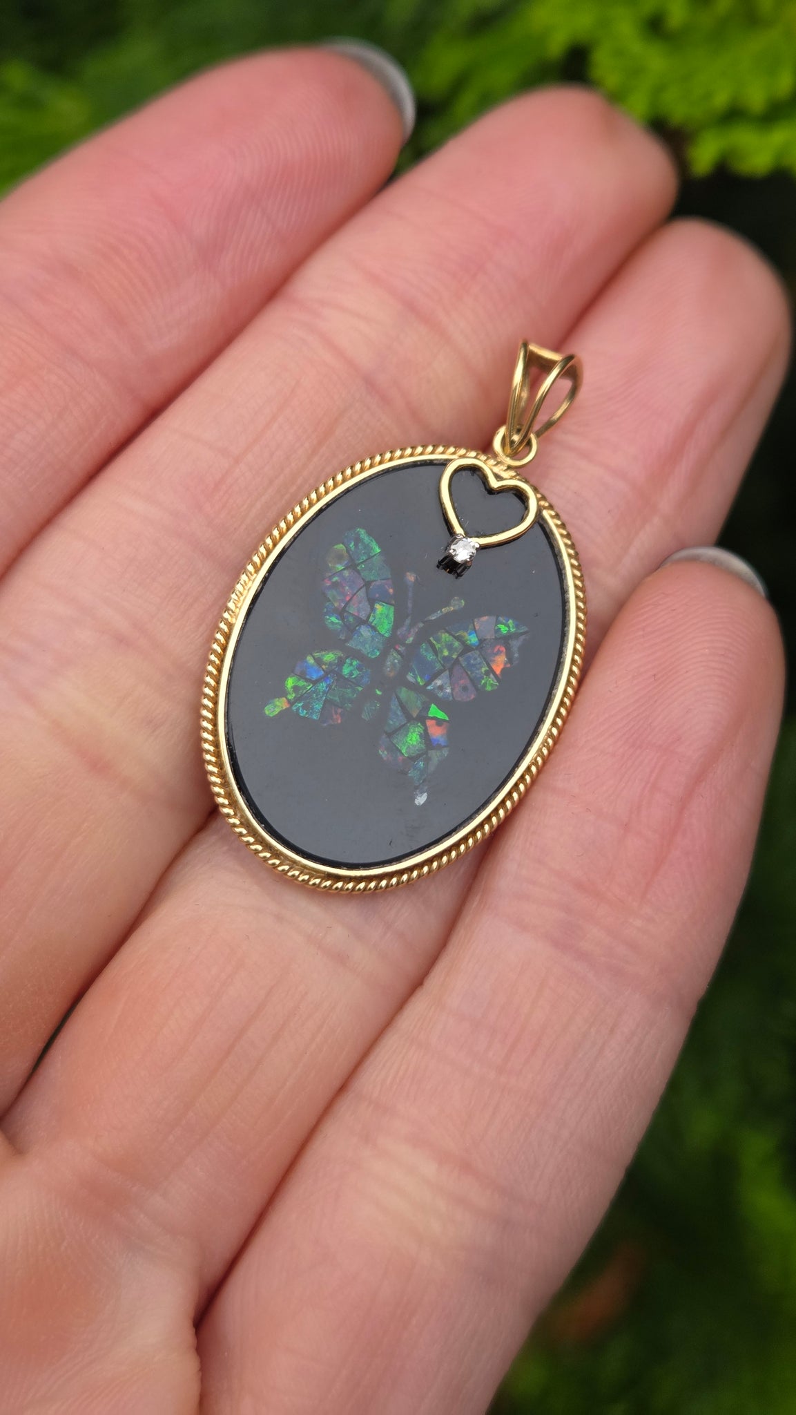 2528 Vintage: 18ct Gold  Onyx Diamond Inlaid Butterfly Pendant- From 1978