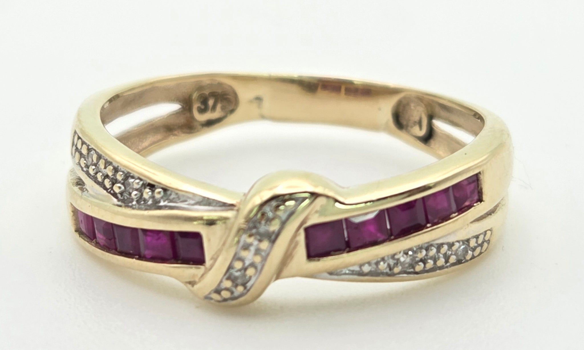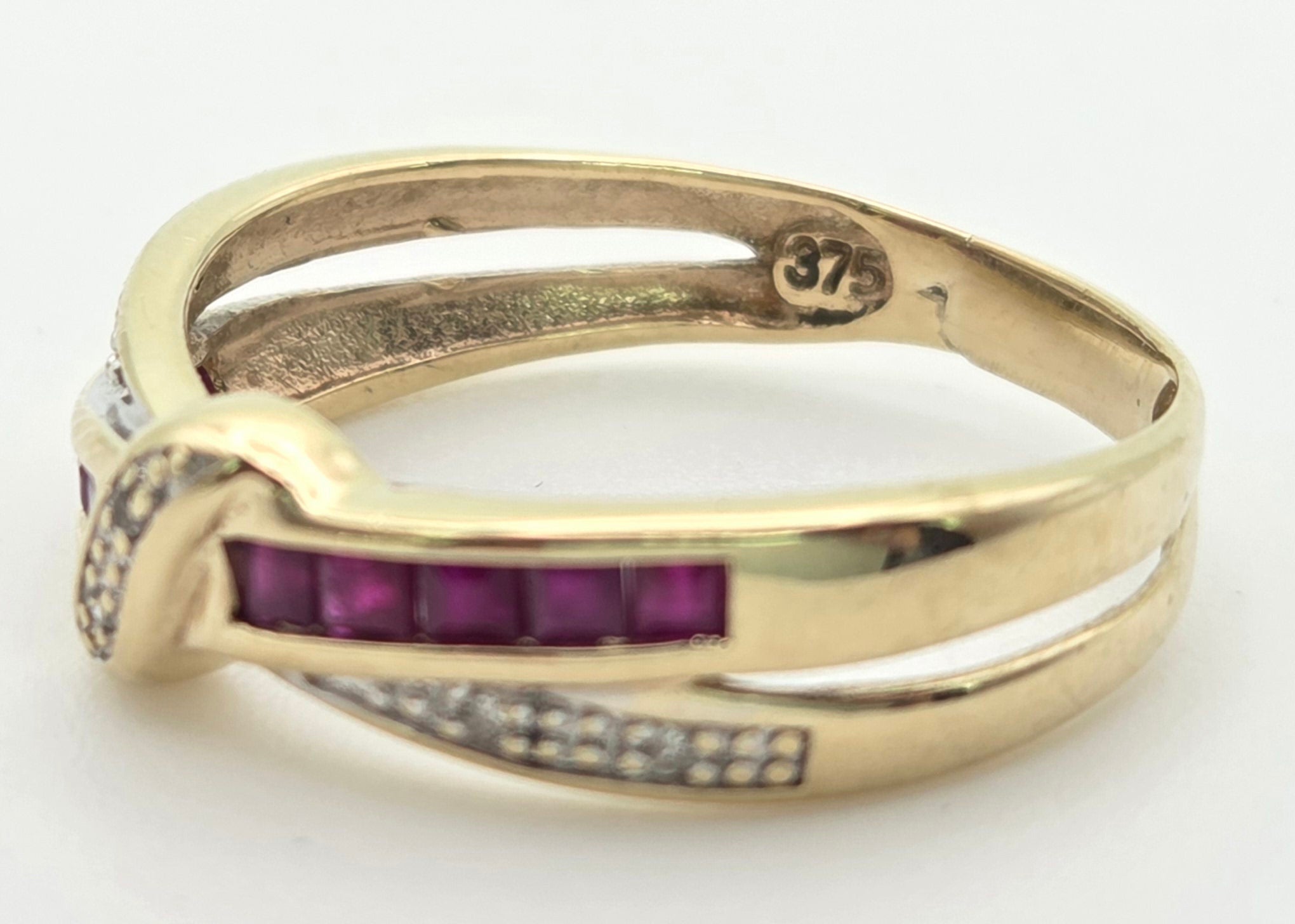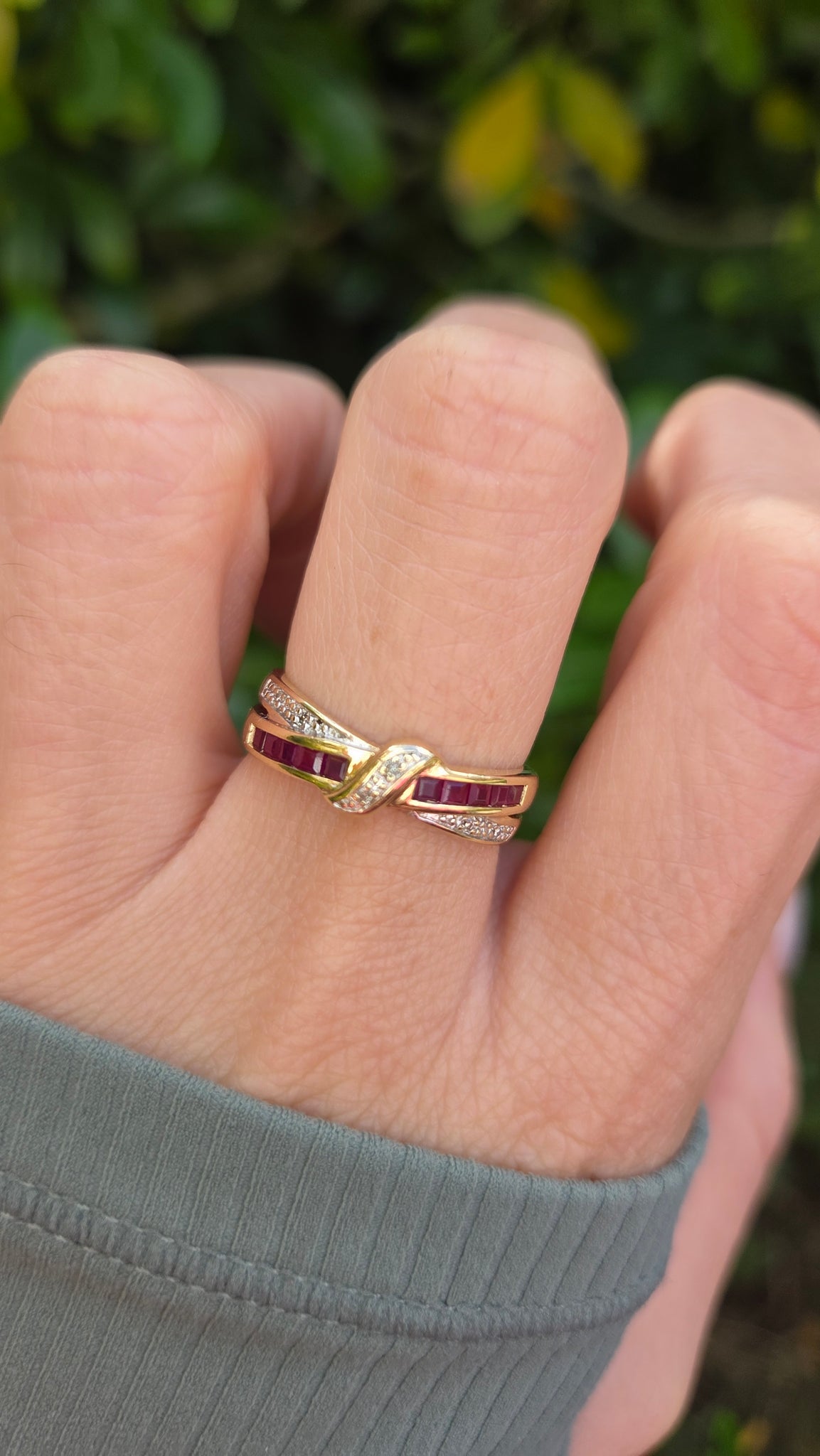 2271 Vintage: 9ct Gold Rubies Natural Diamonds Crossover Dress/StackercRing