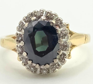 1744: Vintage: 9ct Gold Blue Sapphire 14 Diamonds Diana Cluster Ring- From 1982![]()  - Regular price