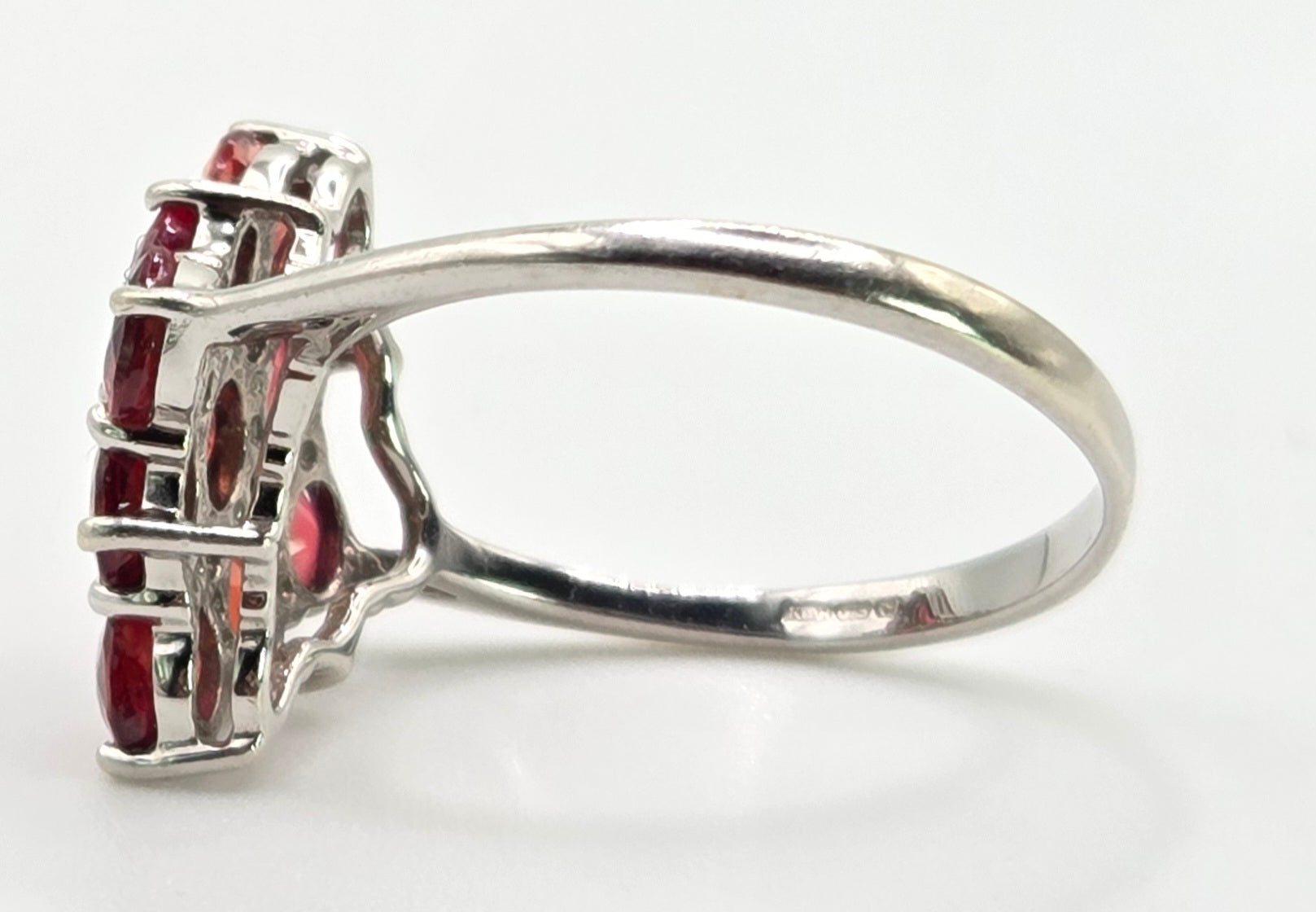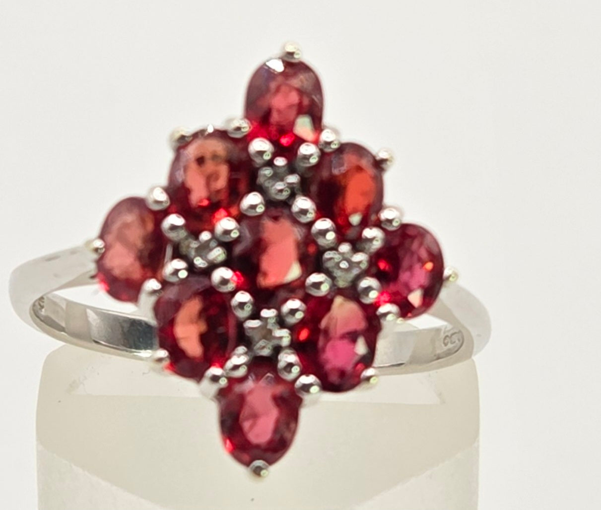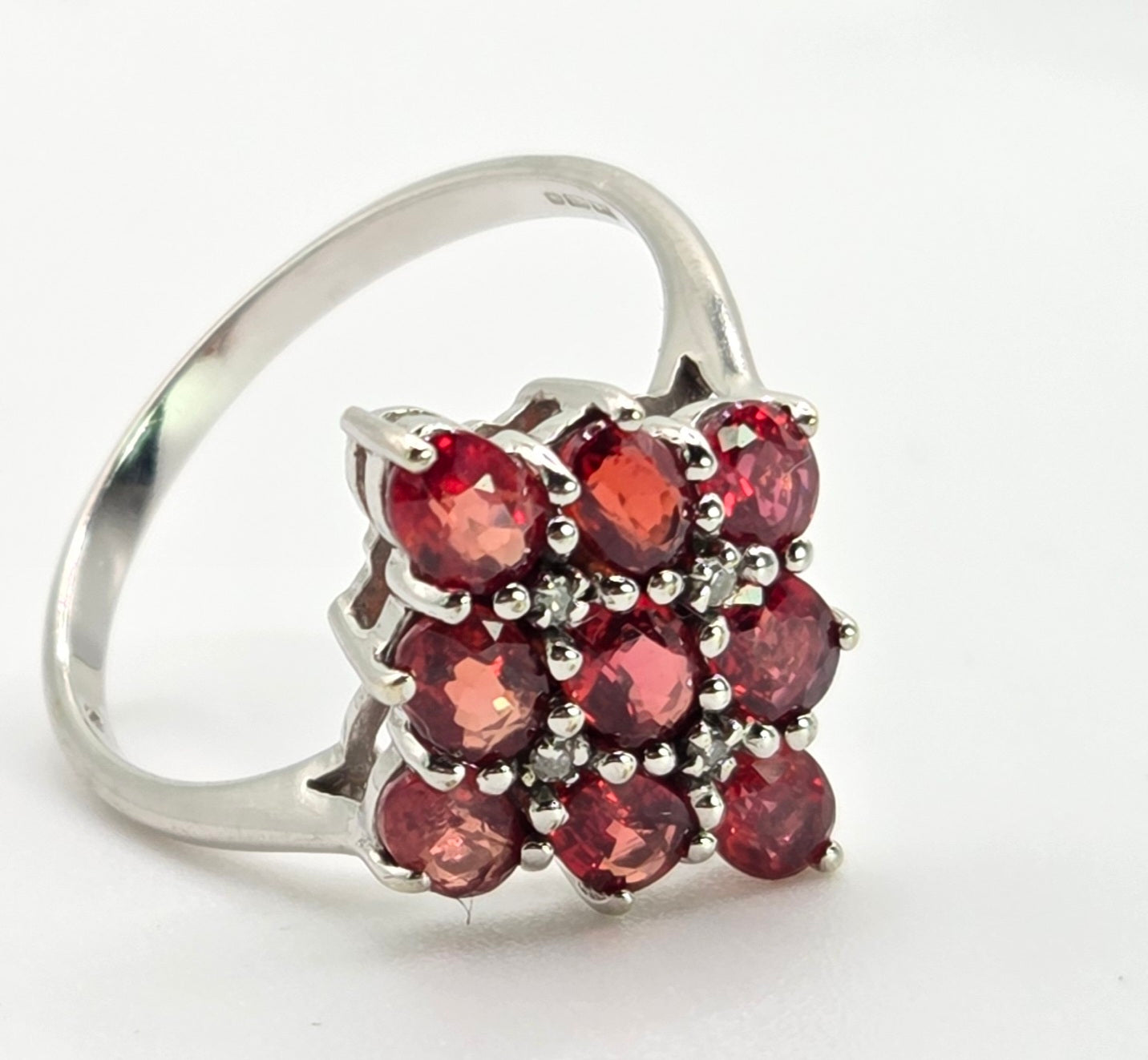 2533; Vintage 9ct White Gold Rubies Diamonds Geometric Set Cluster Ring