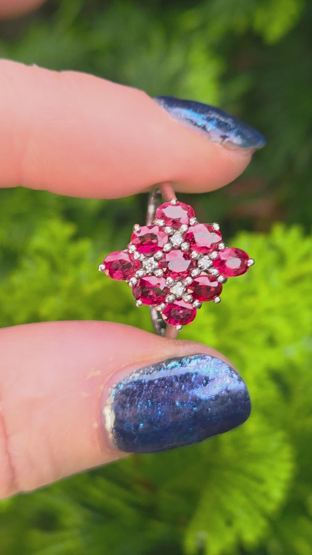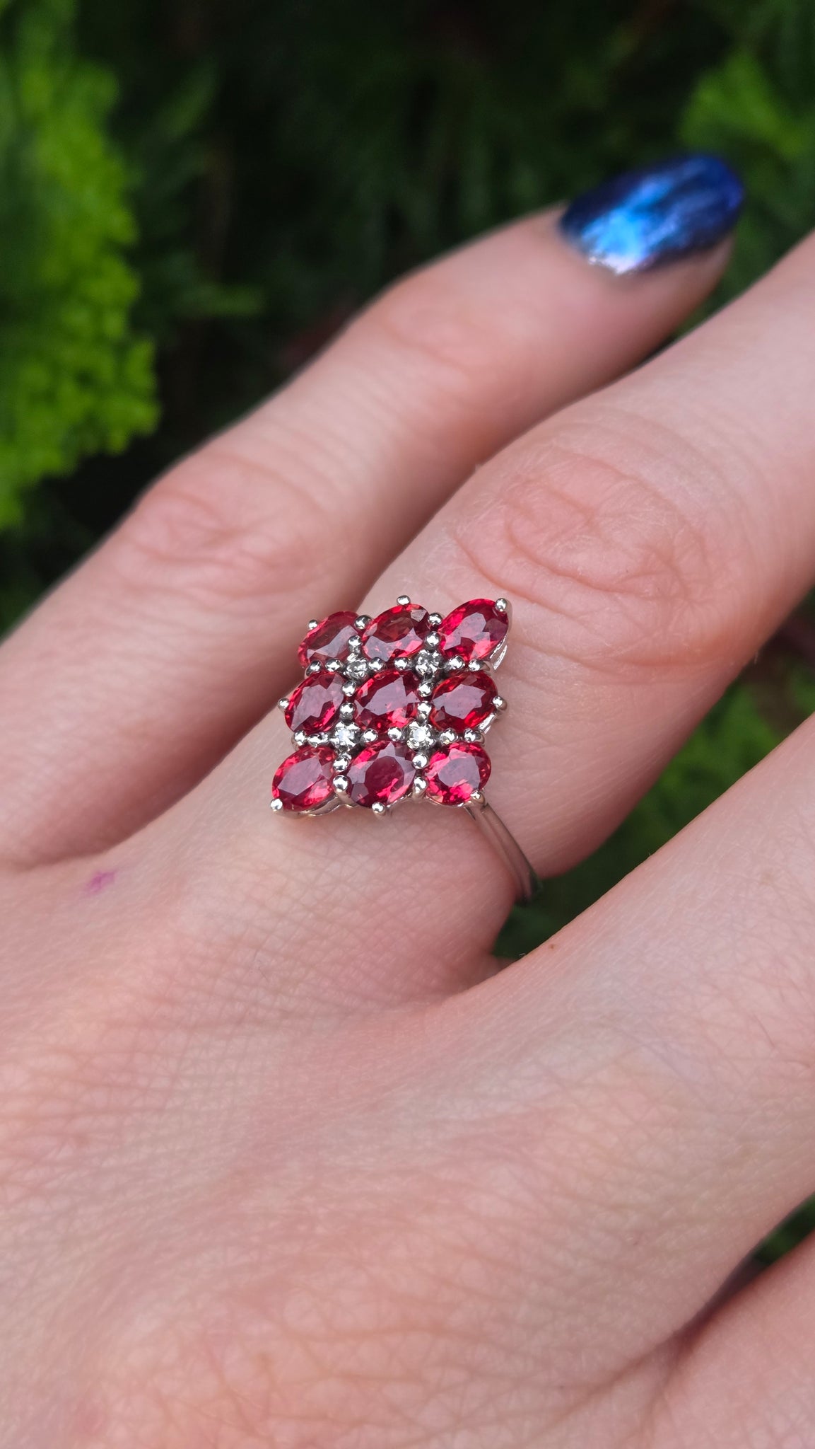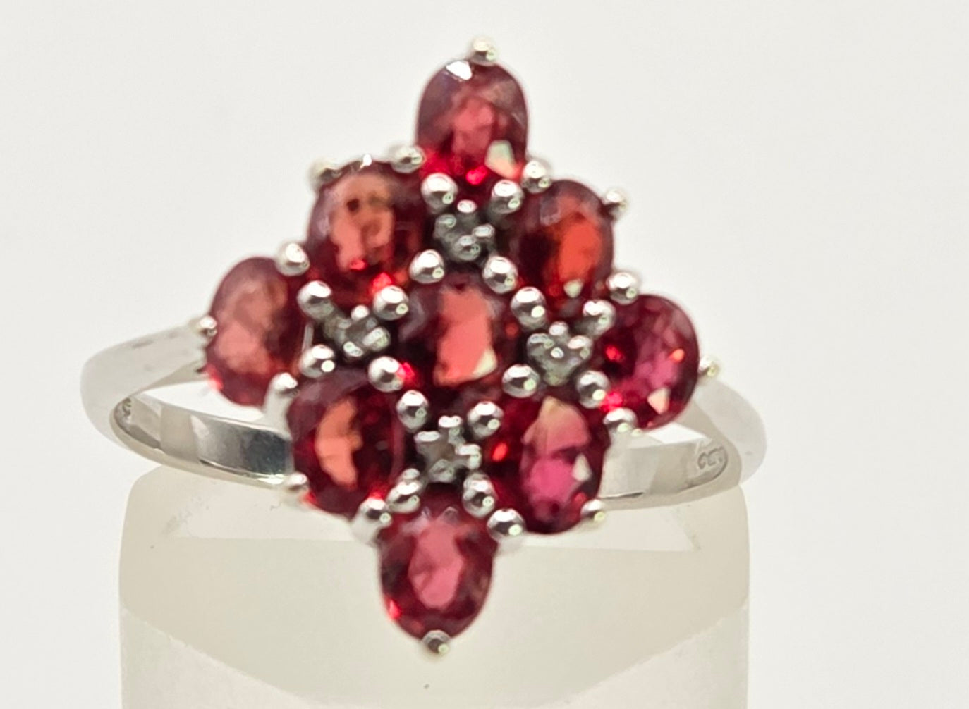 2533; Vintage 9ct White Gold Rubies Diamonds Geometric Set Cluster Ring