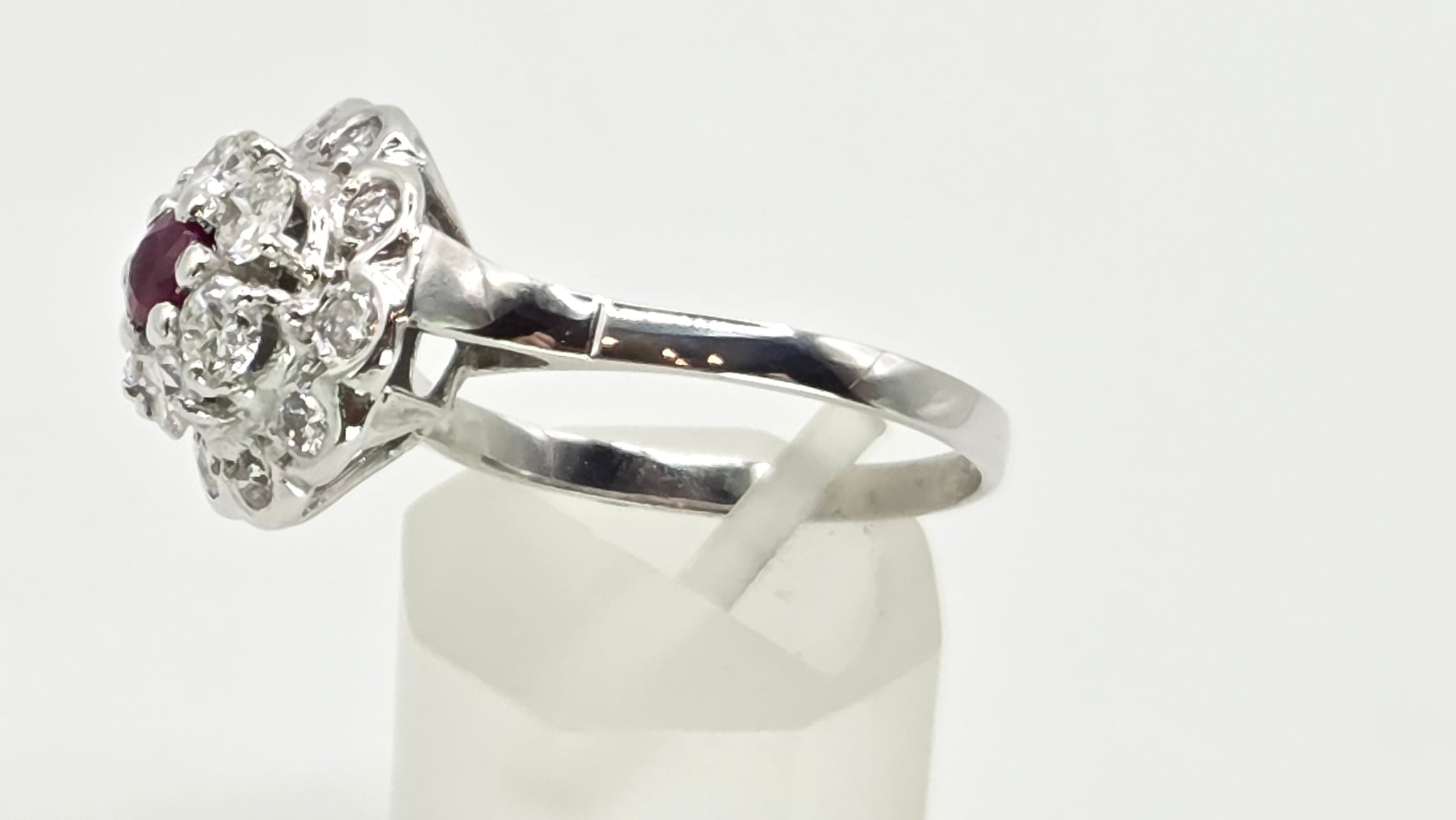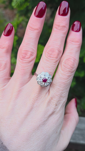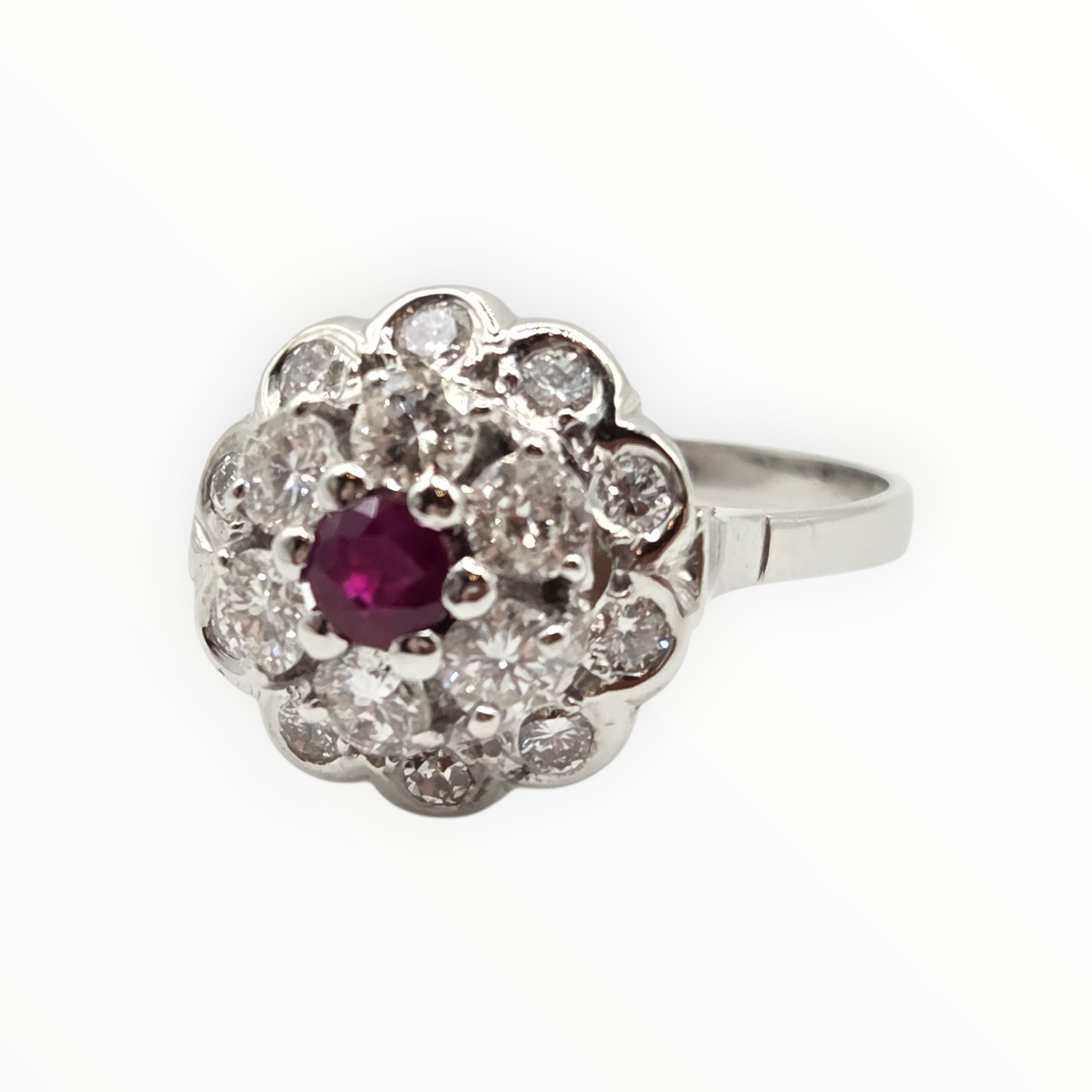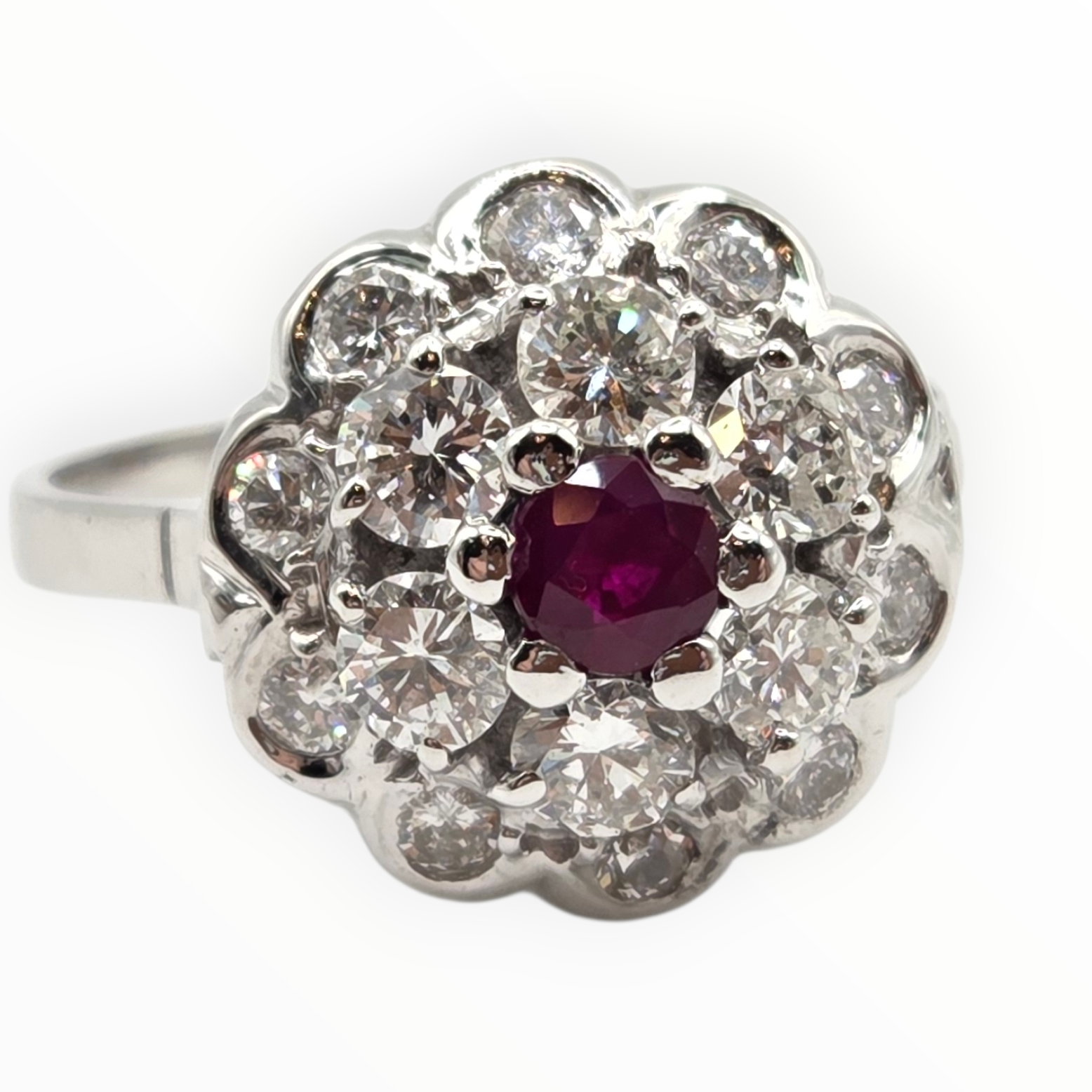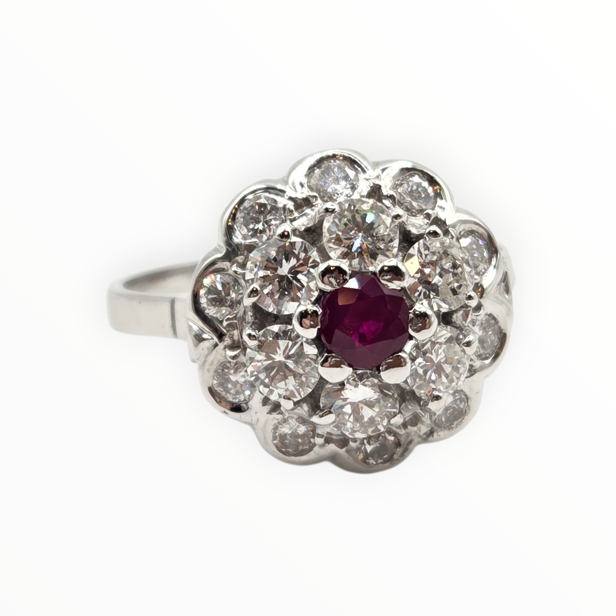2821- Vintage 14ct White Gold Ruby Natural Sparkling Diamonds (1.58ct) Cluster Ring