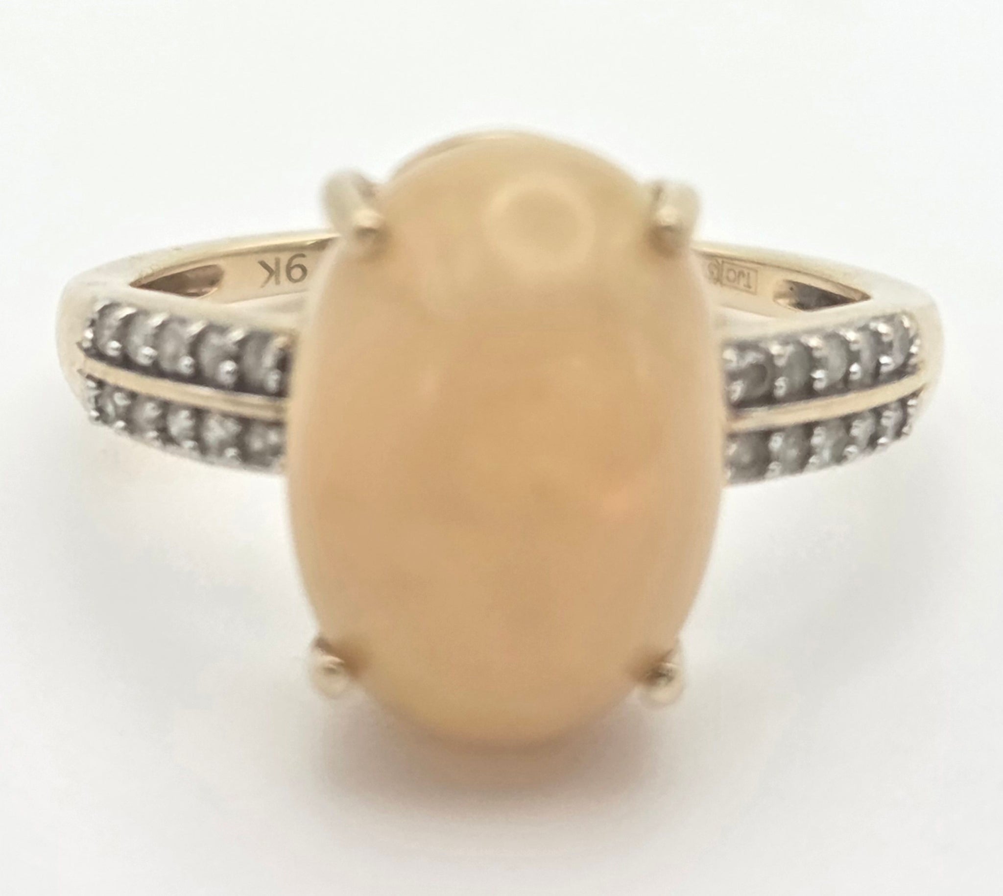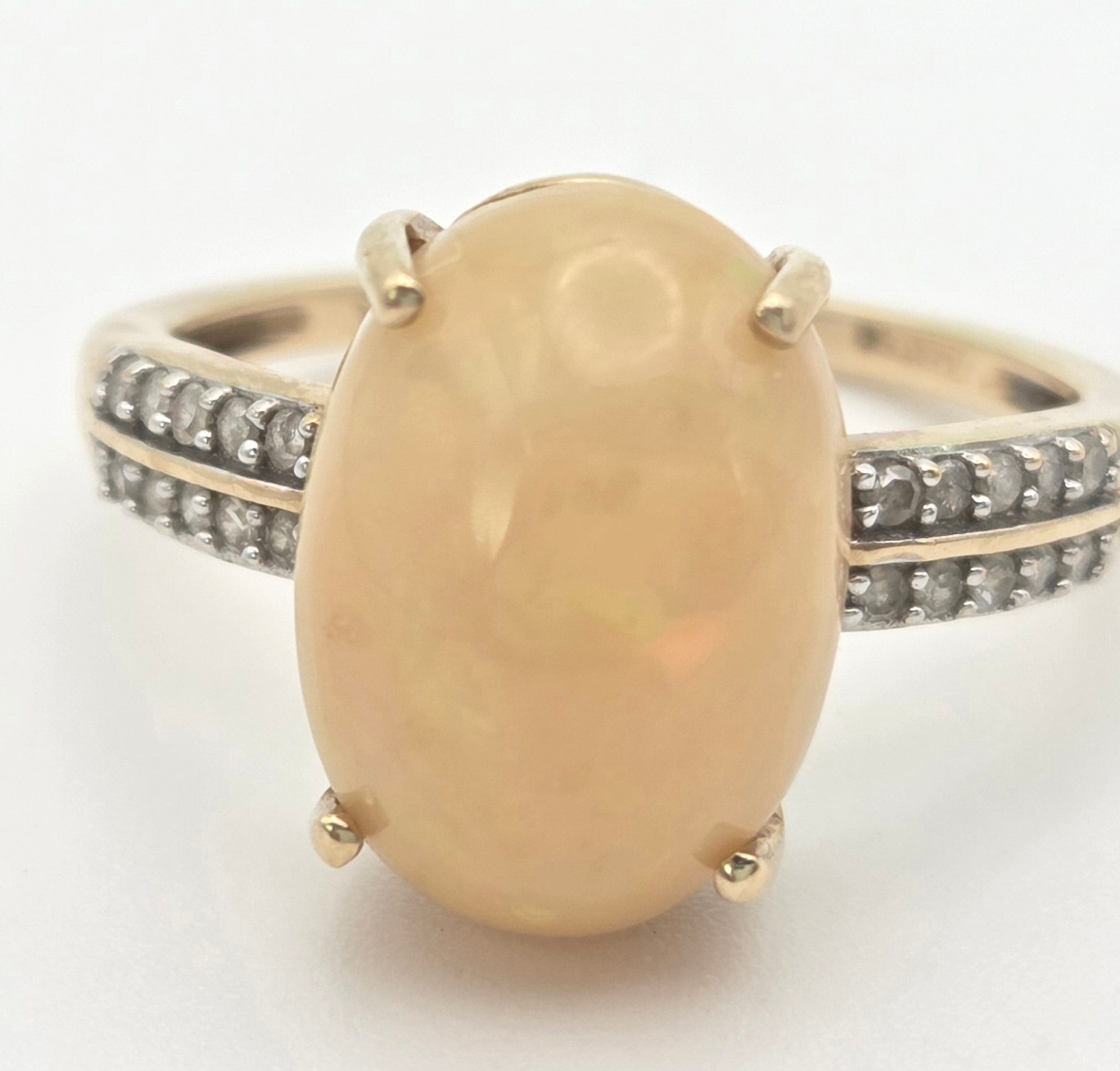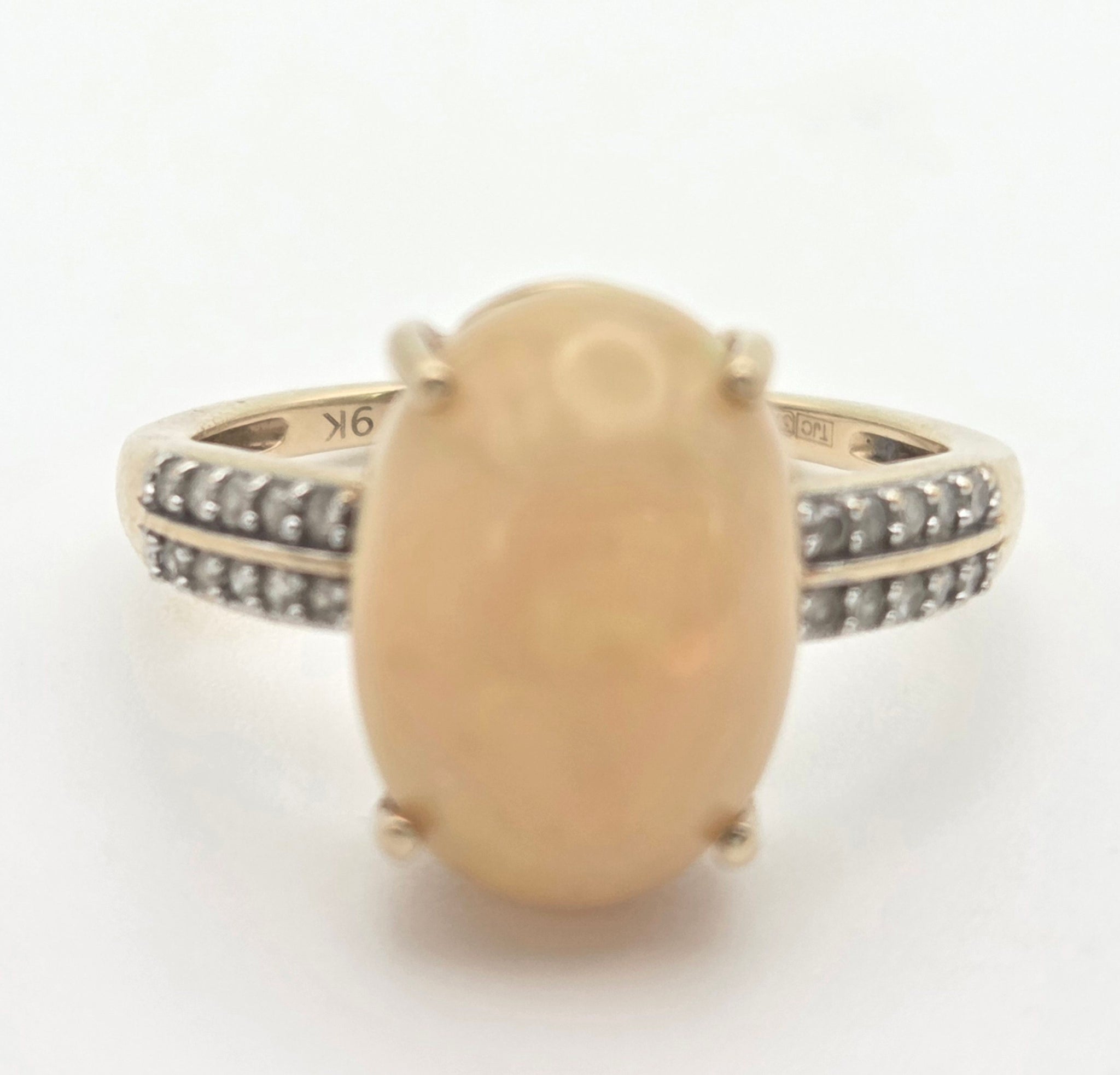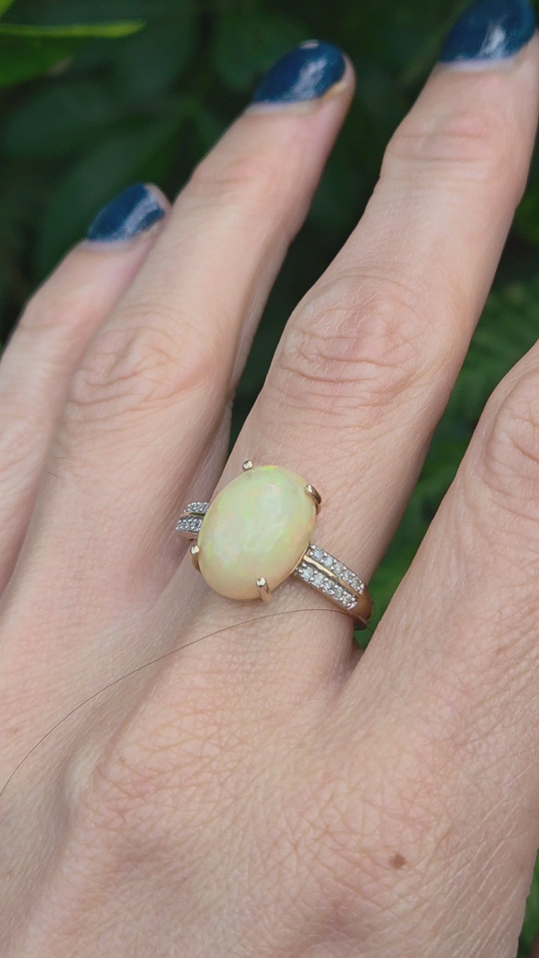 2270 Vintage: 9ct Gold Oval cabochon White Opal 20 Natural Diamonds Cocktail Ring