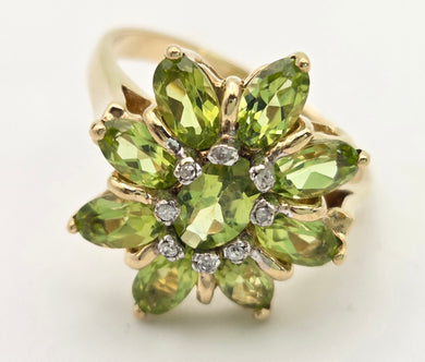 2298 Vintage: 9ct Gold Peridots Natural Diamonds Floral Cluster Ring