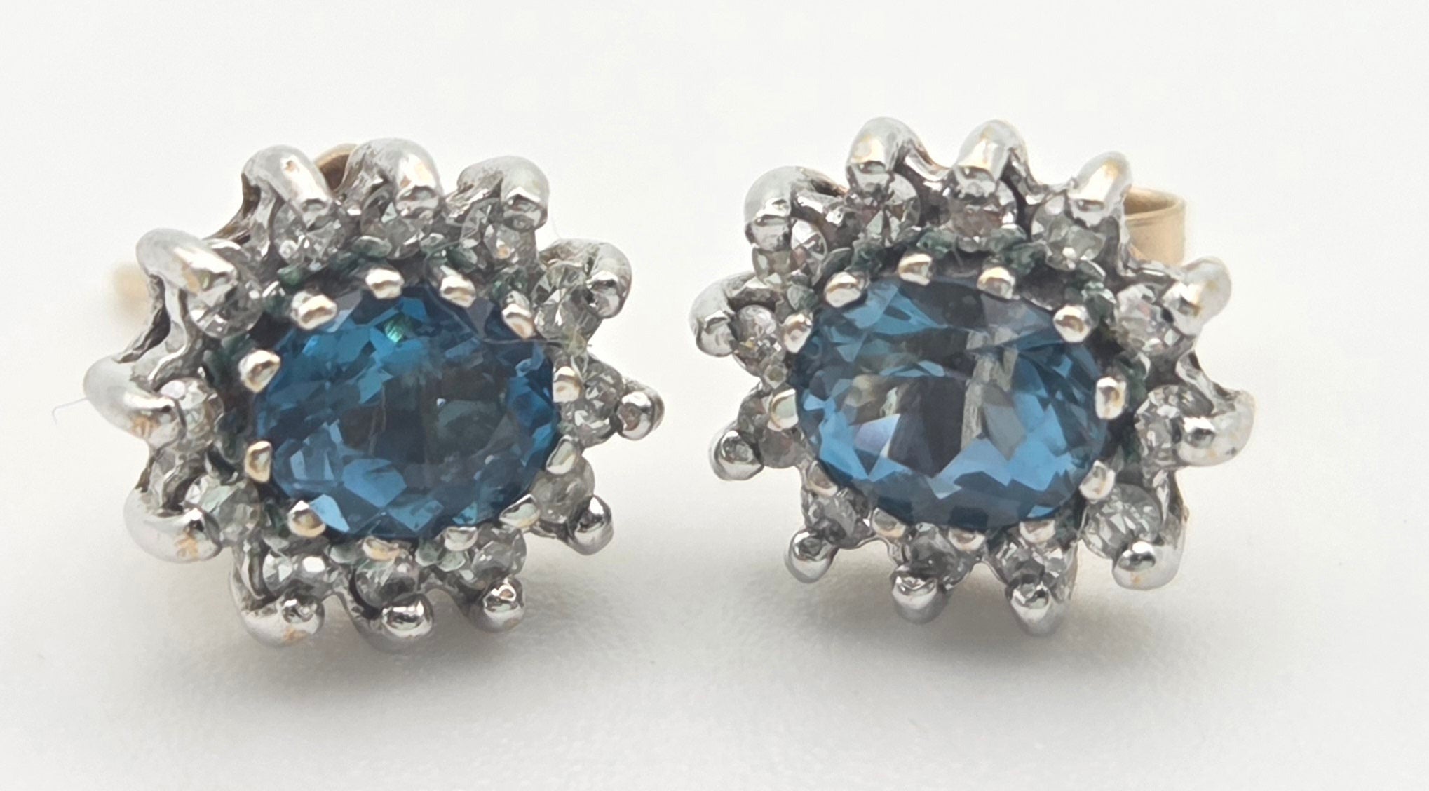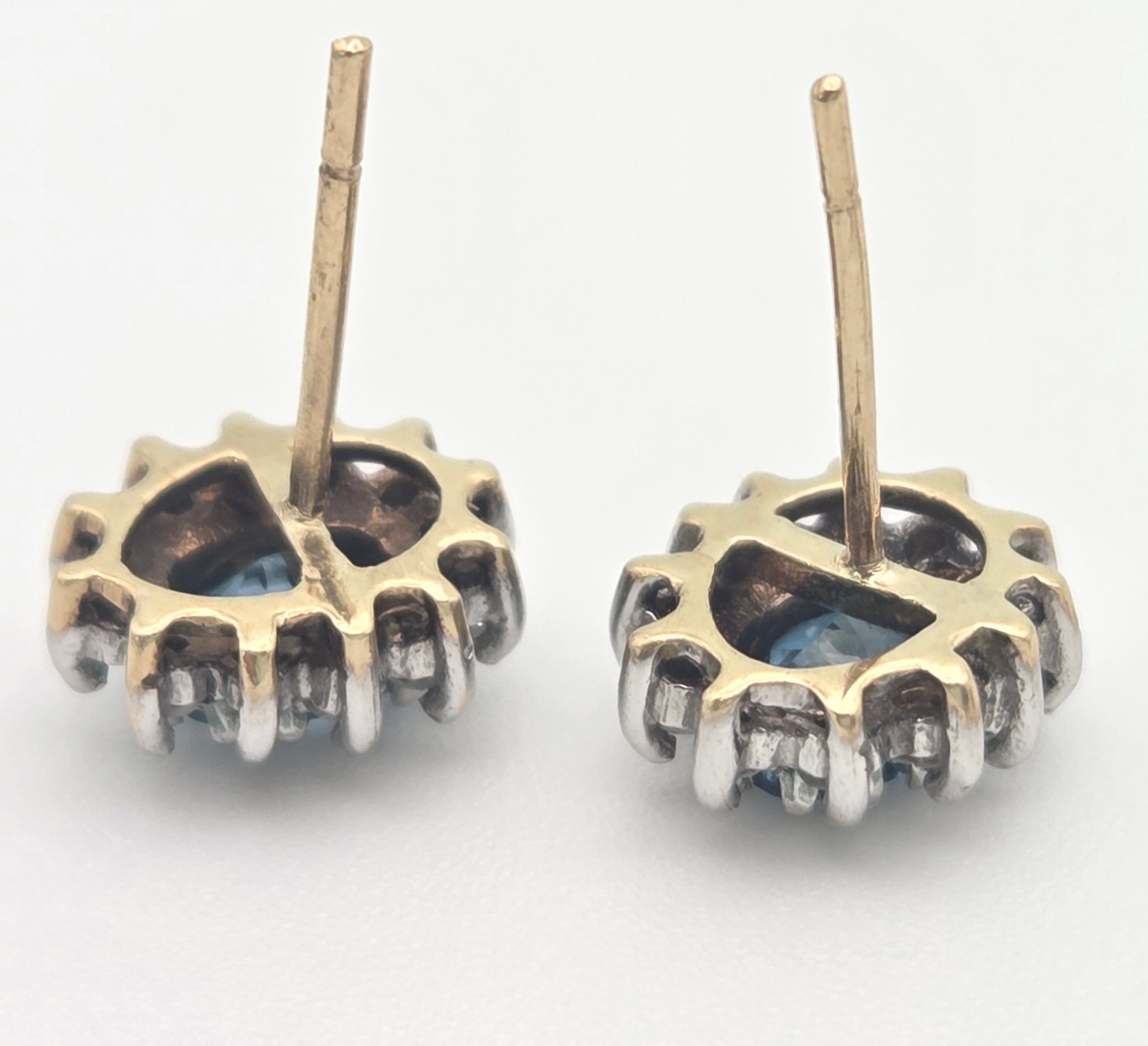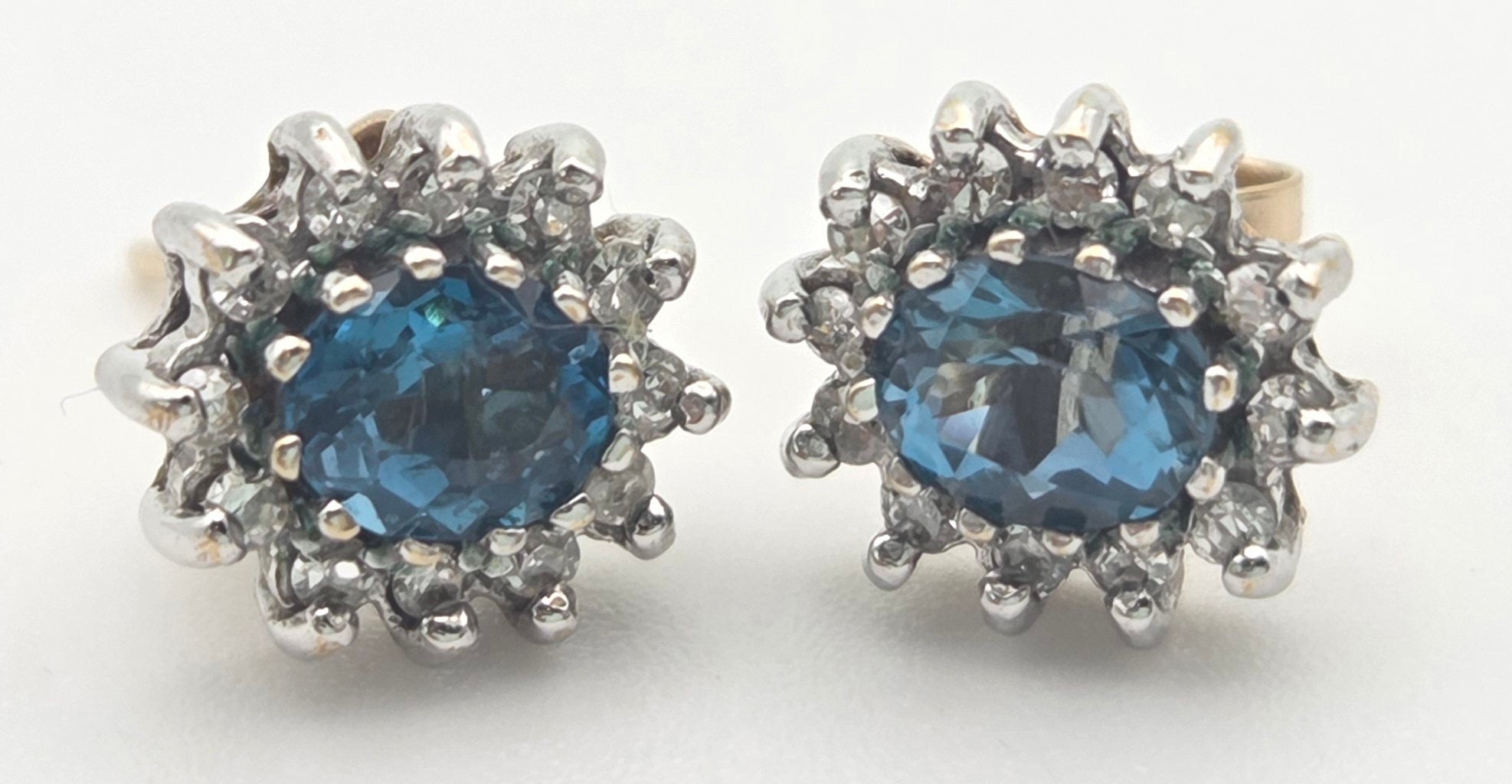 2260 Vintage: 9ct Gold Blue Topaz 24 Natural Diamonds Stud Earrings