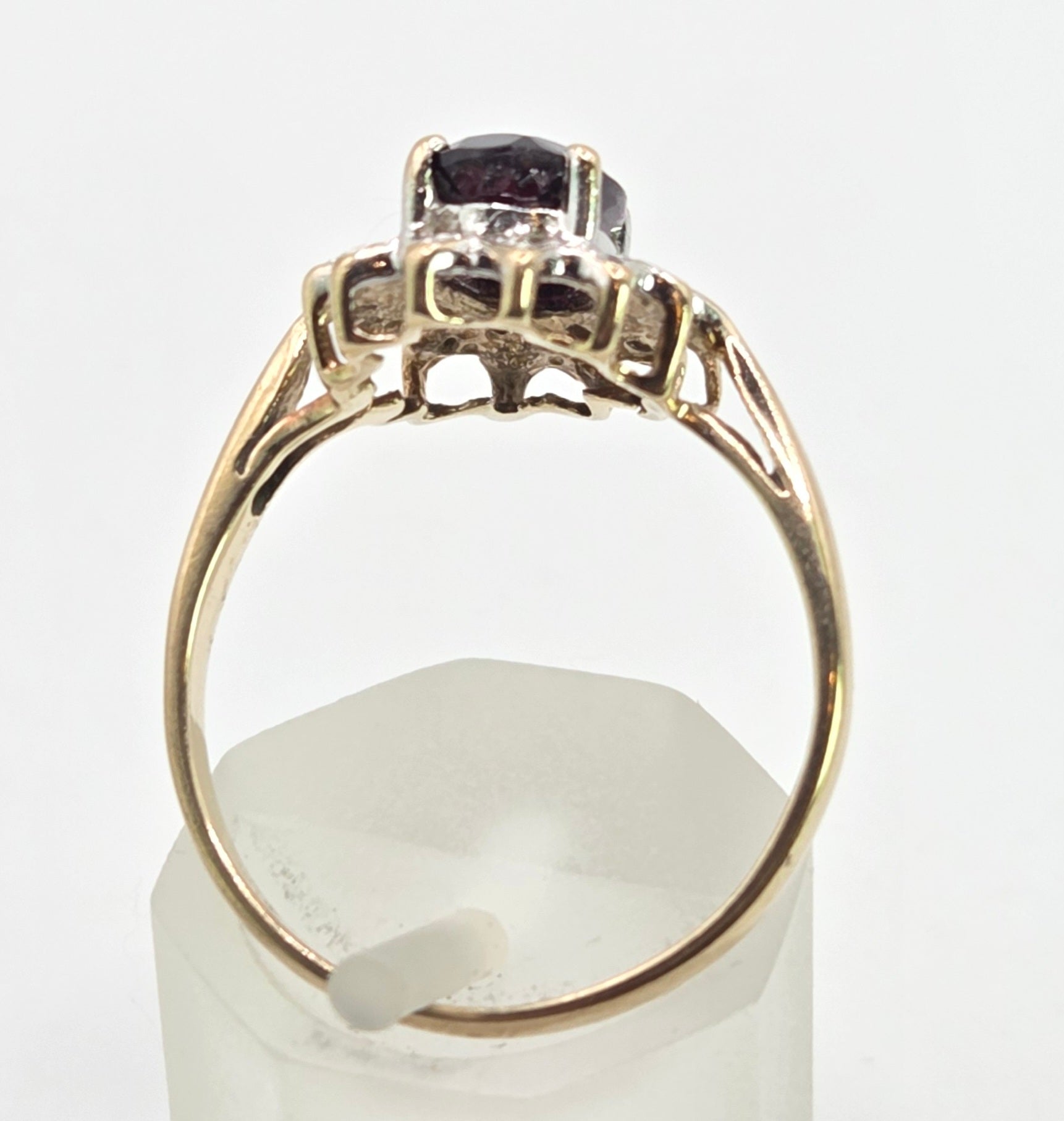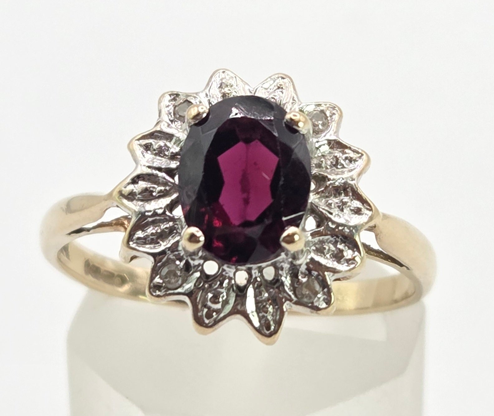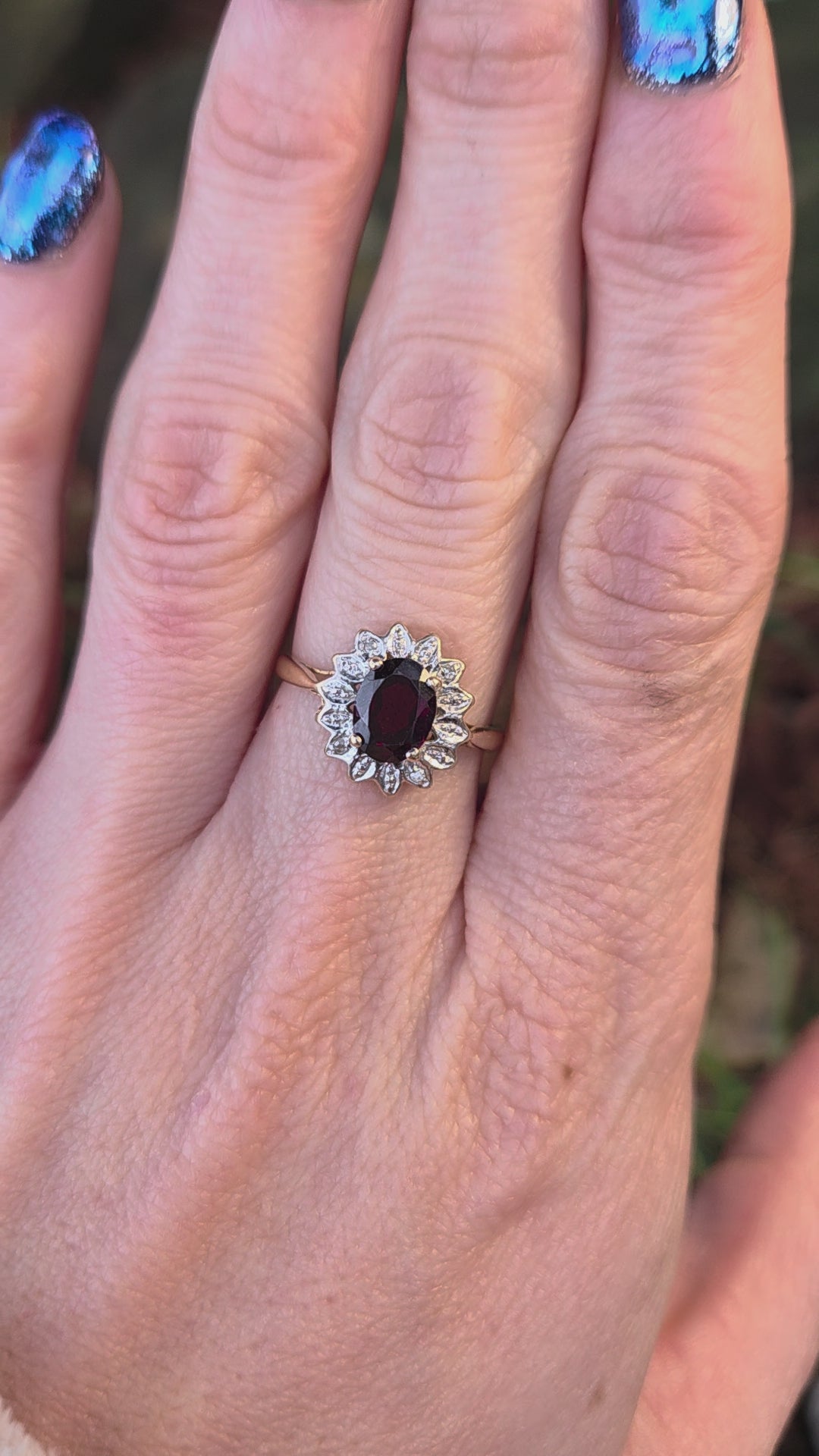 2566: Vintage 9ct Gold Red Garnet Diamonds Flower Head Ring