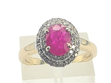 1073: Vintage: 18ct Gold Ruby 14 Diamonds Cluster Ring-lovely sparkle