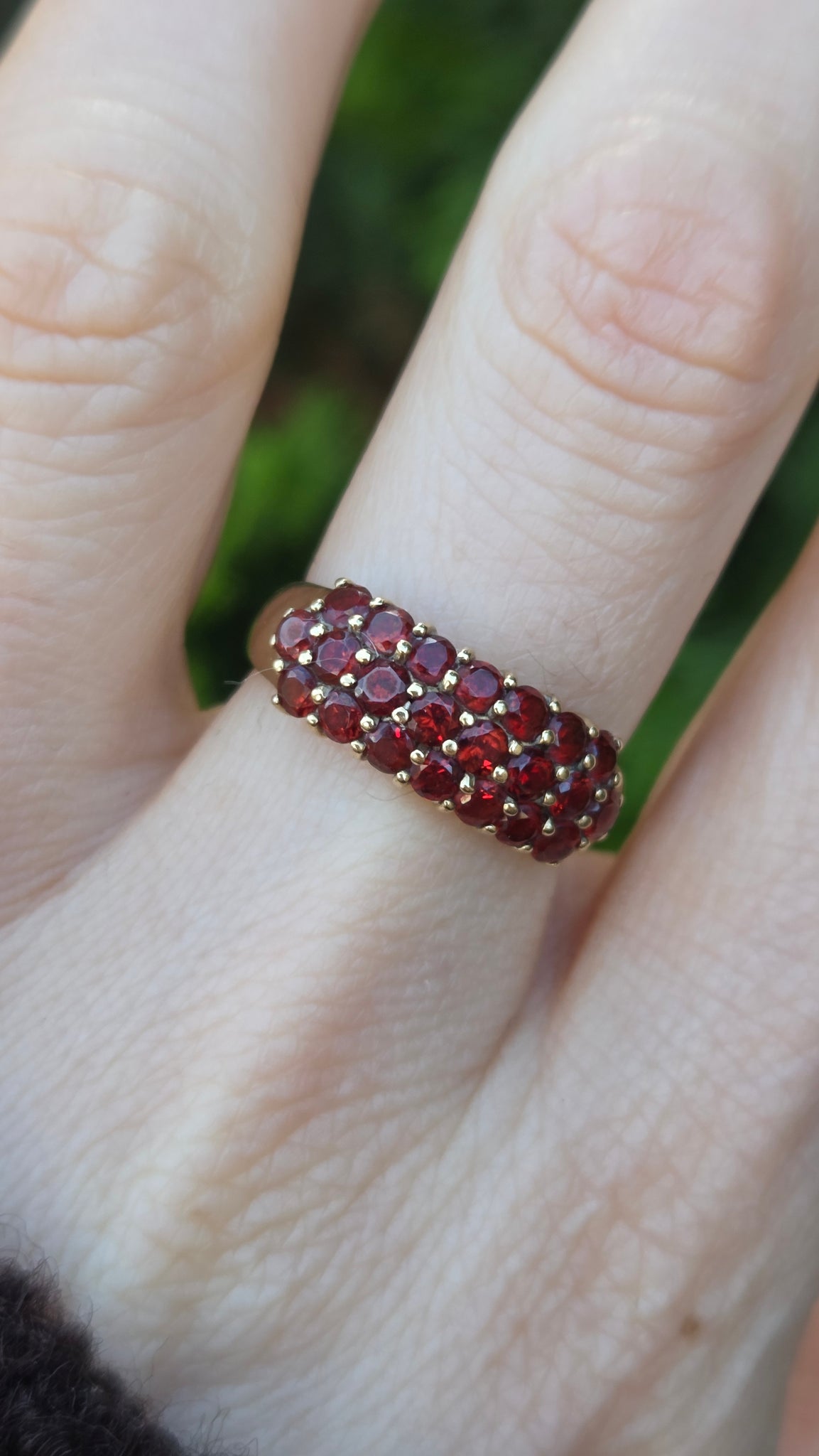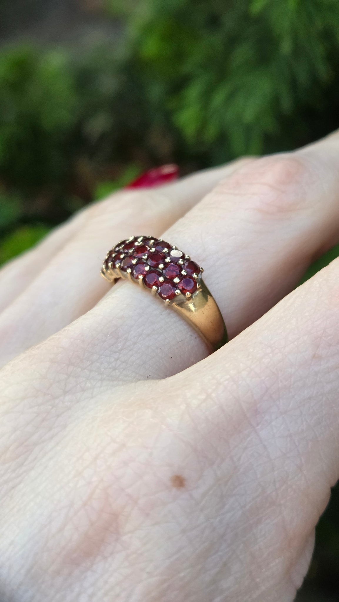 Vintage: 9ct Gold 20 Garnets Tiered Dress Ring- Vibrant red Garnets
