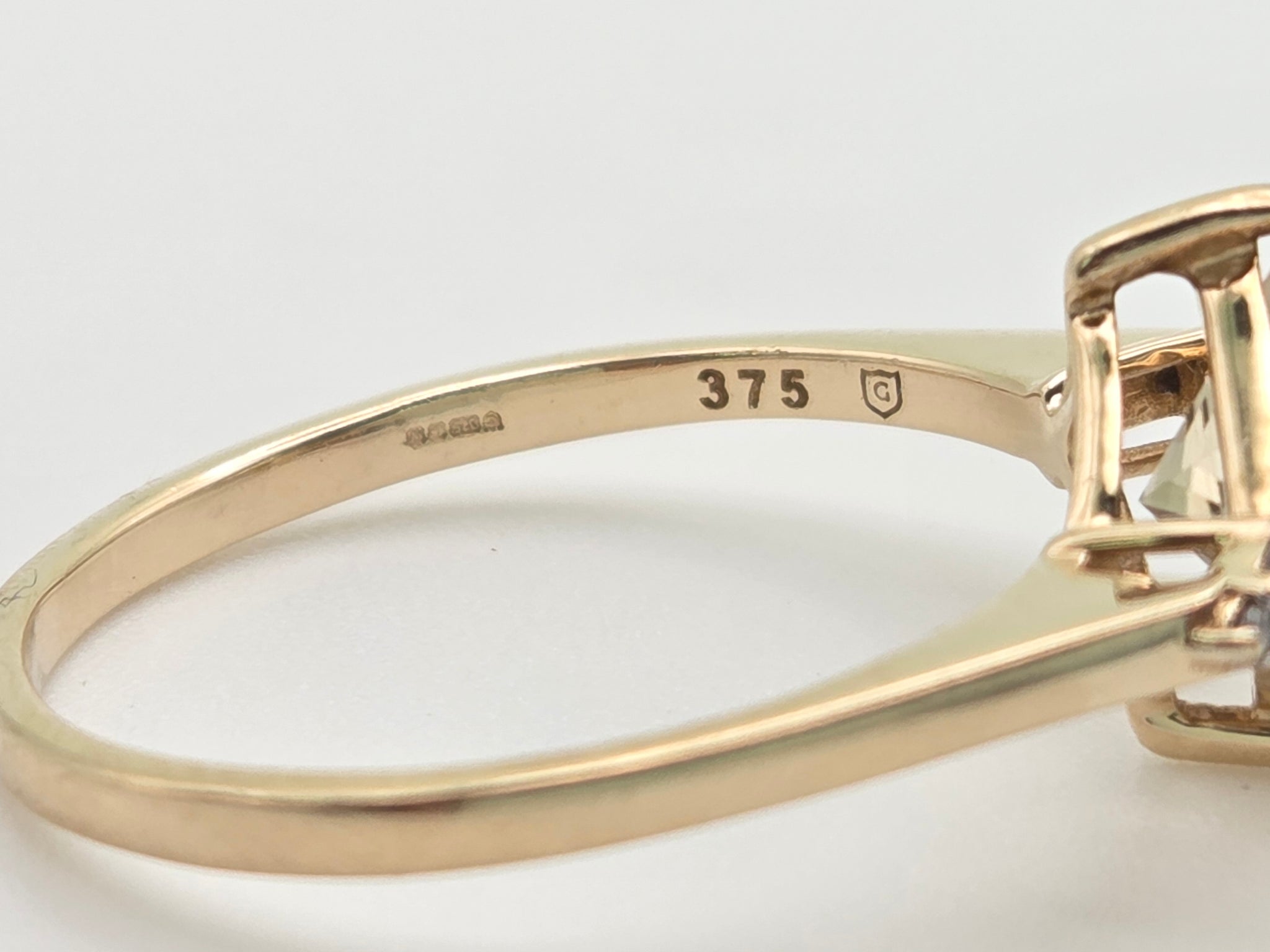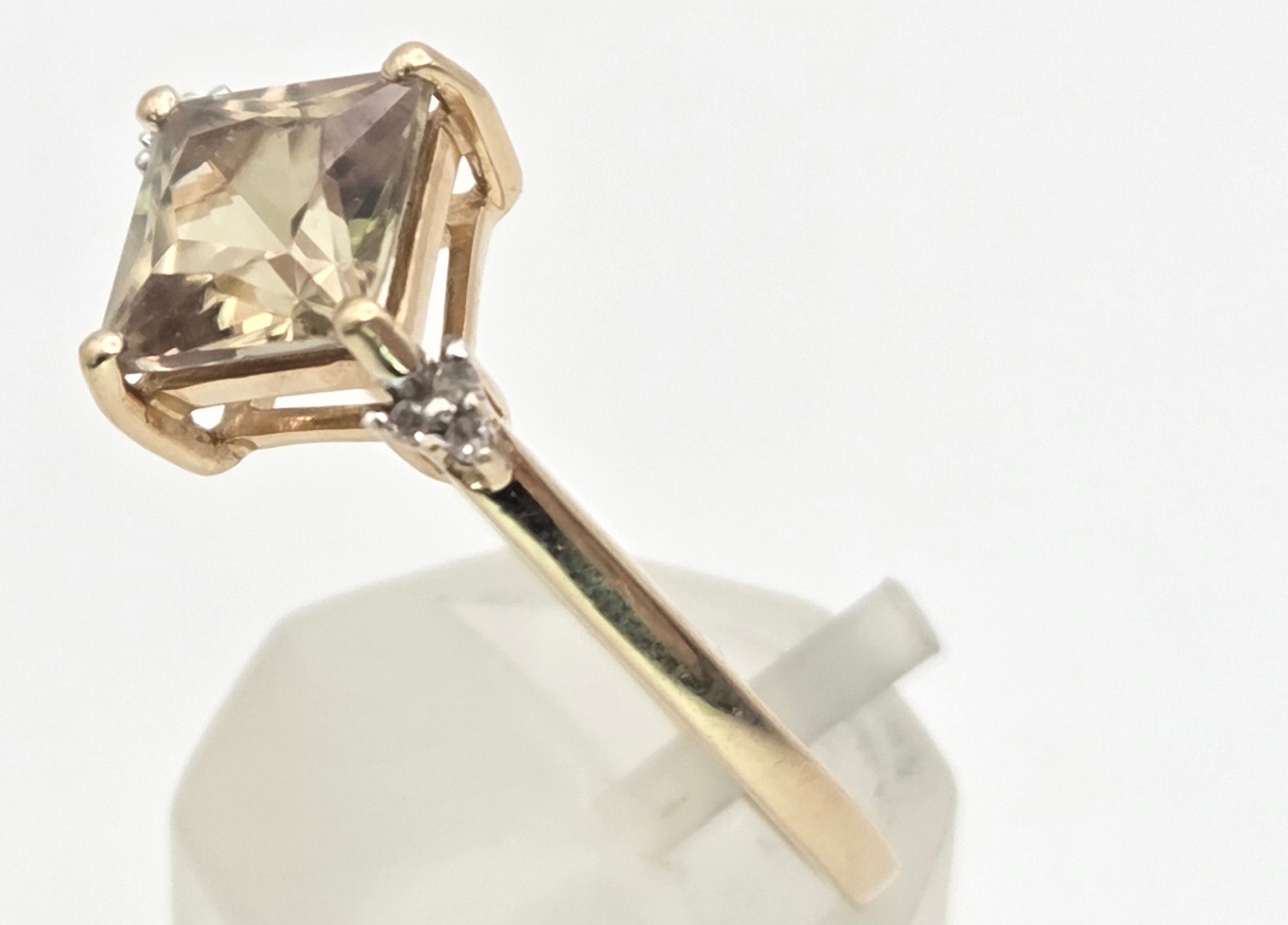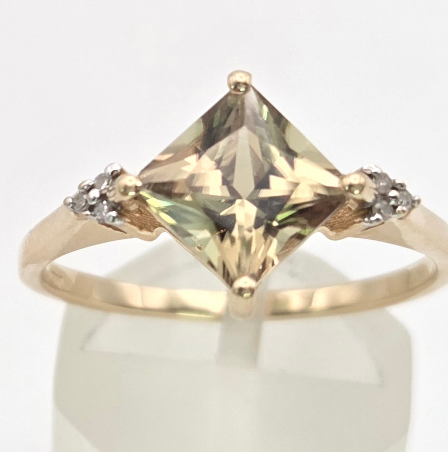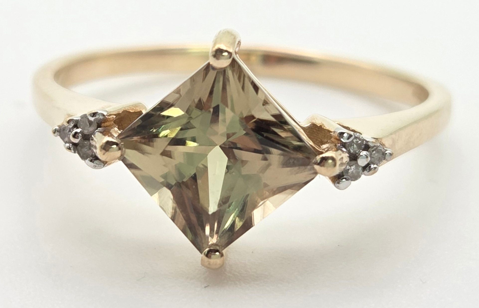 2223 Vintage: 9ct Gold Square Cut Peridot 6 Natural Diamonds Dress Ring