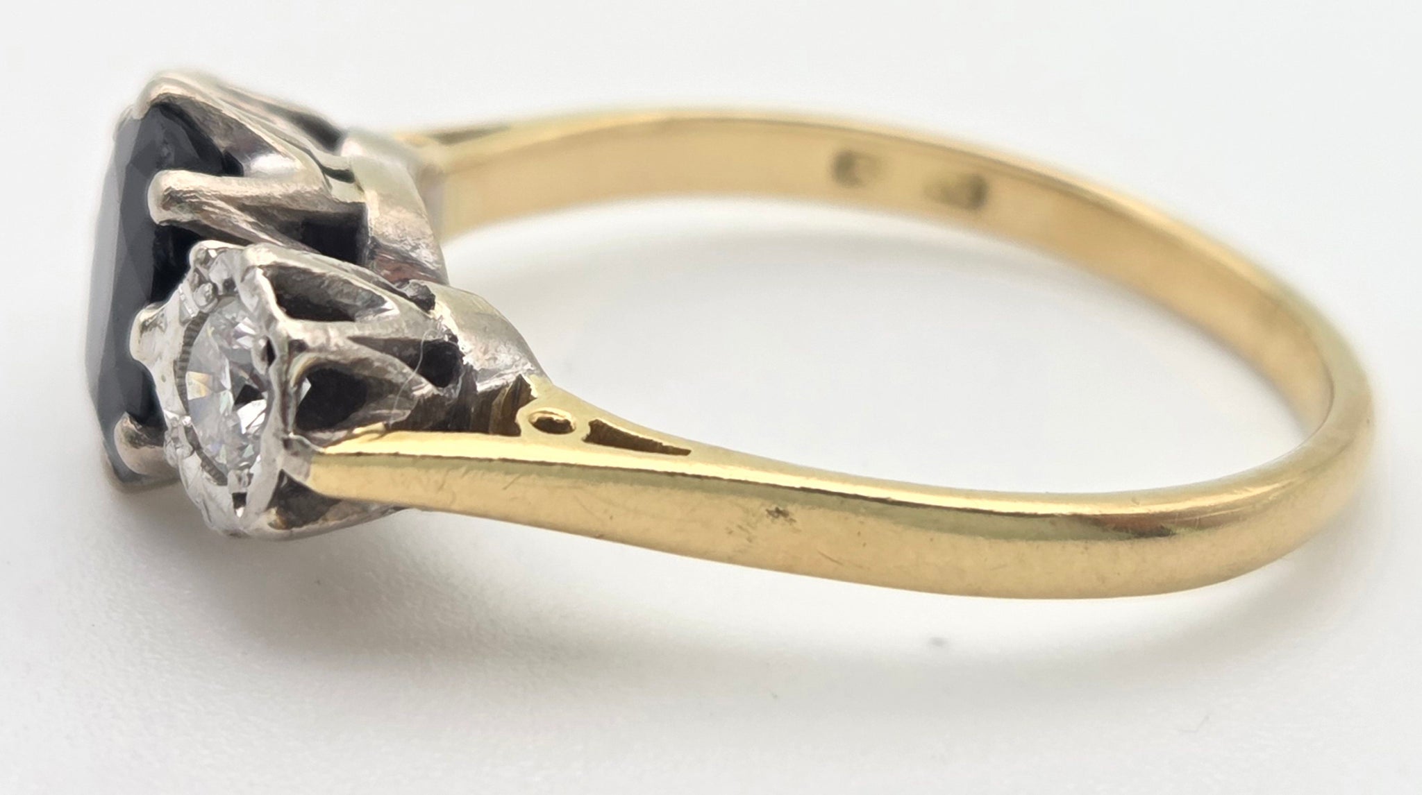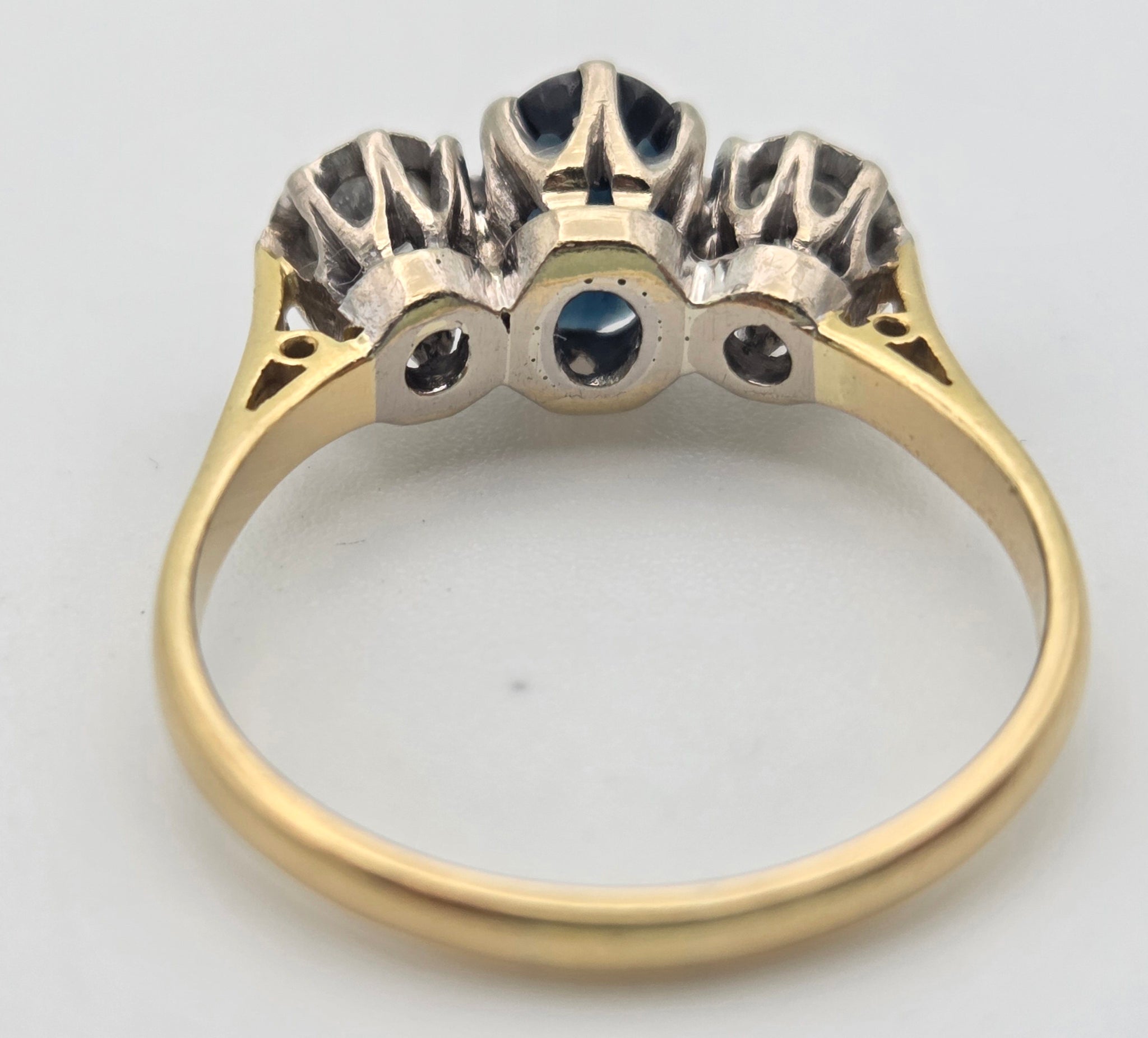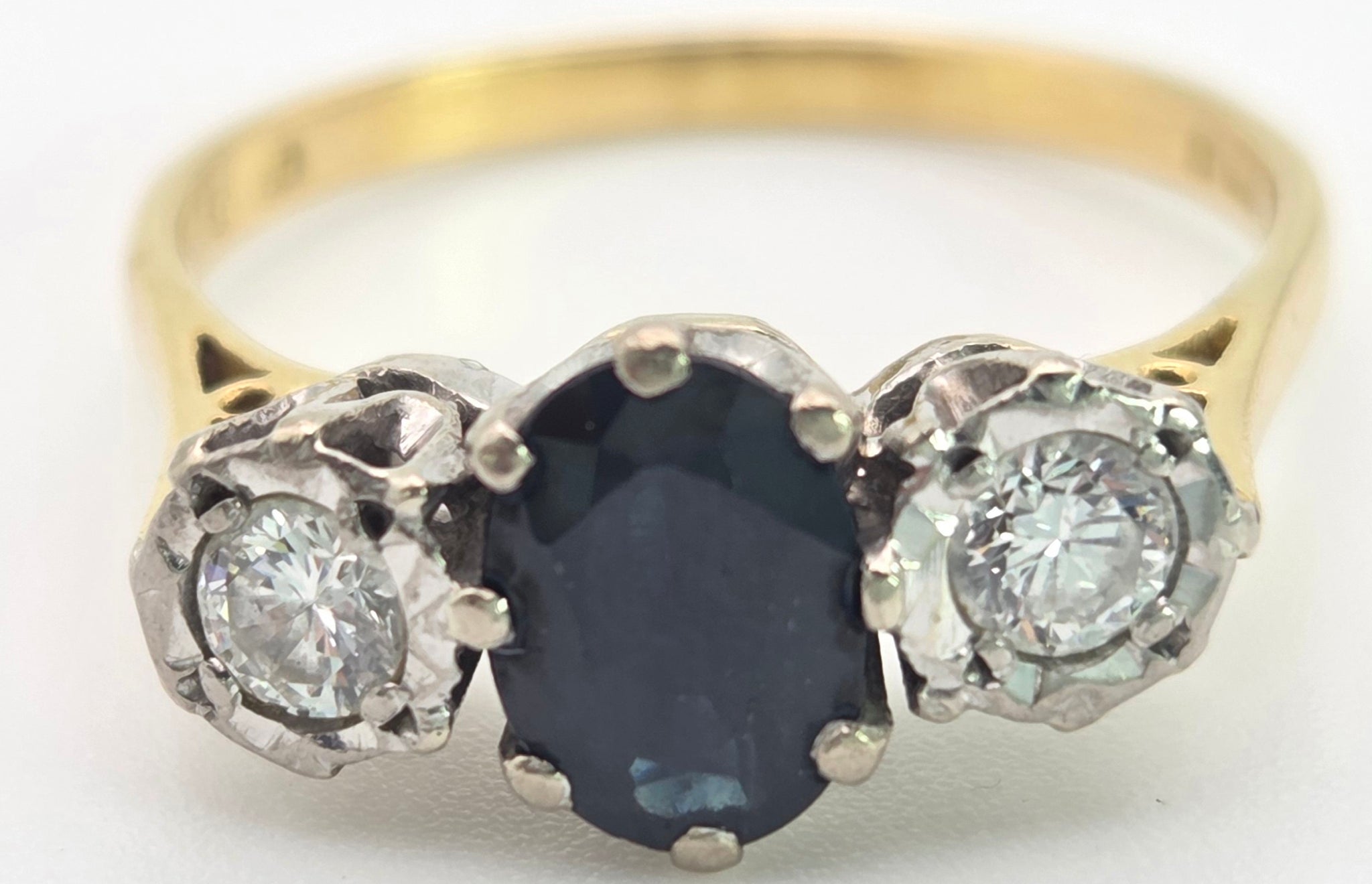 2369 18ct Gold Australian Blue Sapphire (1.08ct) Diamonds (0.34ct) 3- Stone Ring