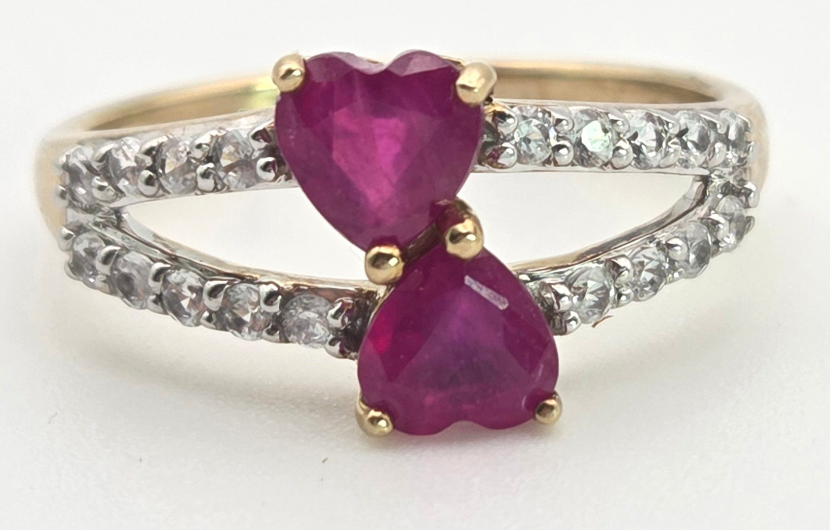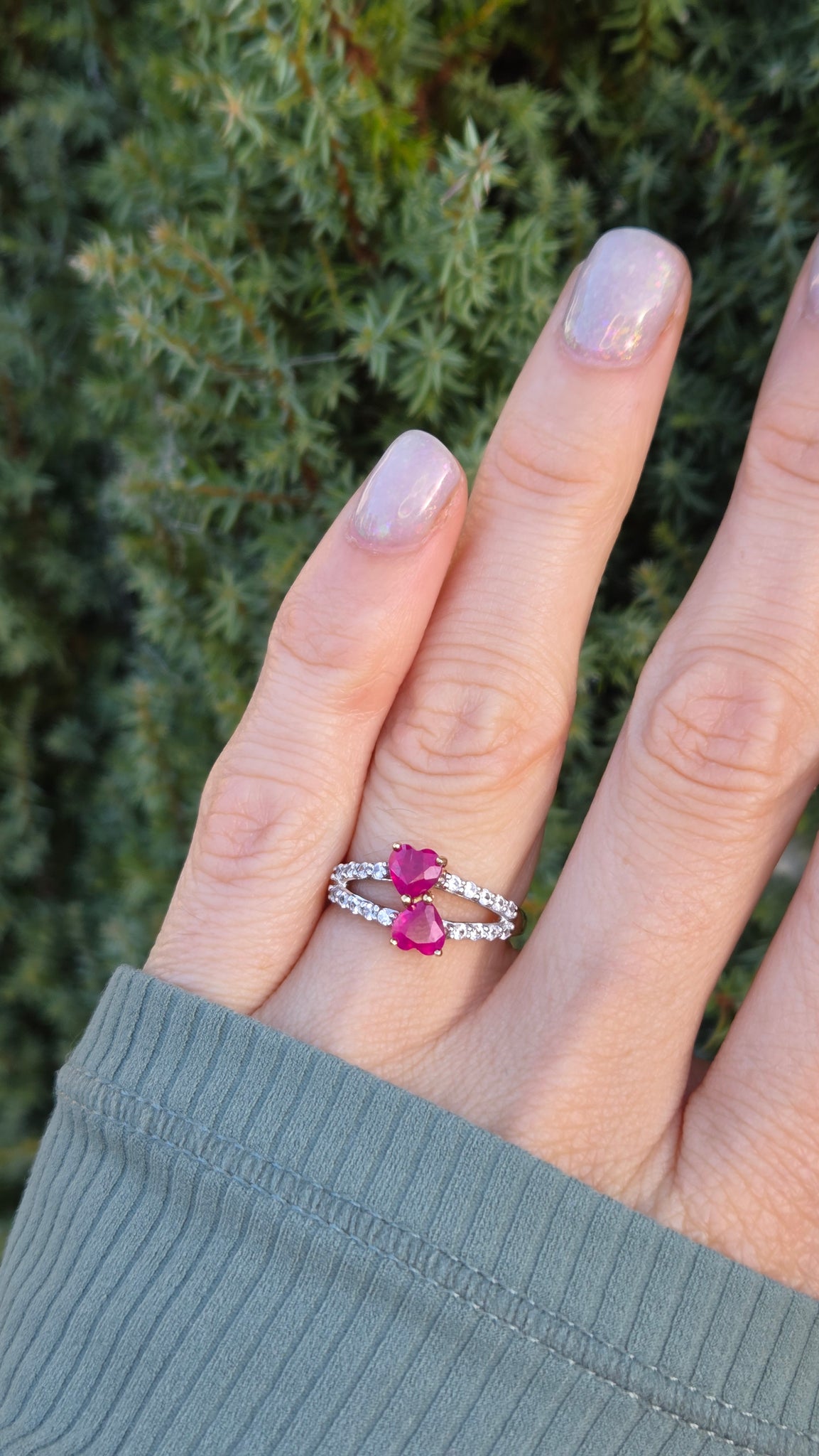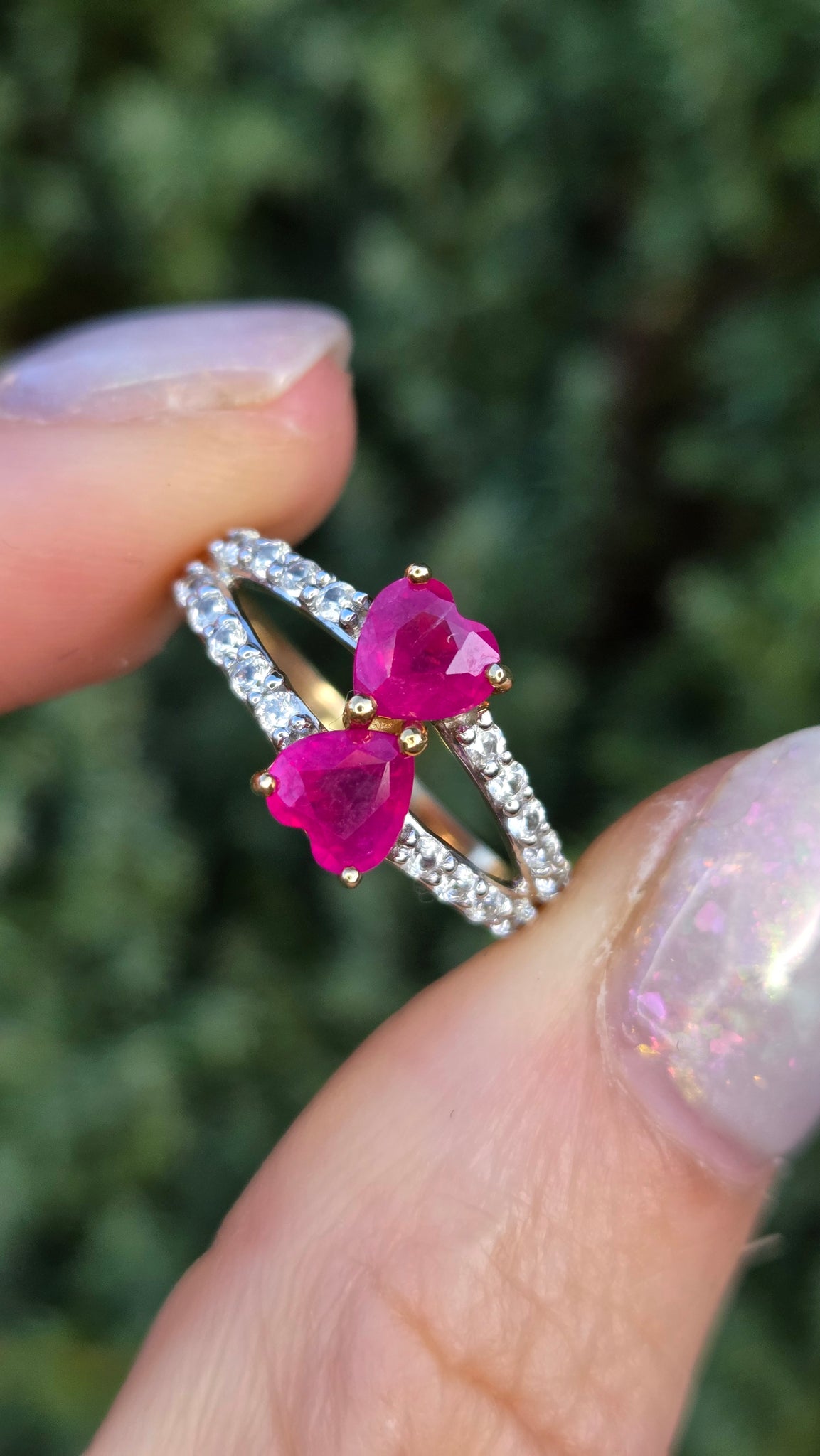 Charming with beautifully cut rubies and sparkling glacier topaz. "Two hearts are better than one"