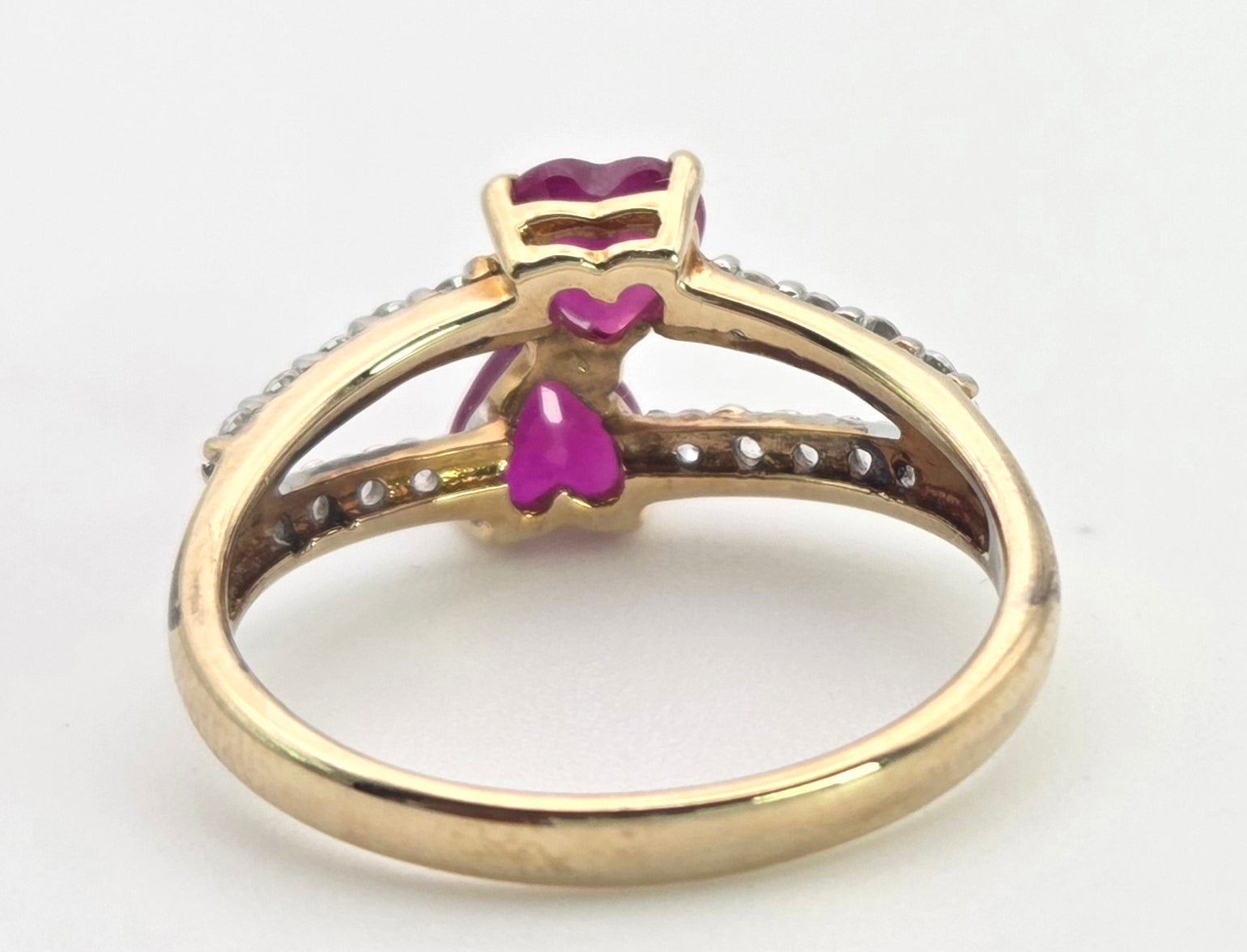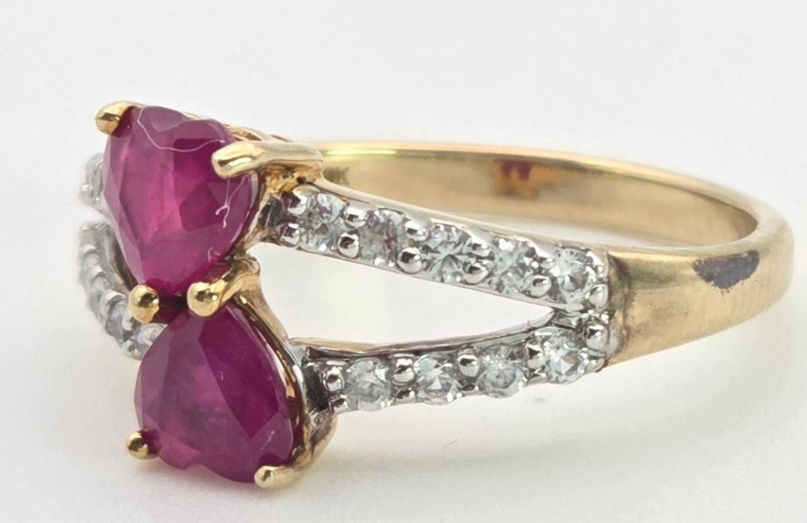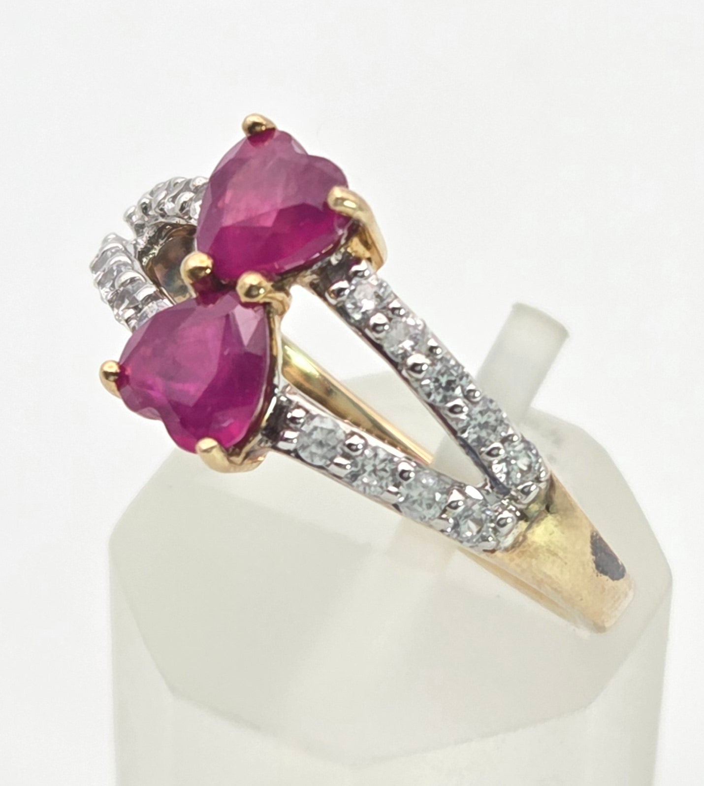 Charming with beautifully cut rubies and sparkling glacier topaz. "Two hearts are better than one"
